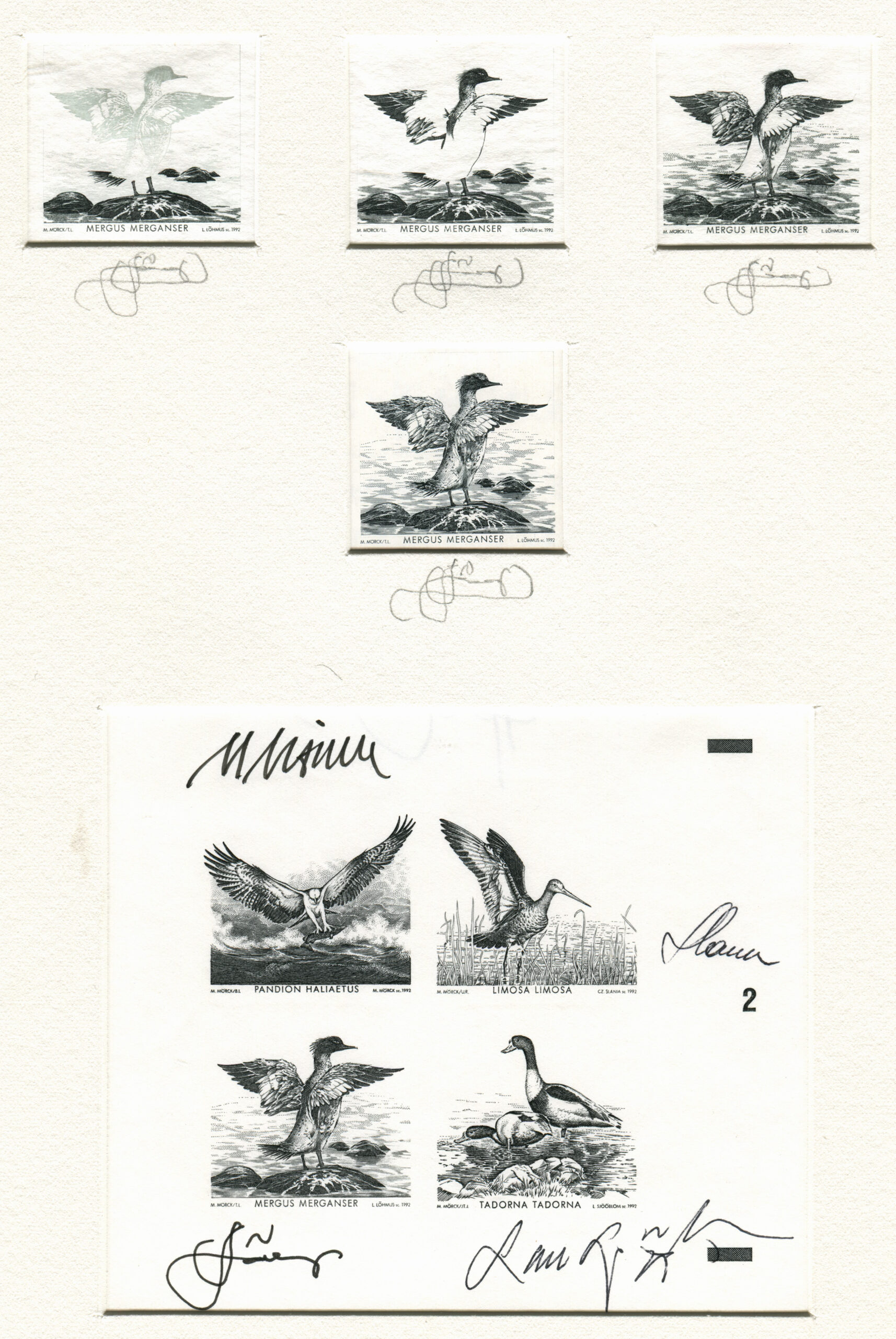 ERMi koguNeli ülemist joonistust on „Jääkoskla“ margikavandi tööetapid. Alumisel nelikul on margikavandid kunstniku signatuuriga („Kalakotkas“, kunstnik Martin Mörck; „Mustsaba-vigle“, kunstnik Czeslaw Slania; „Jääkoskel“, kunstnik Lembit Lõhmus; „Ristpart“, kunstnik Lars Sjööblom).
