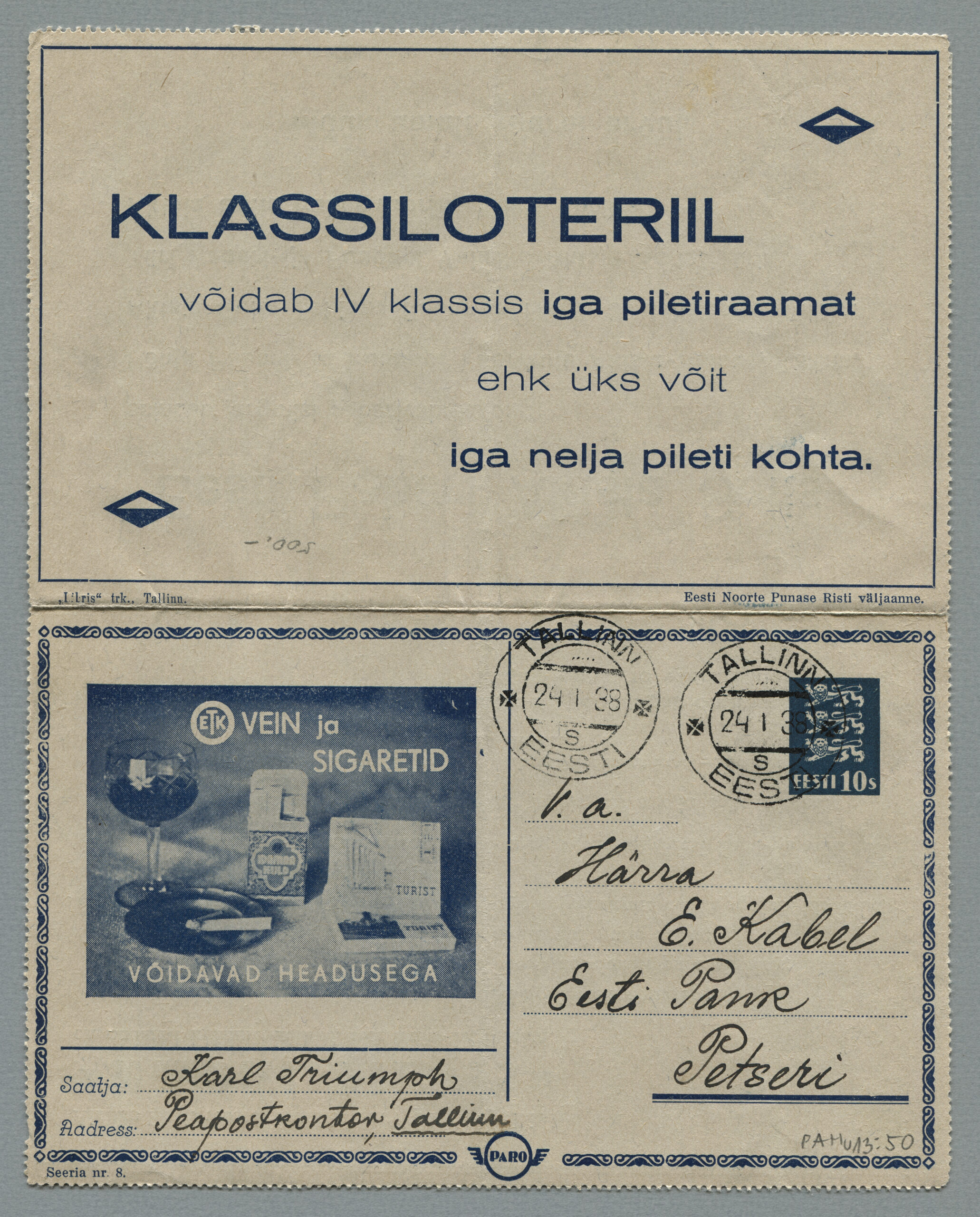 ERMi koguKaartkiri (seeria nr 8), mis on saadetud 24.01.1938 Tallinnast Petserisse