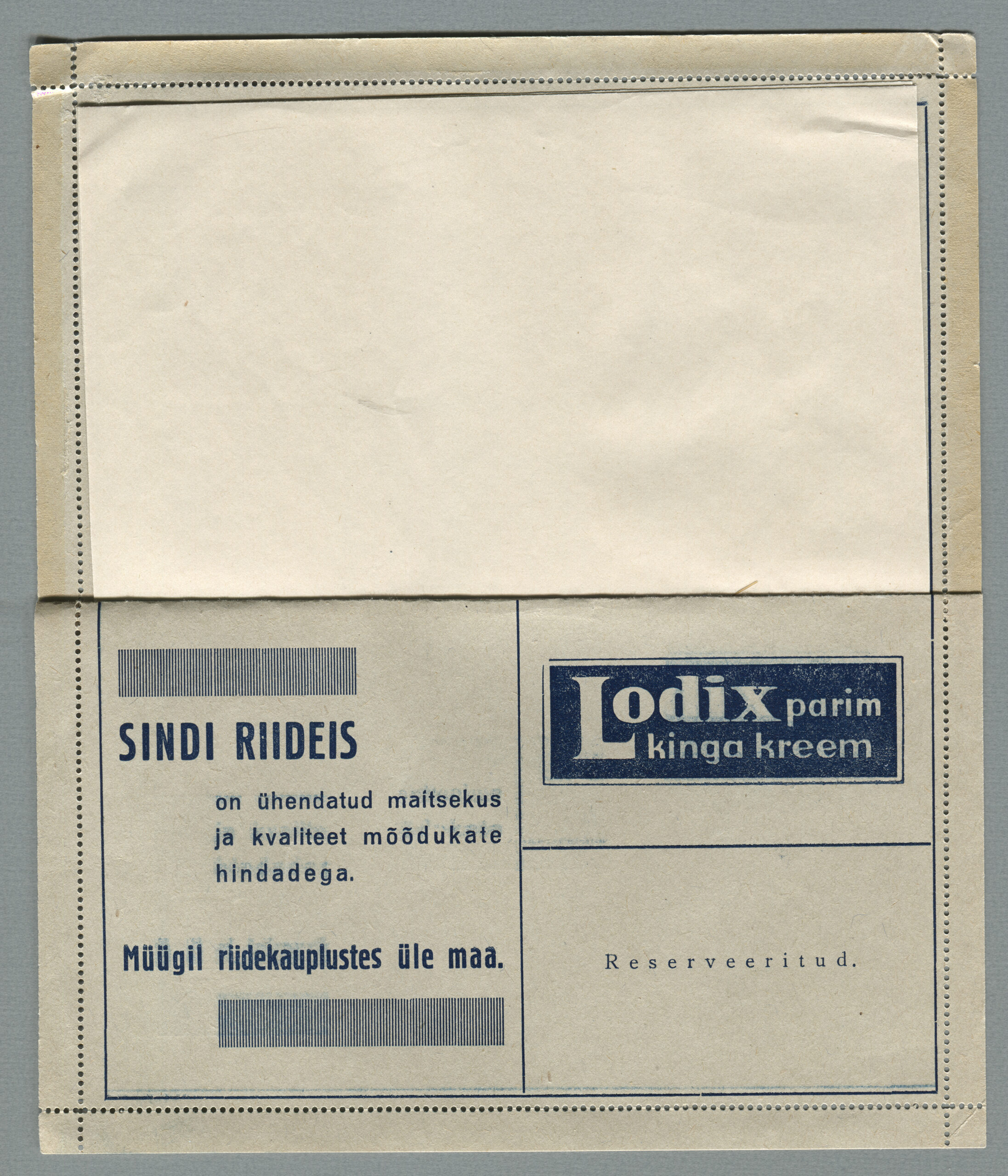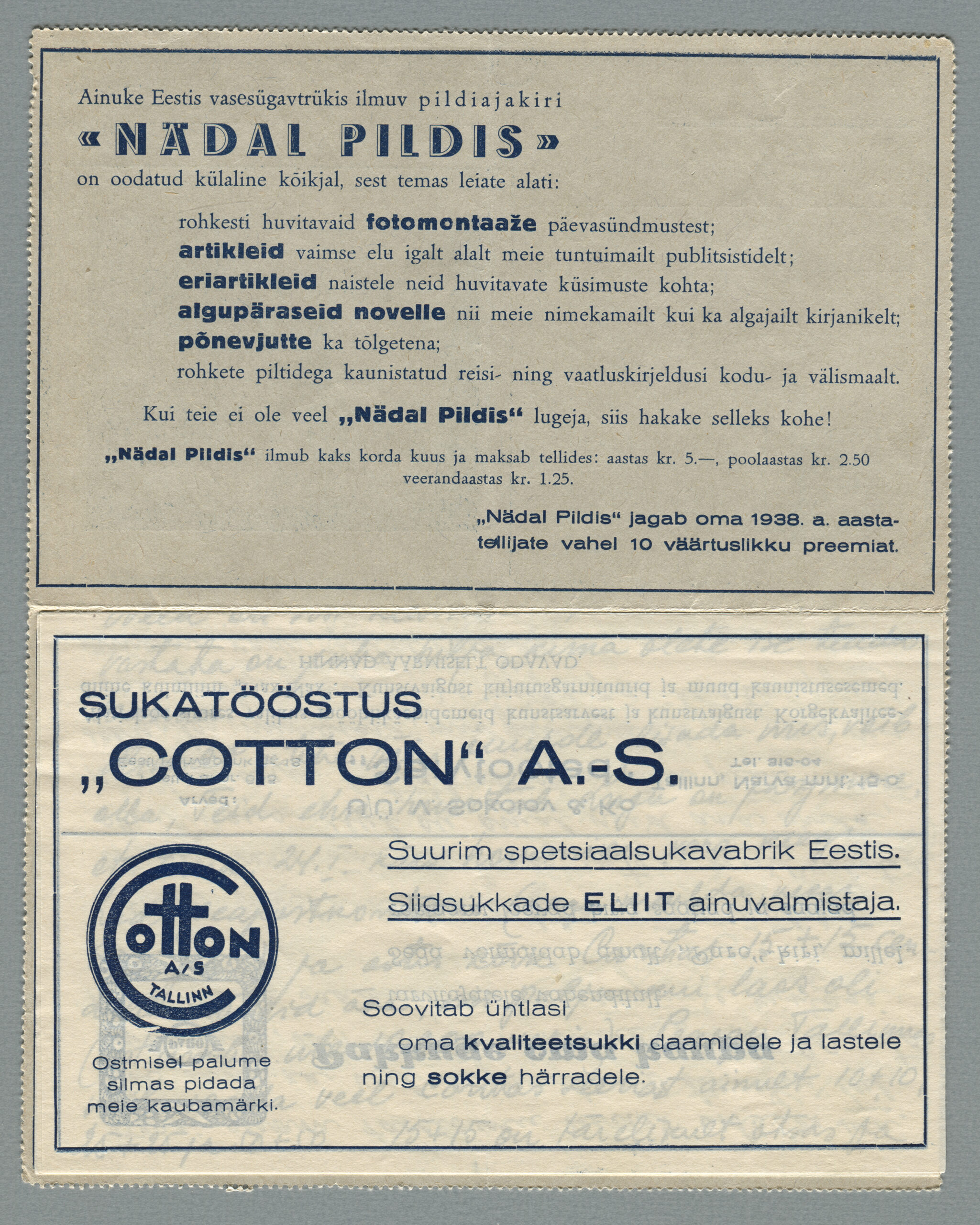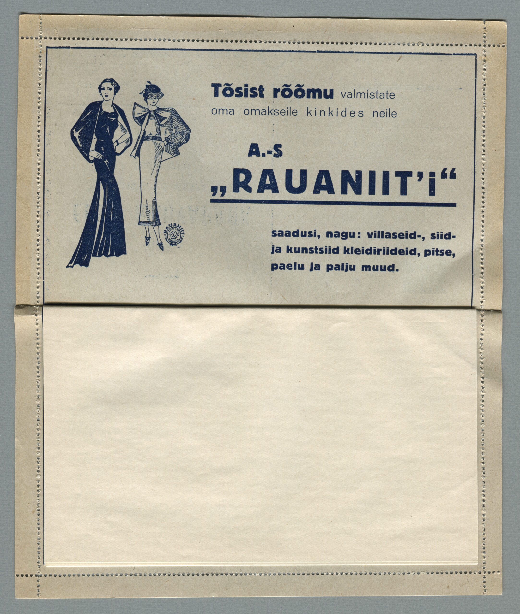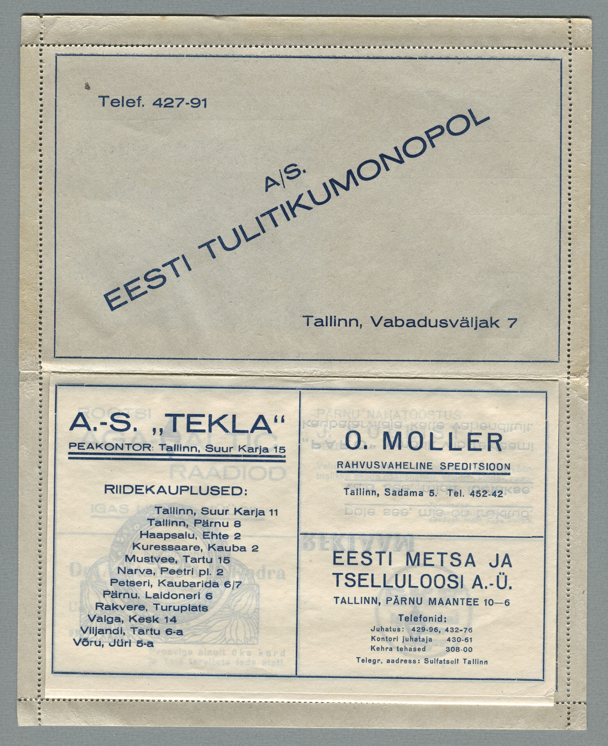Ideena polnud reklaamiga varustatud tervikasjad tegelikult midagi uut. On teada, et neid esines Tsaari-Venemaal, ka mujal. Mõnel kaartkirja seerial (nr 2, 5, 6, 18) on märgitud Pat. Berne 6538/37, millest võib järeldada, et idee oli patenteeritud.