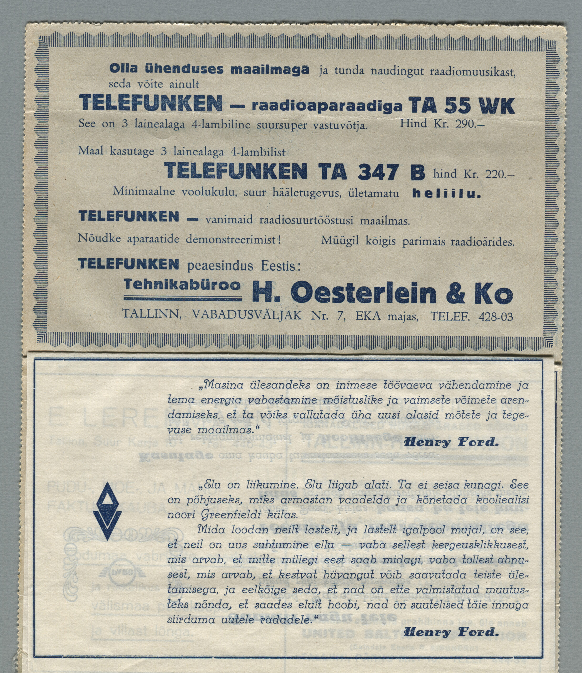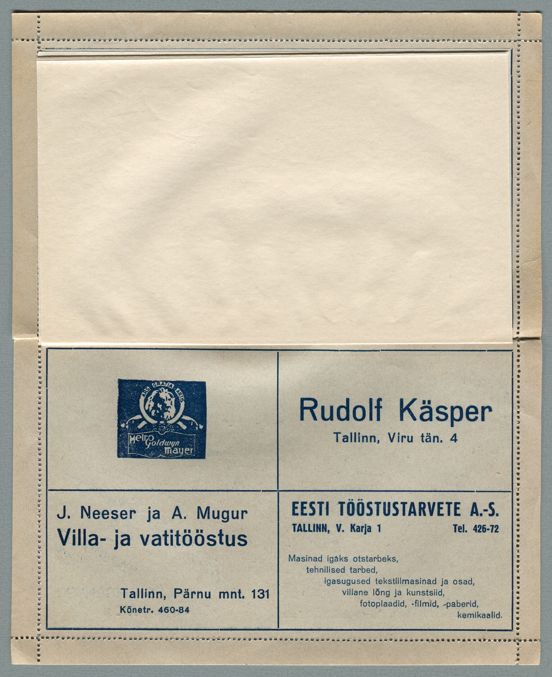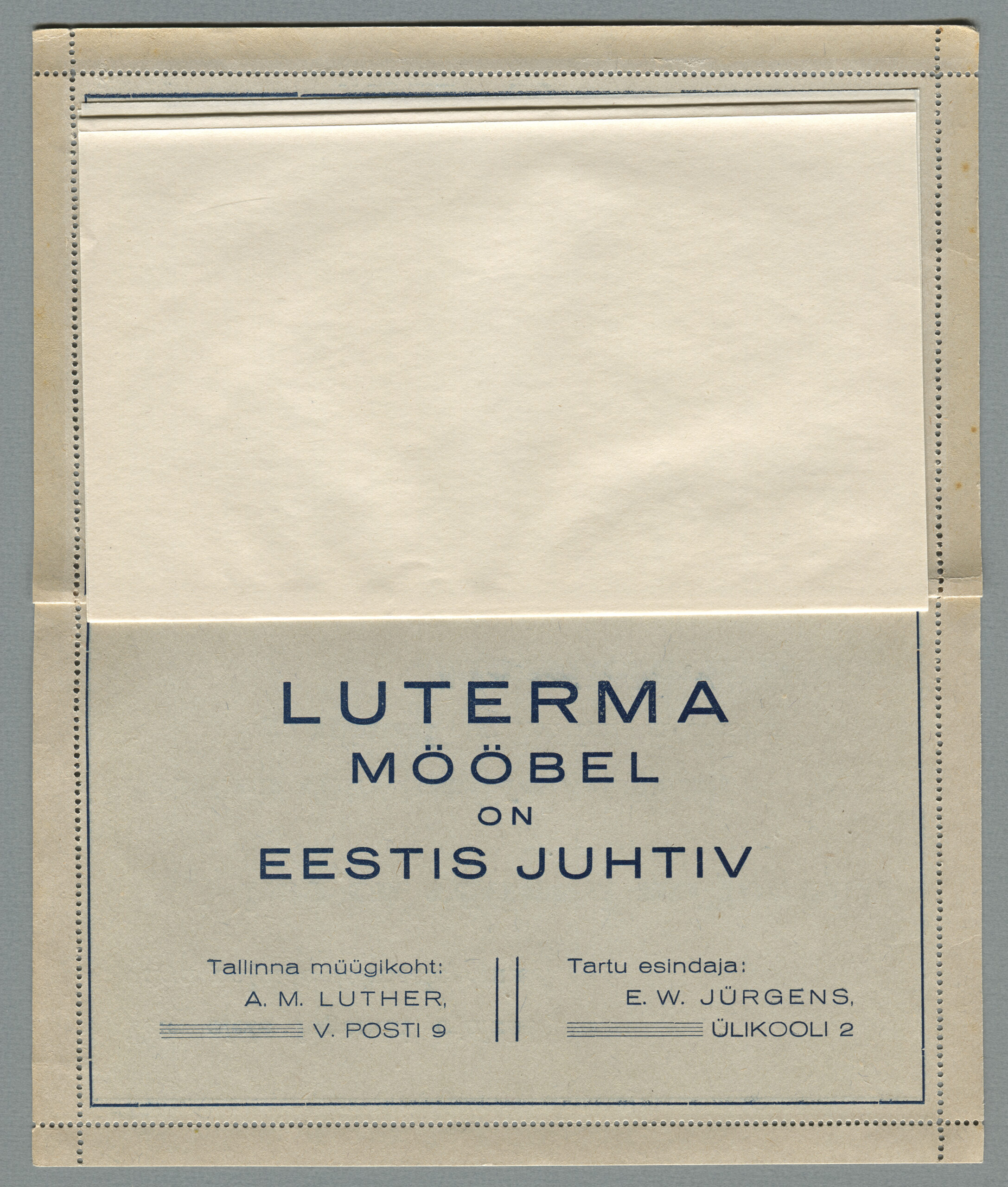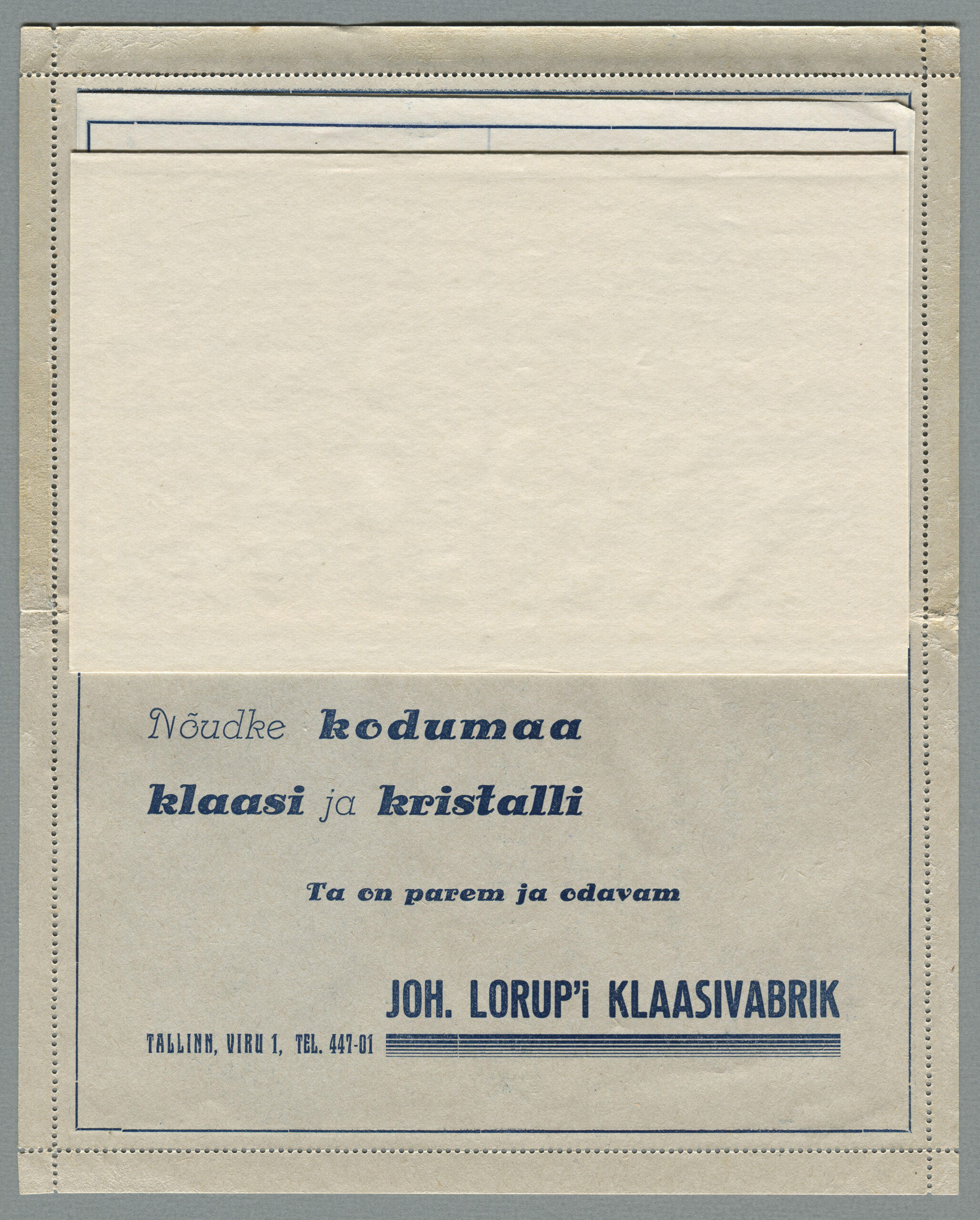 Ideena polnud reklaamiga varustatud tervikasjad tegelikult midagi uut. On teada, et neid esines Tsaari-Venemaal, ka mujal. Mõnel kaartkirja seerial (nr 2, 5, 6, 18) on märgitud Pat. Berne 6538/37, millest võib järeldada, et idee oli patenteeritud.