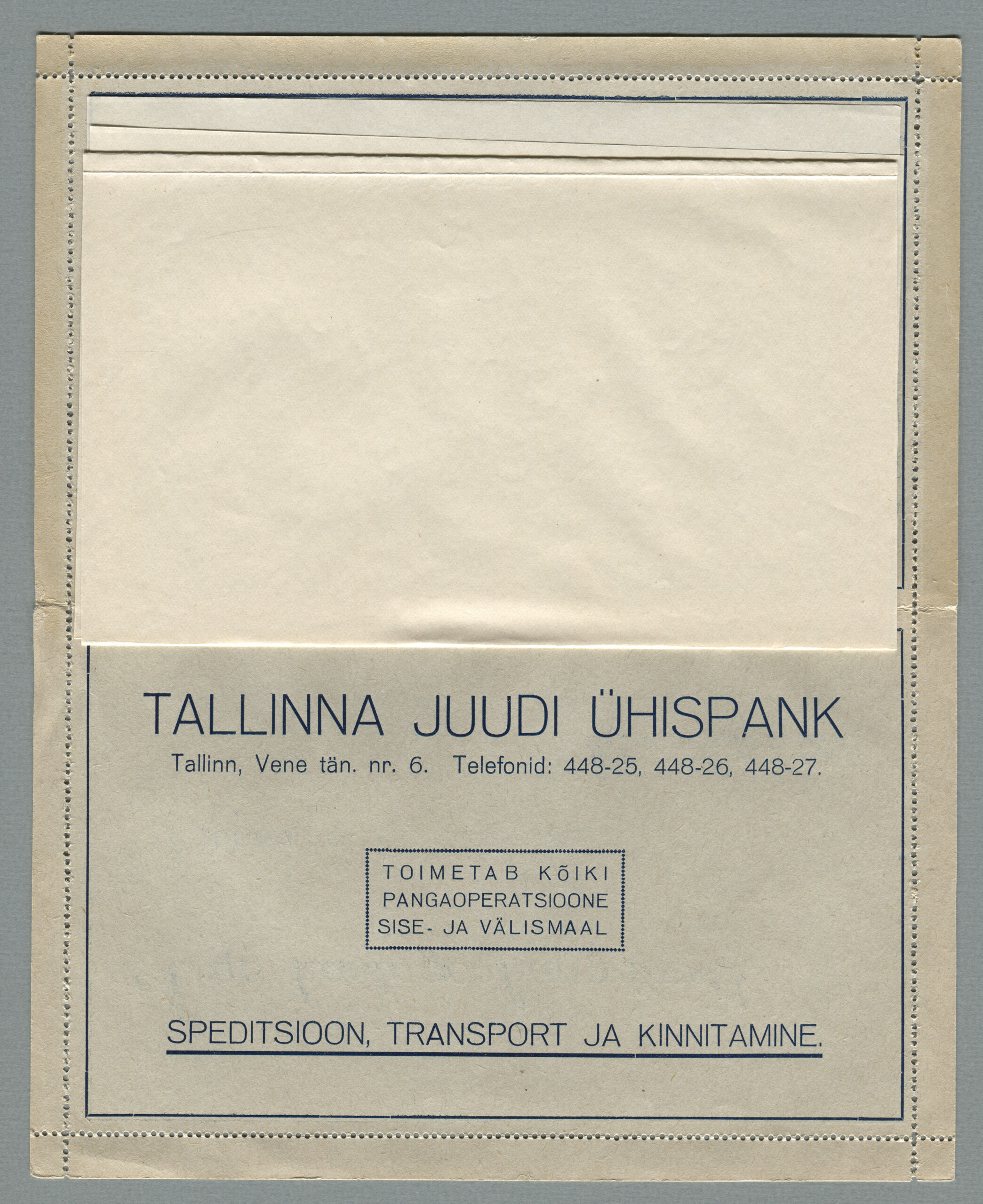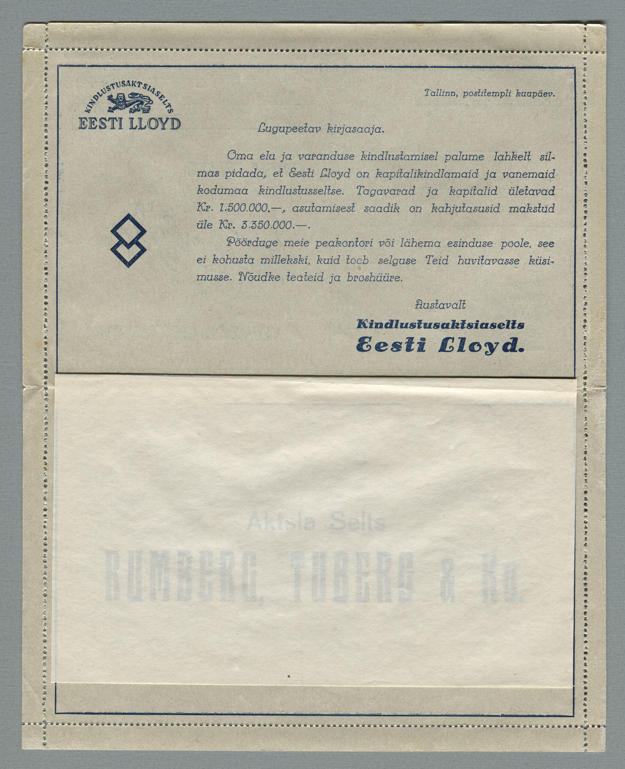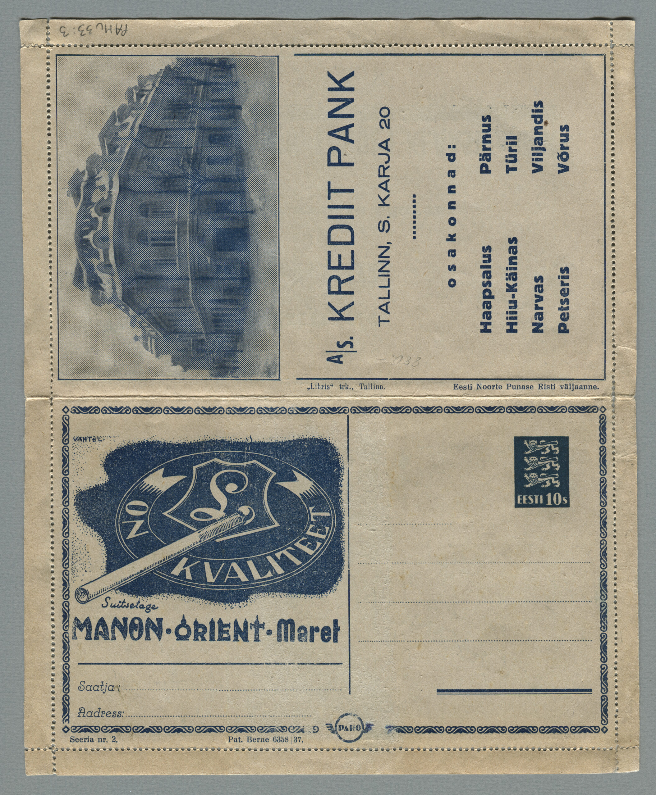 ERMi koguKaartkiri (seeria nr 2), mis on saadetud 11.10.1938 Tallinnast Helsingisse
