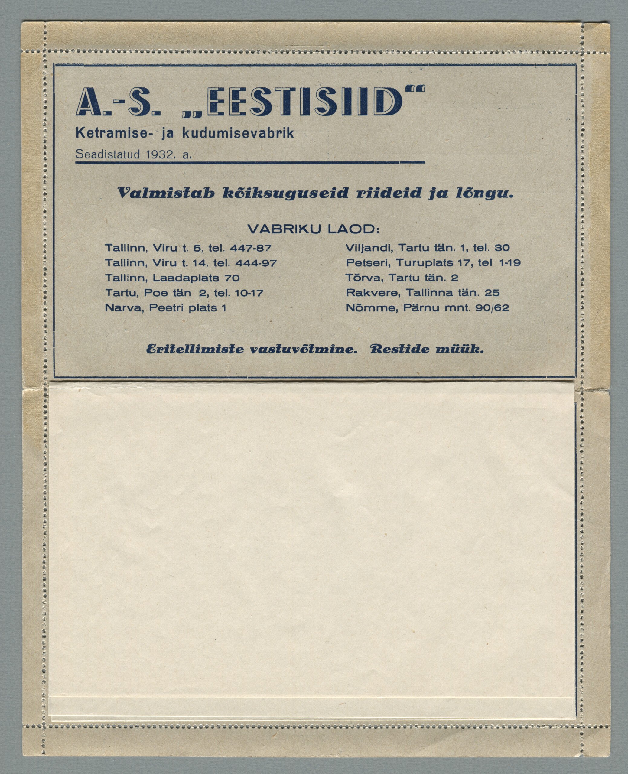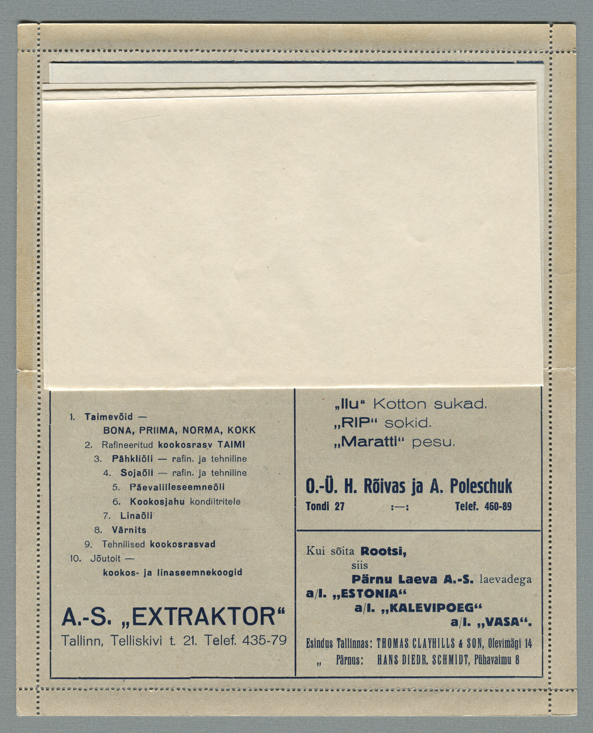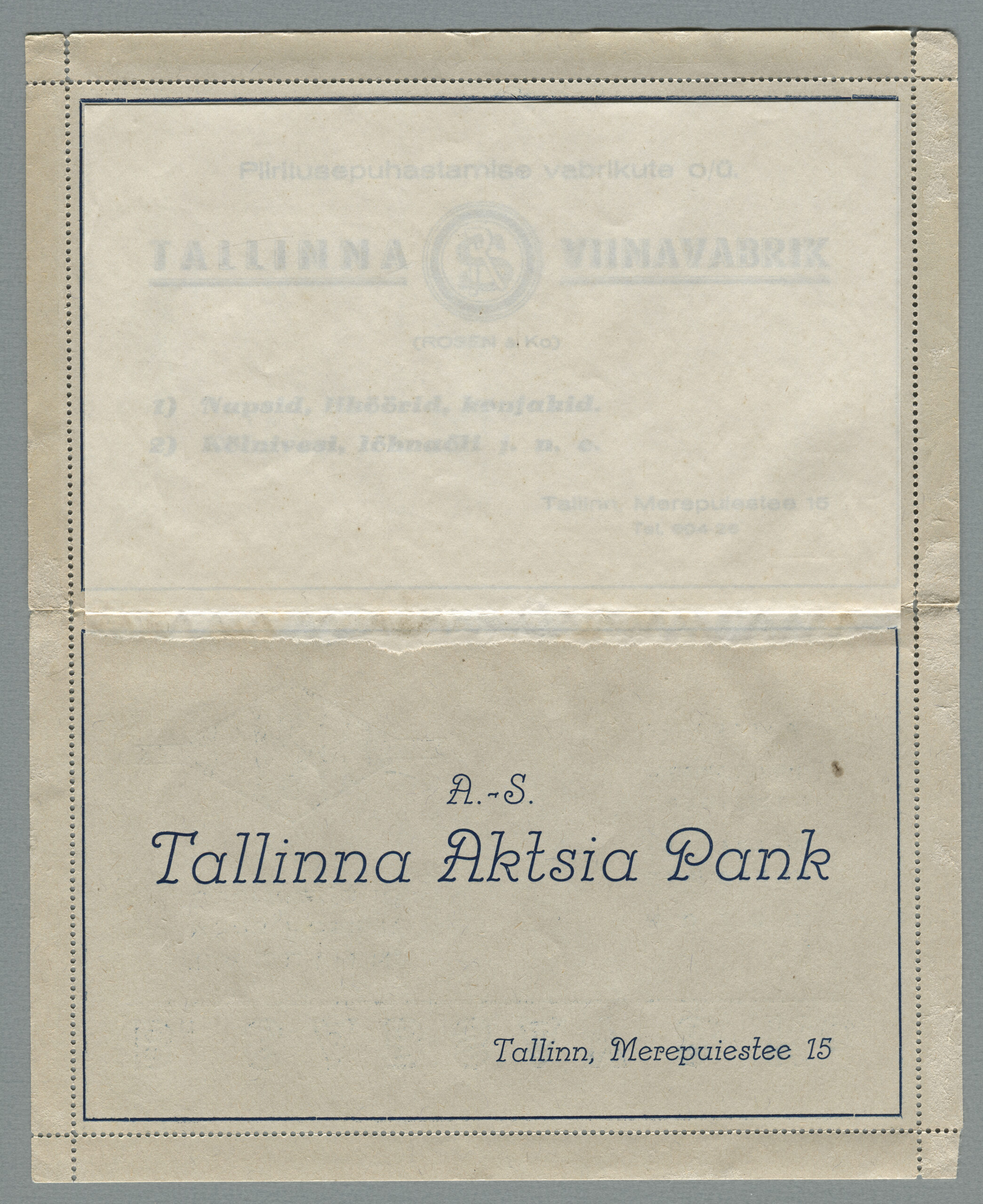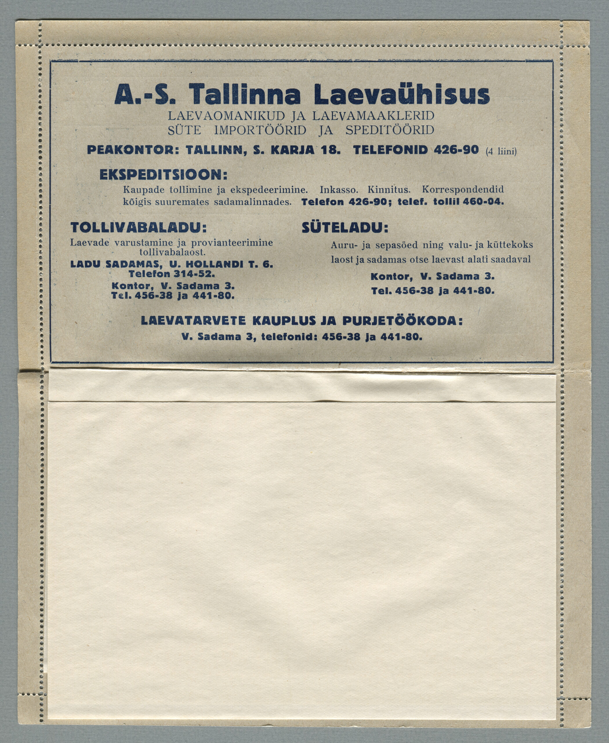 ERMi koguKaartkiri (seeria nr 2), mis on saadetud 11.10.1938 Tallinnast Helsingisse