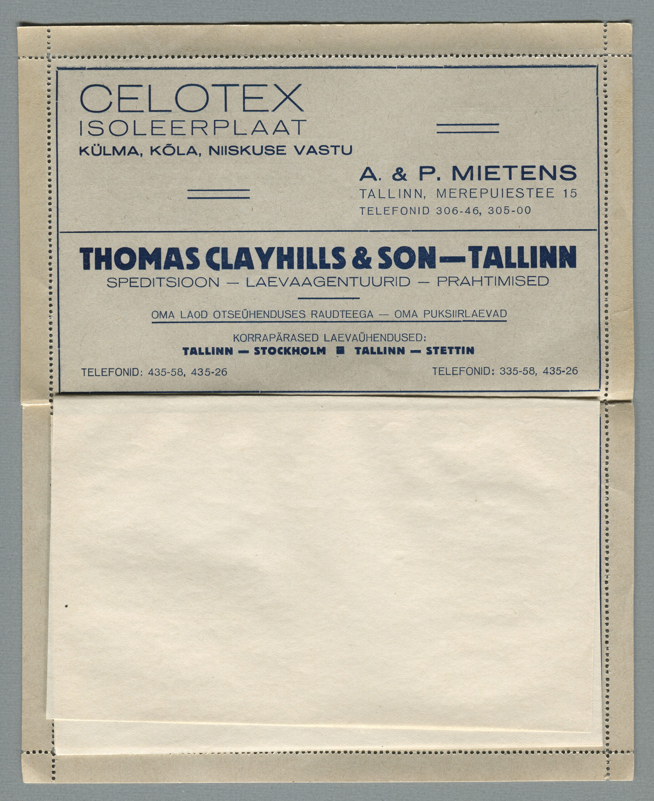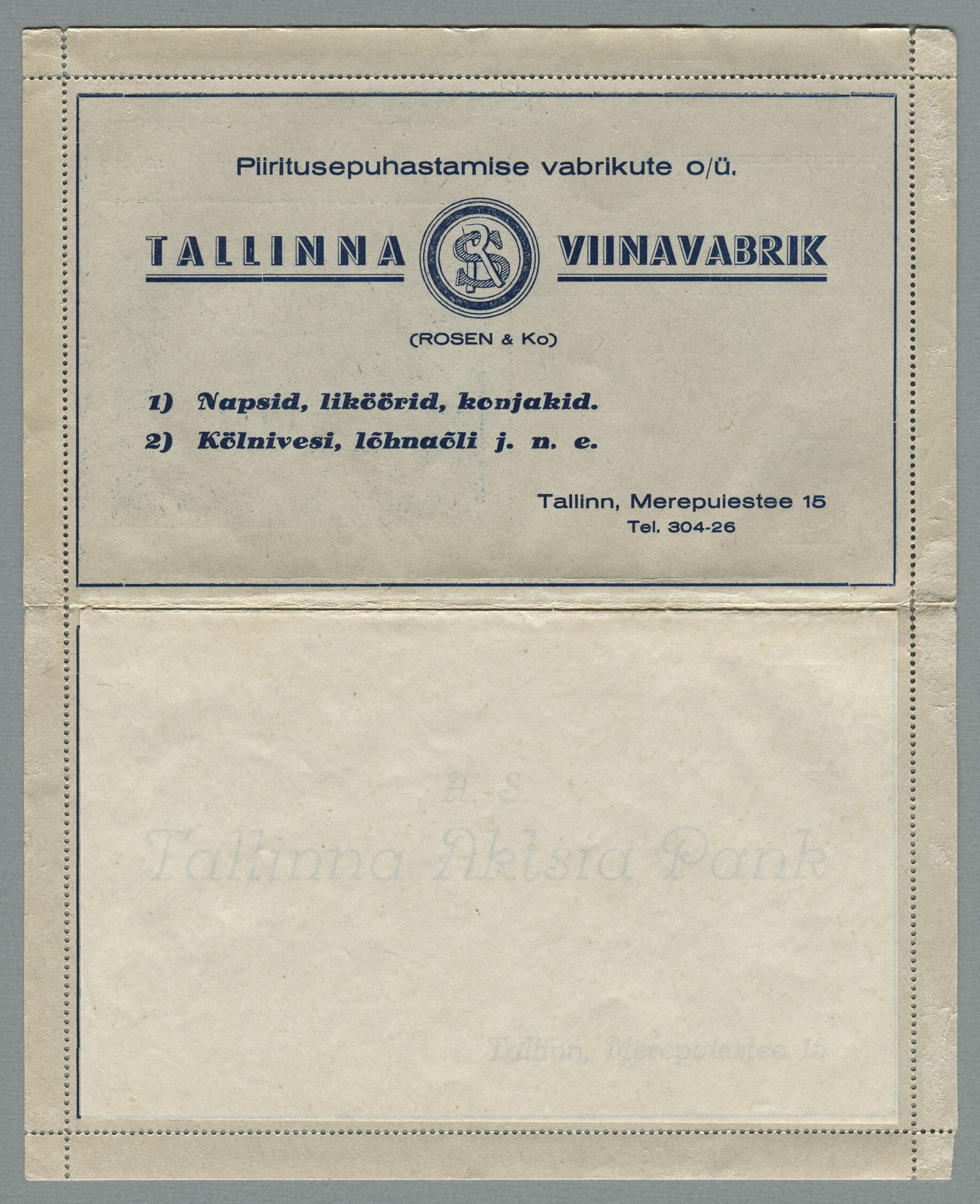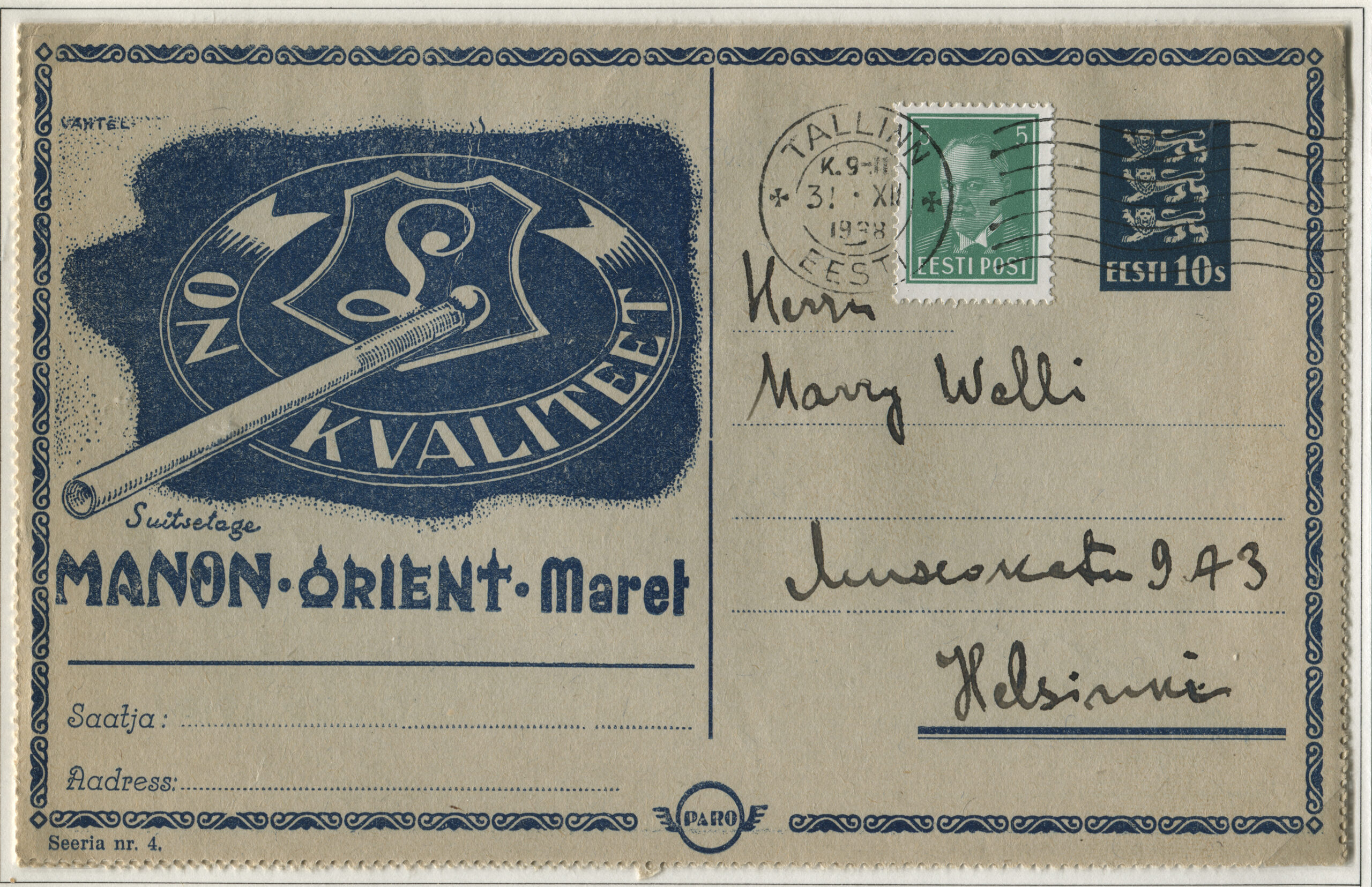 ERMi koguKaartkiri (seeria nr 4), mis on saadetud 31.12.1938 Tallinnast Helsingisse