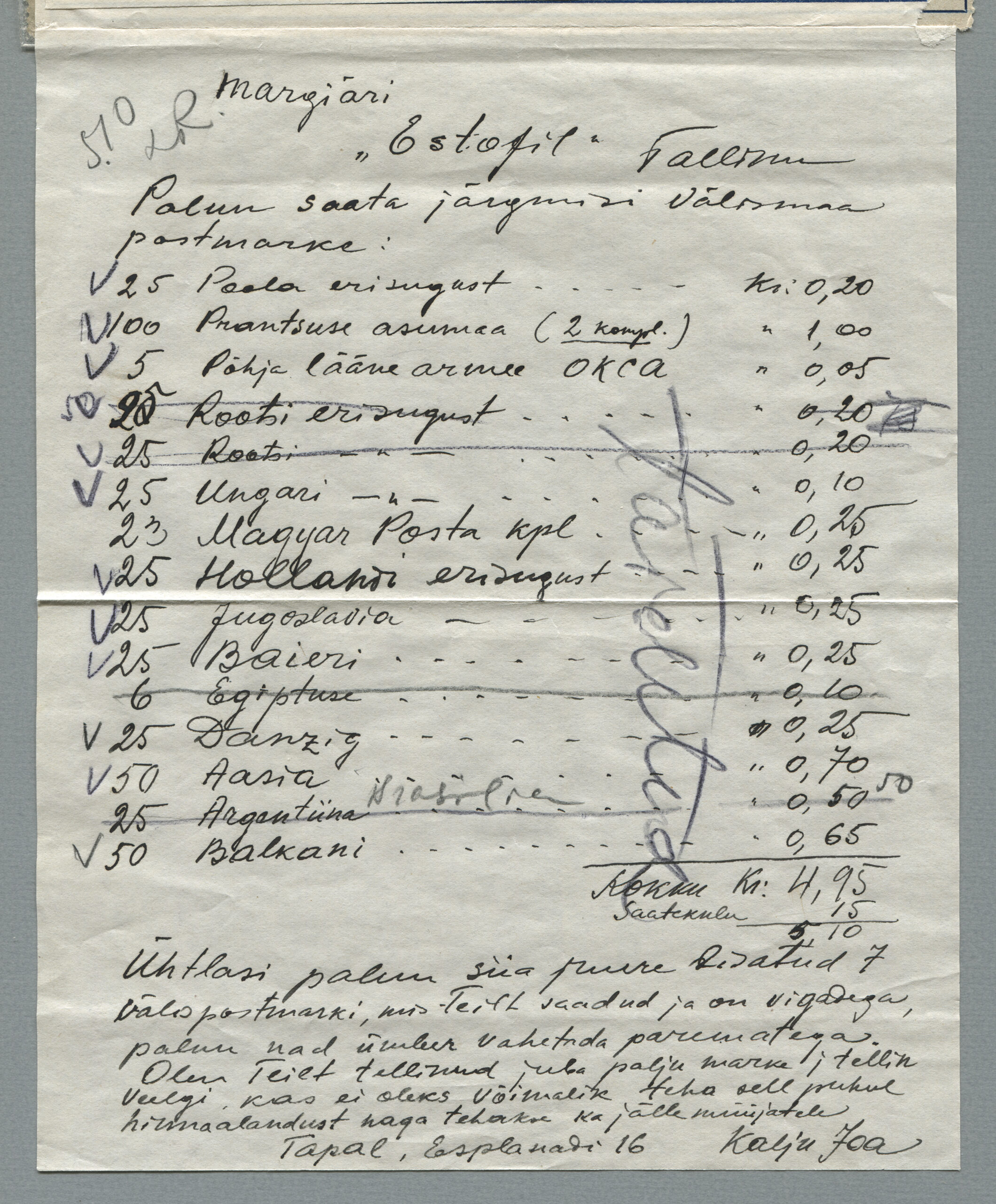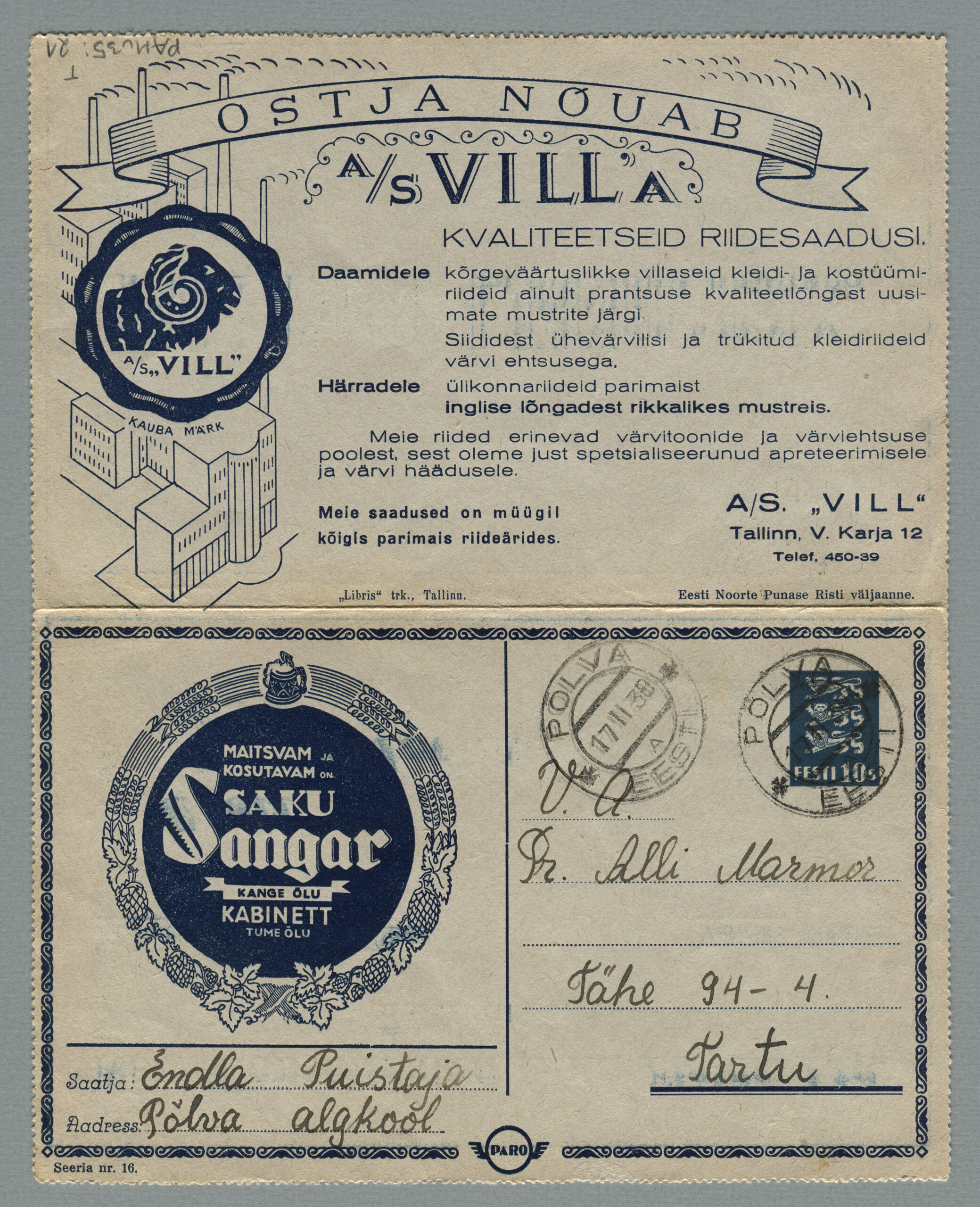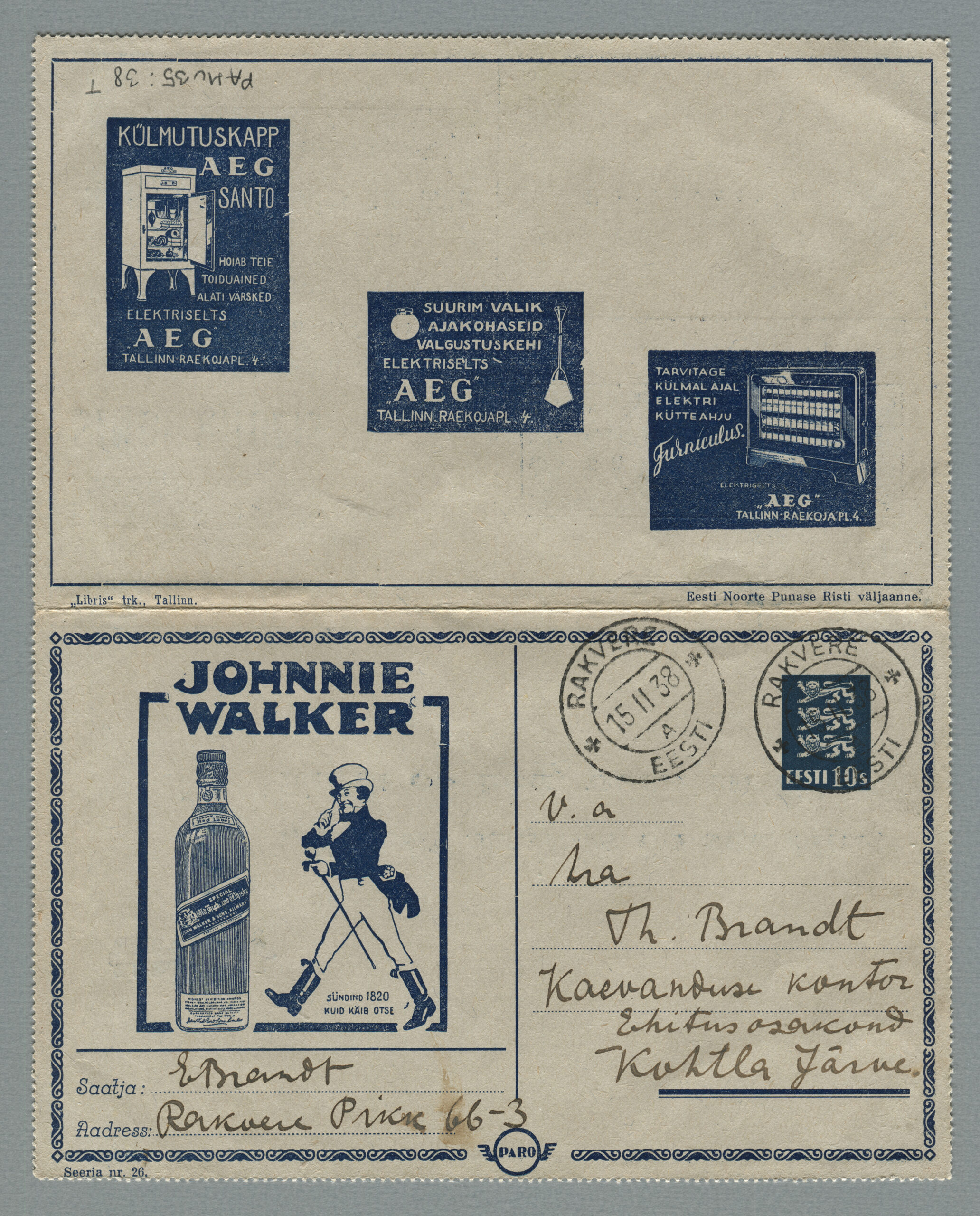 ERMi koguKaartkiri (seeria nr 5), mis on saadetud 22.11.1938 Tapalt Tallinna margiärile „Estofil“
