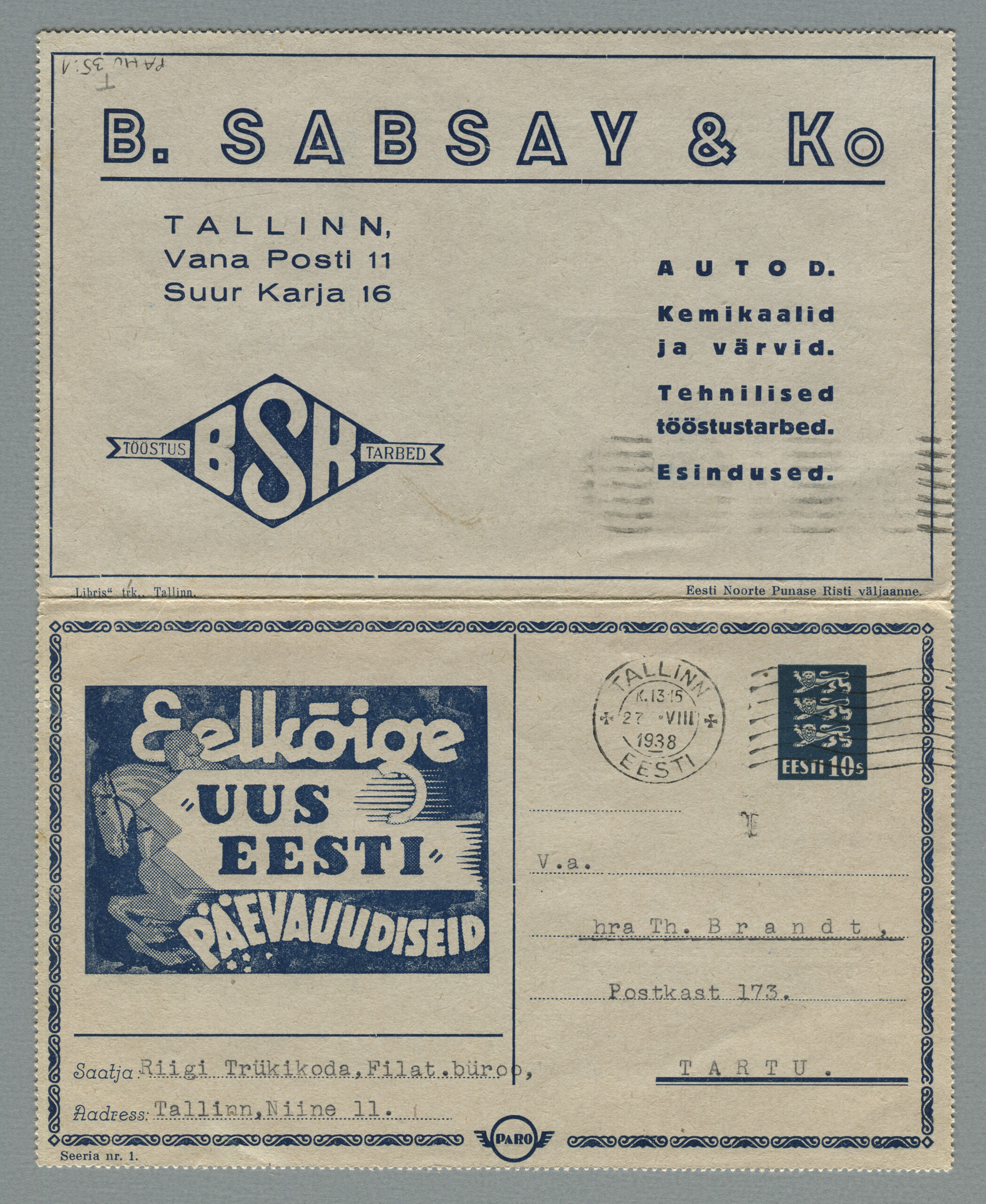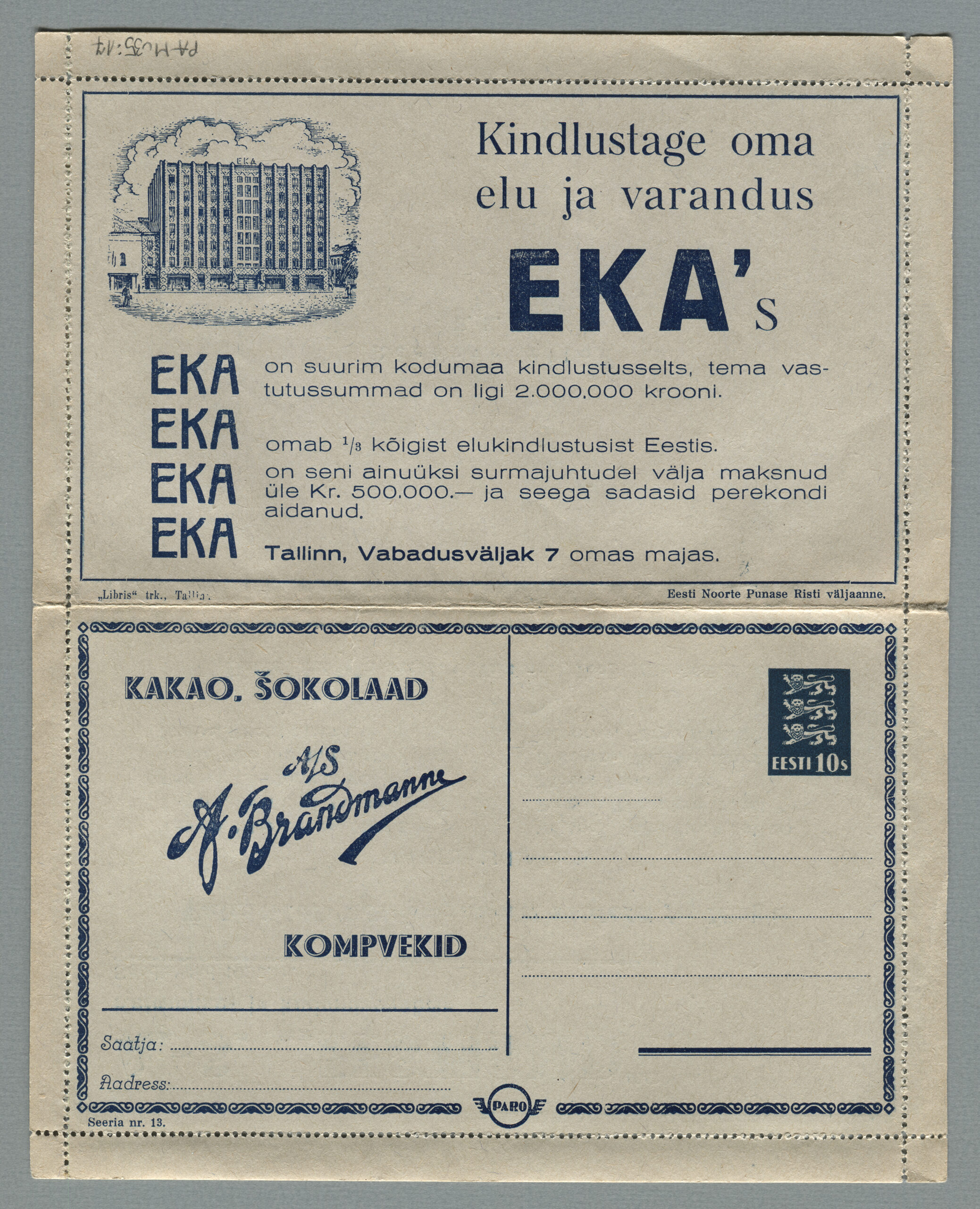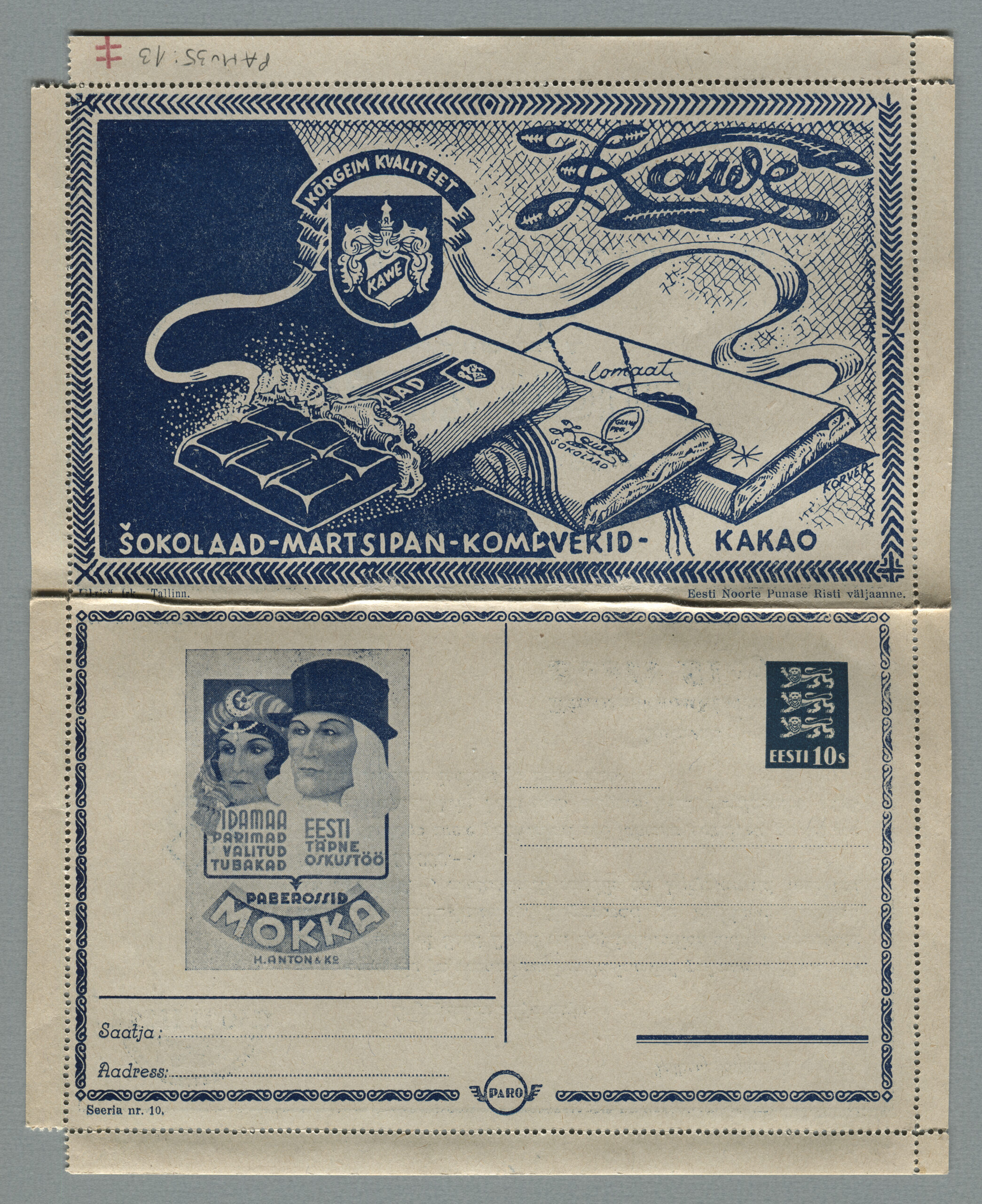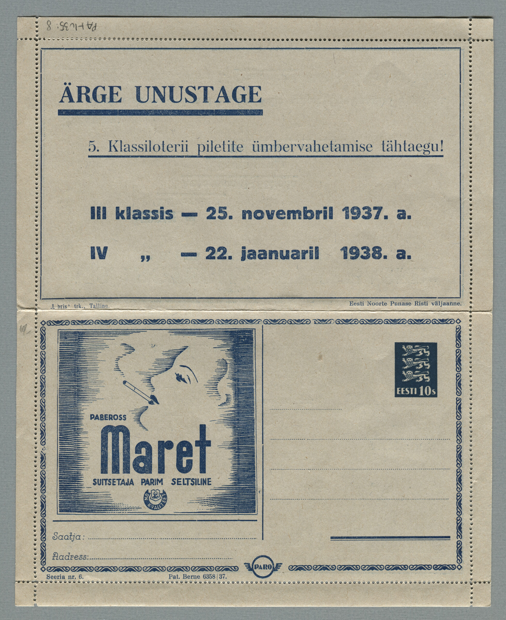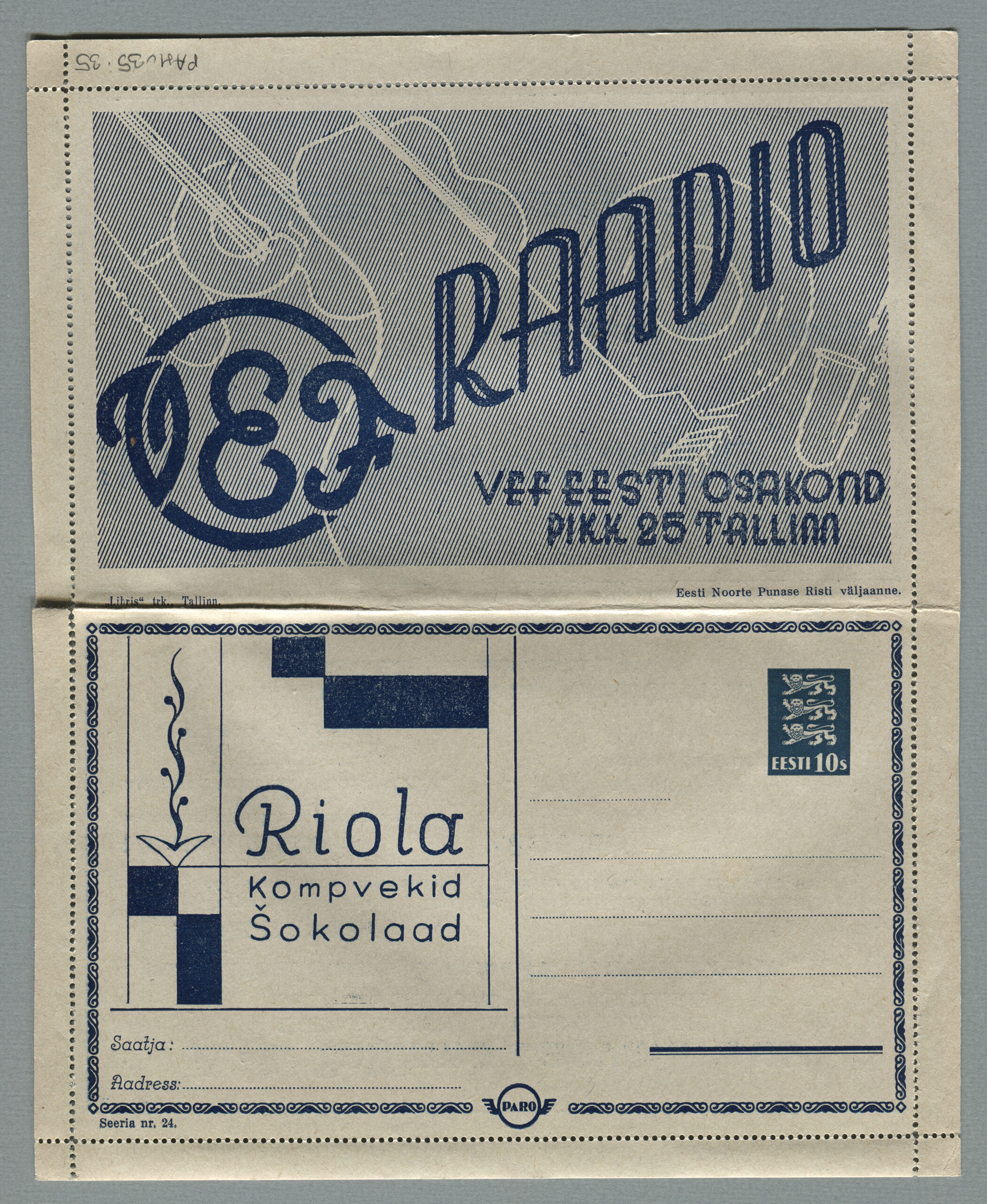 Heidame korra pilgu Paro kaartkirjade taustale. Eesti teedeministri Nikolai Viitaki määrus (Riigi Teataja nr 101, 20.12.1937, lk 1988) ütleb nii: „23. detsembril 1937 lastakse müügile ja käibele frankeeritud reklaamümbrikud Paro nimetuse all. Ümbrikud on valmistatud Eesti Noorte Punase Risti väljaandena Eesti Punase Risti poolt ja varustatud 10-sendilise postmargi kujutusega Postivalitsuse poolt.“