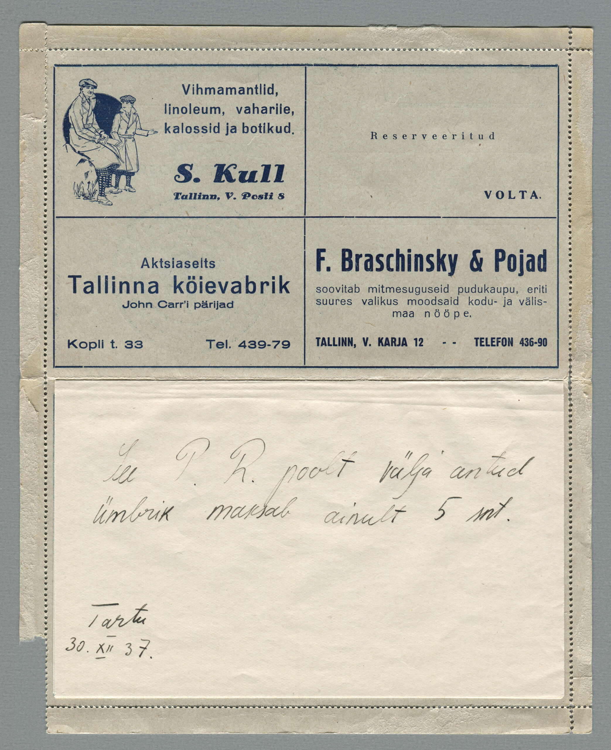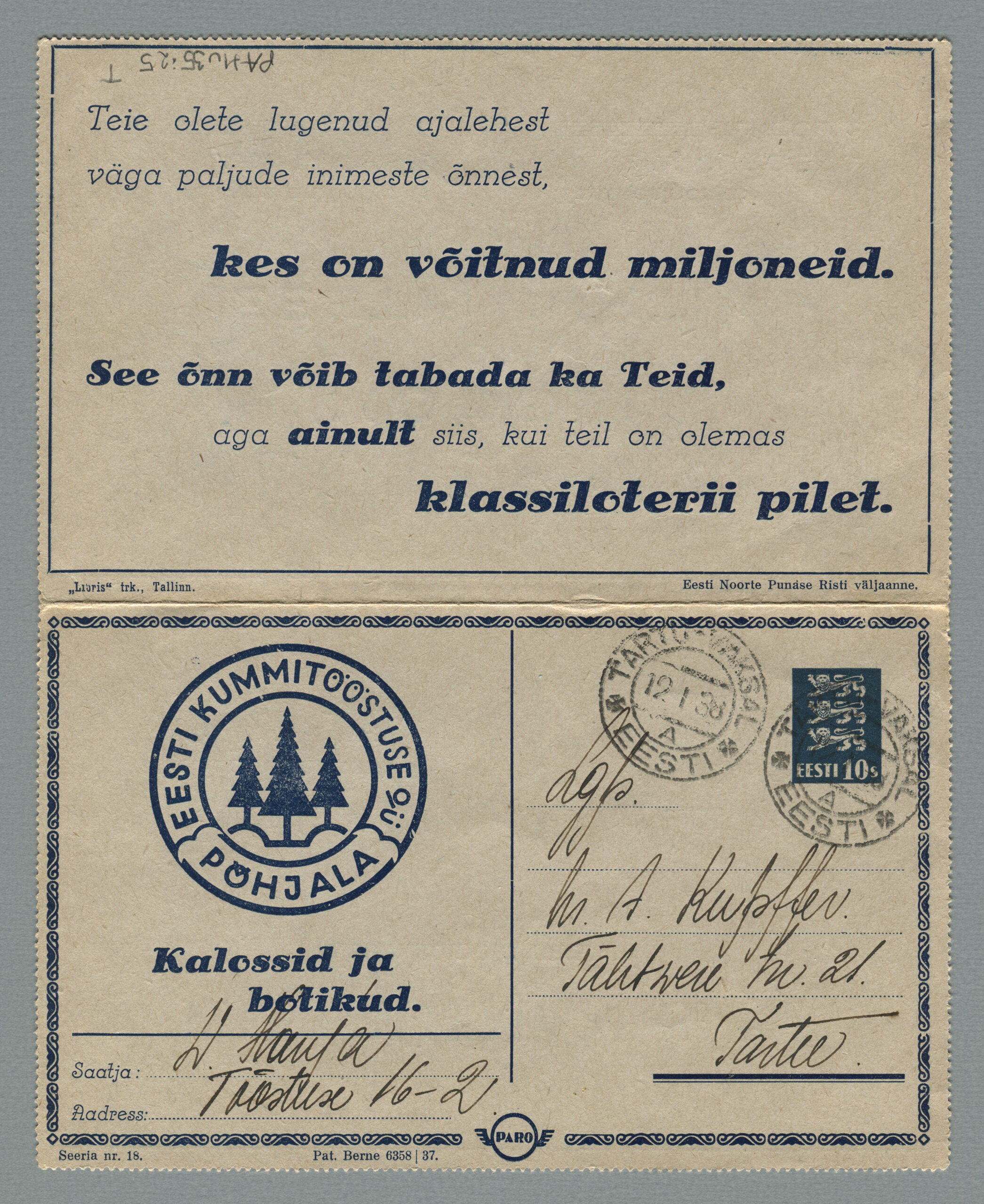 ERMi koguKaartkiri (seeria nr 7), mis on saadetud Tartusse 24.01.1938