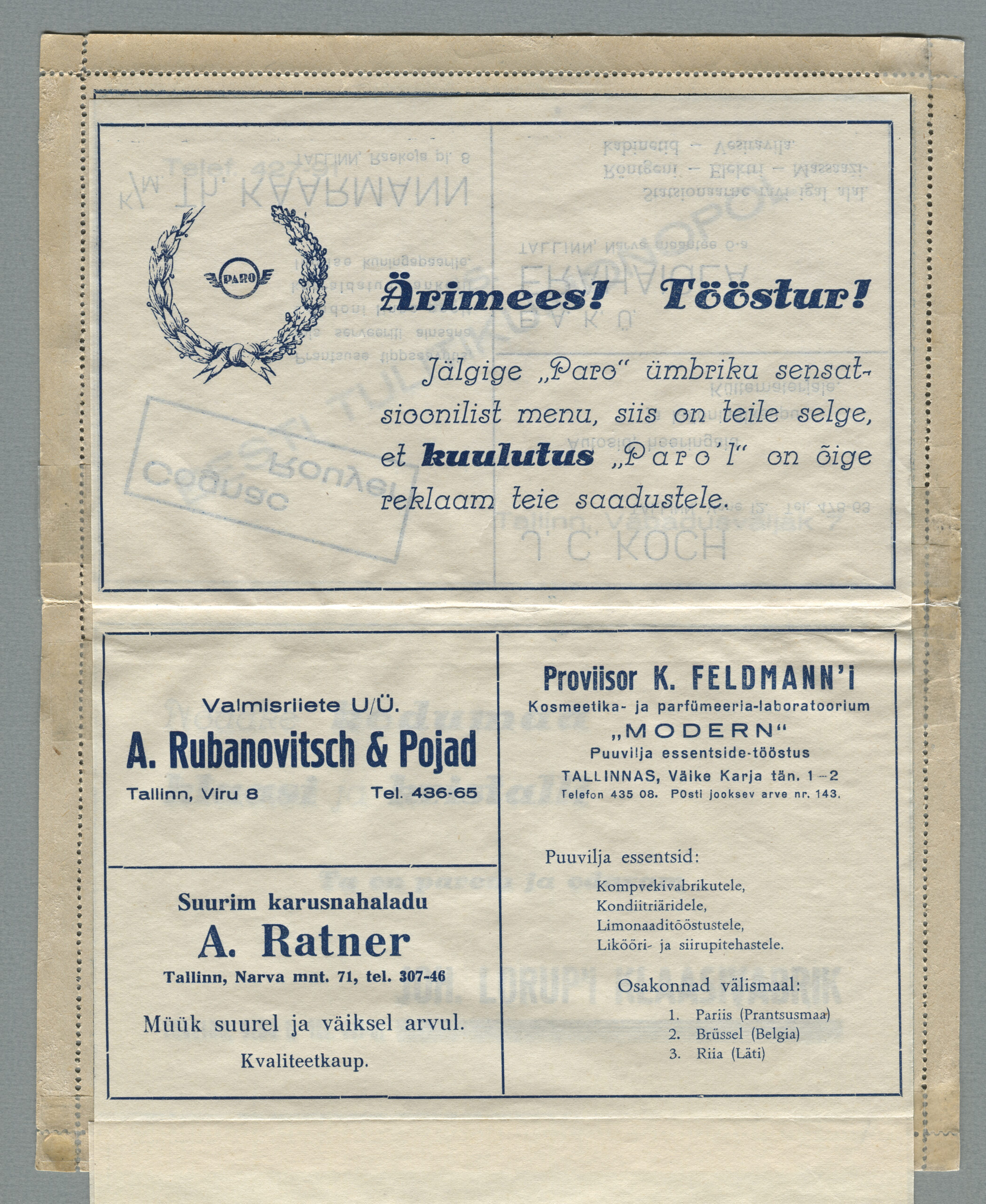 Elmar Ojaste on Postisarves 1999. aastal märkinud: „1998. aastal pakuti Saksamaal ühel oksjonil välja terve sari (28 erinevat) Paro-kirja. Alghinnaks oli DEM 11 300. Oksjonihaamer kolksus DEM 17 000 (ca EEK 136 000) (+ 15% provisjoni) juures.“