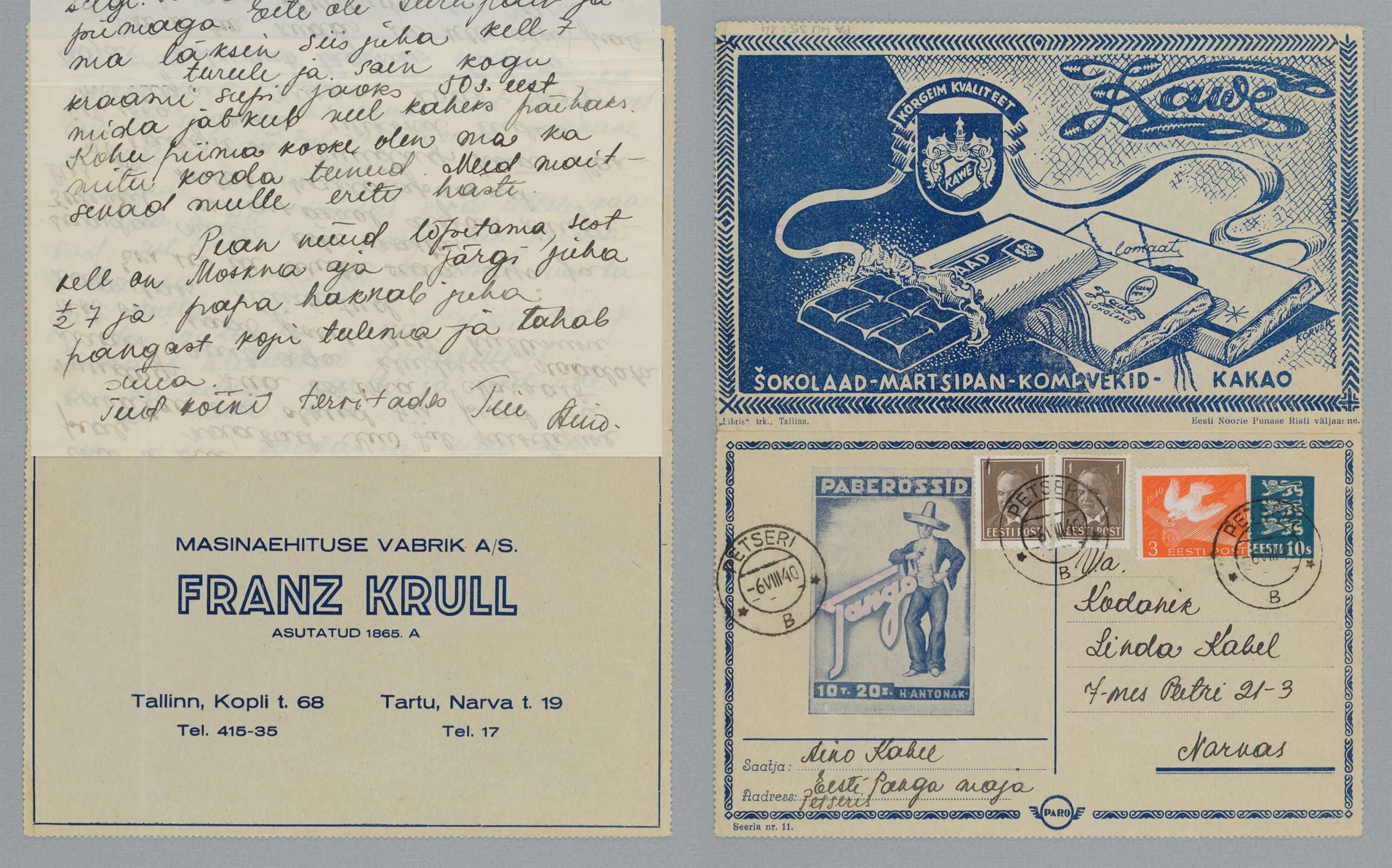 ERMi koguKaartkiri (seeria nr 11), mis on saadetud 6.08.1940 Petserist Narva