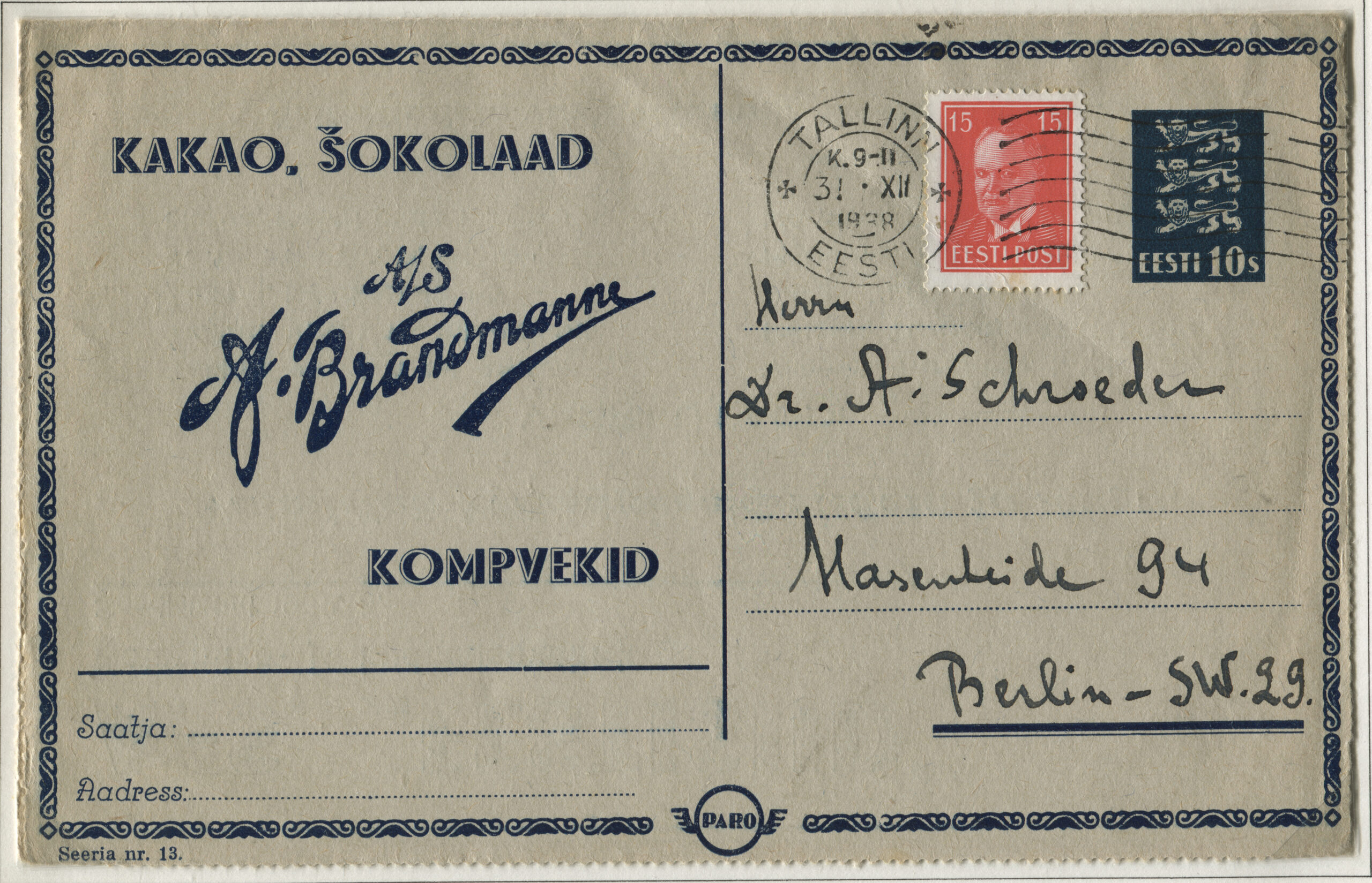 ERMi koguKaartkiri (seeria nr 13), mis on saadetud 31.12.1938 Tallinnast Berliini