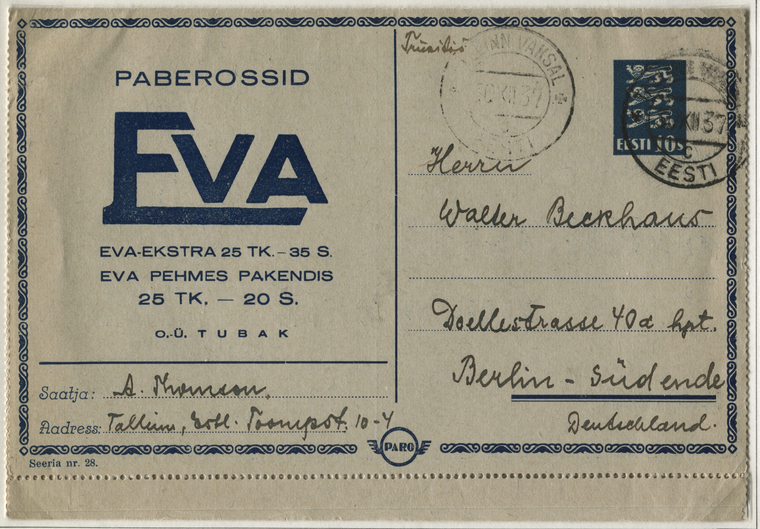 ERMi koguKaartkiri (seeria nr 28), mis on saadetud 30.12.1937 Tallinn-Vaksalist Berliini