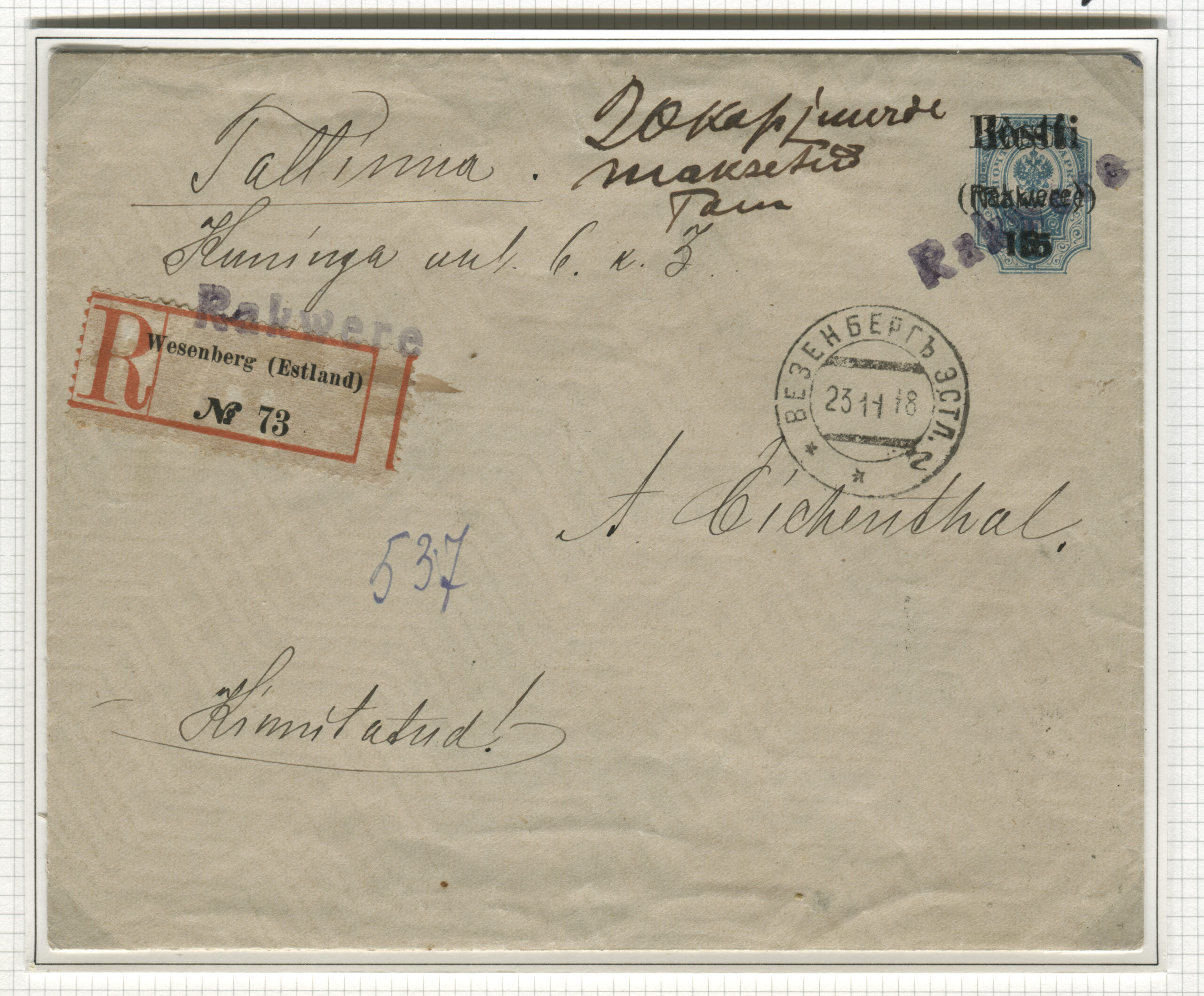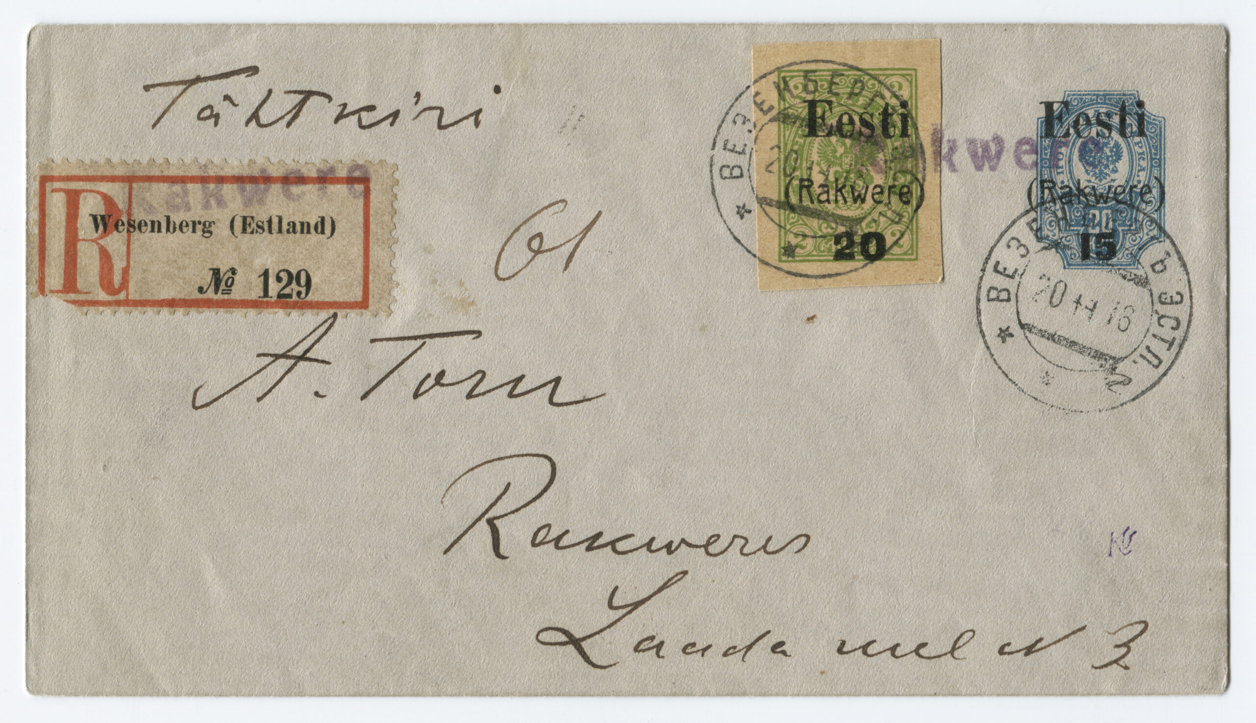 Lisaks ristpaela lintidele varustati ületrükkidega veel endise Vene posti tervikasju. Tervikasju trükiti kokku 11 erinevat liiki. Neist kaks postkaarti (10/3 kop ja 10/5 kop) ja üks liik frankoümbrikke (15/7 kop) trükiti üle Nikolai Erna trükikojas kaherealiselt: EESTI / uus väärtus (kas 10 või 15 kopikat).