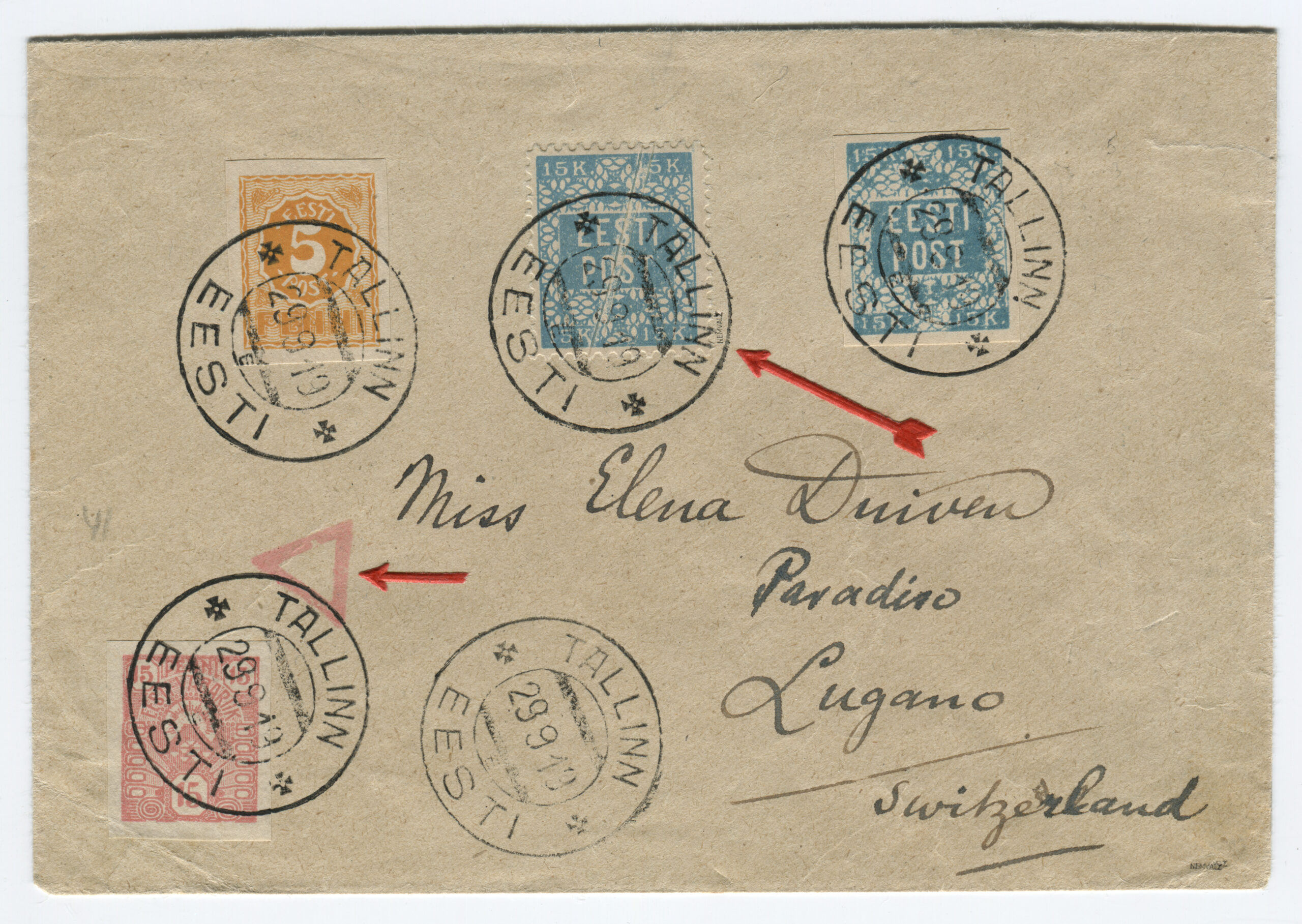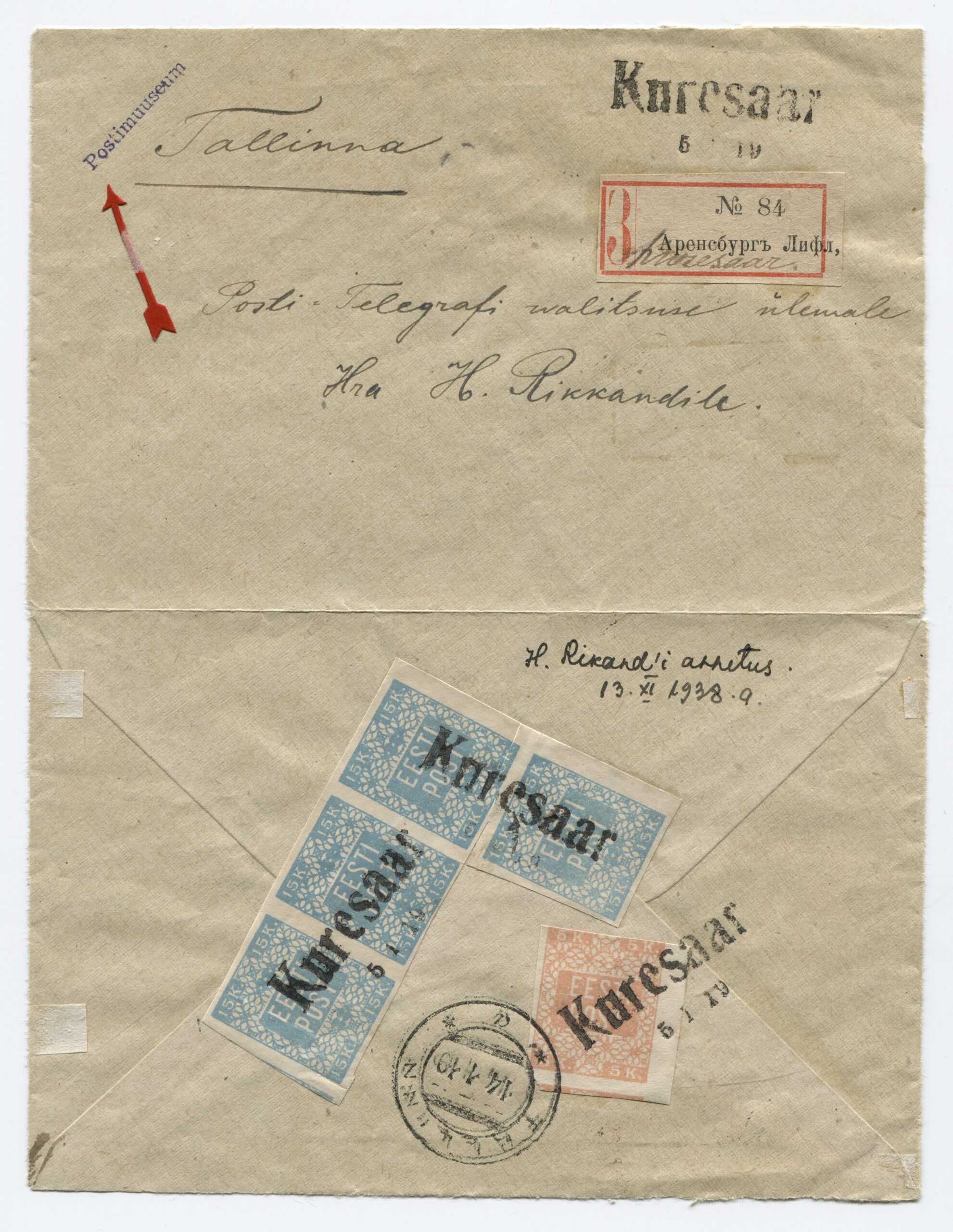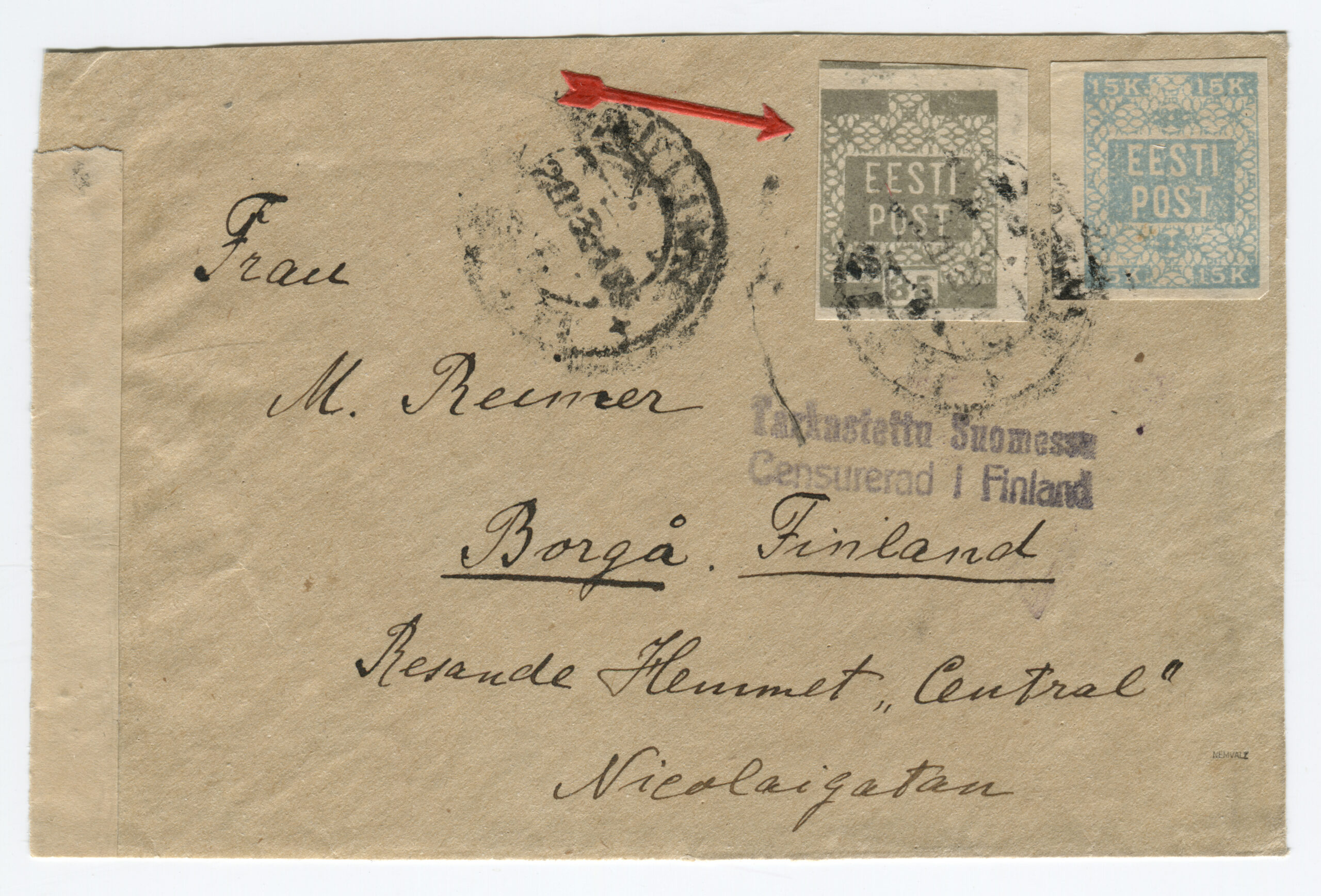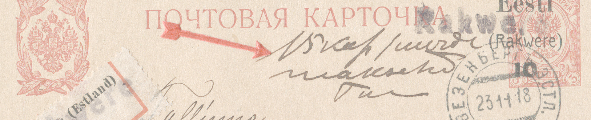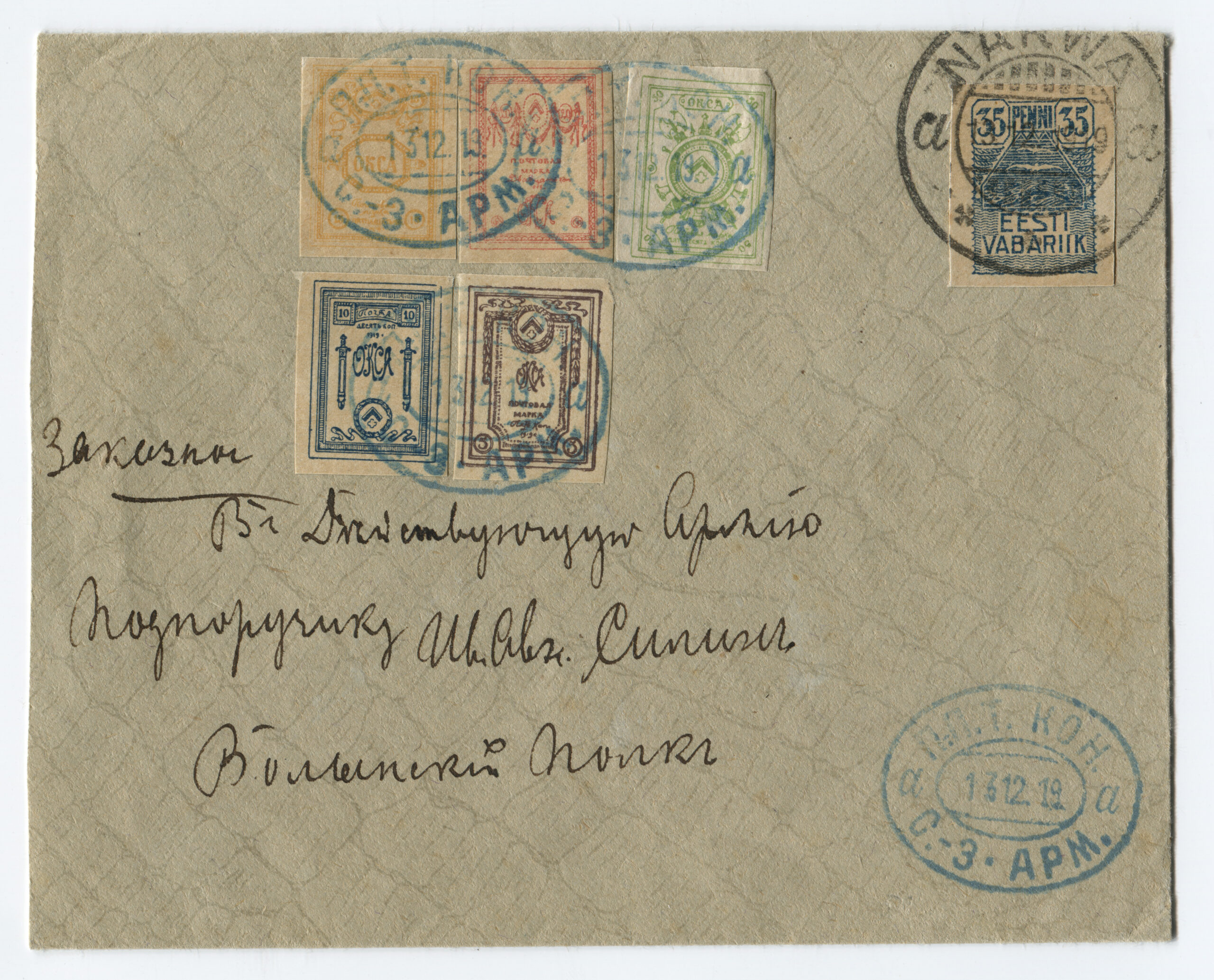 Hindrek Rikandile saadetud kiri Kuressaarest (5.01.1919) Tallinna (14.01.1919). 1938. aastal annetas Rikand kirja Postimuuseumile. (Eesti Rahva Muuseum)23.11.1918 tähitud kiri (R-kiri). Vene tervikasja kohalik ületrükk (Rakwere) ja 15/20 kop. Tähituse juurdemaks 20 kopikat kirjutatud käsitsi. Kiri saadetud A. Eichenthalile. (Eesti Rahva Muuseum)19.04.1919 Taani vabatahtlike kompanii templiga kiri kodumaale. Kirjal on 15-kopikaline lillemustriga mark, 35-pennine hall lillemustriga mark (kustutatud Taani vabatahtlike kompanii templiga) ja 7-öörine Taani mark (kustutatud Taanis 19.04.1919). Nii lillemustriga halli 35-pennist marki kui Taani vabatahtlike templijäljendit esineb kirjadel harva. Taani vabatahtlike jalaväekompanii kuulus Eesti Rahvaväe koosseisu. (Eesti Rahva Muuseum)3.04.1919 tähitud kiri (R-kiri) on saadetud Paldiskist Taani. Kirjal Taani vabatahtlike kompanii tempel. Margid kohaliku hammastusega, kustutatud templiga „Baltiski“. Taani vabatahtlike kompanii osales Eesti Vabadussõjas. Kompanii saabus 4.04.1919 Tallinna, mai keskel saadeti nad Võru rindele. Kompanii koosseisus oli 12 ohvitseri, 12 allohvitseri ja 189 sõdurit. Eestist lahkusid nad 2.09.1919. (Eesti Rahva Muuseum)19.11.1918 kiri. Vene tervikasi kohaliku ületrükiga (Rakwere) ja 15/7 kop. „Rakwere“ ületrükk markidel ja tervikasjadel oli kasutusel 16.–27.11.1918. (Eesti Rahva Muuseum)Vene tervikasi. Rakvere kohalik ületrükk (Rakwere) ja 15/20 kop. Siseriiklik kiri, saadetud A. Eichenthalile. Tähitud kirja juurdemaks 20 kopikat kirjutatud käsitsi. (Eesti Rahva Muuseum)Kohalik kiri. Mark kustutatud ajutise templiga „Rakwere“. Vene margi ületrükk (Rakwere) ja 15/2 kop. (Eesti Rahva Muuseum)18.11.1919 siseriiklik kiri. Vene margi kohalik ületrükk (Rakwere) ja 20/2 kop. (Eesti Rahva Muuseum)24.11.1918 kohalik kiri (postkaart). Vene margi kohalik ületrükk (Rakwere) ja 10/2 kop. Wesenberg (Rakvere). (Erakogu)Kohalik tähitud kiri (R-kiri). Vene tervikasja kohalik ületrükk (Rakwere) ja 15/20. Tähitud kirja juurdemaksuks lisatud mark kohaliku ületrükiga (Rakwere) ja 20/2 kop. Kiri on adresseeritud Rakvere postkontori ülem A. Tornile. (Erakogu)23.11.1918 tähitud postkaart. Vene tervikasi, kohalik ületrükk (Rakwere) ja 10/3 kop. Tähitud kirja juurdemaks 15 kopikat kirjutatud käsitsi. Postkaart saadetud A. Eichenthalile. (Erakogu)10.01.1919 Vene tervikasi saadetud Valka. Eesti Töörahva Kommuun oli Tartus 21.12.1918–14.01.1919. Postkaardi tariif oli 10 kopikat. 3-kopikalisele tervikasjale on kirjutatud käsitsi juurdemaks 7 kopikat. (Erakogu)Eesti Töörahva Kommuun oli Otepääl võimul 12.12.1918–21.01.1919. Sel ajal kasutati postis venekeelseid templeid „Нустаку“. Kiri on saadetud Otepäält Tallinna Eesti posti ja telegraafi ülemale Hindrek Rikandile. Kirja saatmise tariif 15 kopikat on kirjutatud käsitsi. (Erakogu)30.10.1919 tähitud kiri saadetud Tallinnast Saksamaale. Saabumise tempel „Heubude 16.11.1919“. Vabadussõja ajal liikusid välismaale saadetud kirjad läbi Põhjamaade. (Erakogu)Loodearmee margid trükiti Bernhard Mänsi trükikojas Tallinnas 20.08.1919. Kindral Nikolai Judenitši rinde taganemisel sattusid margid bolševike kätte, kes need hävitasid. Margid on kustutatud Loodearmee välitempliga 13.12.1919. Kirjale lisatud on 35-pennine kajakaga mark, mis on kustutatud templiga „Narwa“. (Erakogu)Lillemustriga 35-penniseid marke tehti kolmes trükis (18.01.–2.05.1919), kõigis esines toonierinevusi. Pruun (toonivahedega), hall, oliivhall ja oliivroheline. Halli värvi paarismarke esineb harva. (Erakogu)Vasakul hall 35-pennine ja paremal oliivroheline 35-pennine lillemustriga mark. (Erakogu)29.09.1919 kiri saadetud Tallinnast laevapostiga Helsingisse, sealt edasi Šveitsi. Laevaposti tsenseeriti punase kolmnurkse templiga, mis oli kasutusel 1919. aasta septembrist novembrini. Kirjal on lillemustriga 15-kopikaline mark, mis on nii lõigatud kui hammastatud. Hammastusega 15-kopikalised margid on haruldased, eriti kirjal. (Erakogu)20.03.1919 kiri saadetud Tallinnast Soome Borgåsse (Porvoo). 35-penniste lillemustriga markide trükkimisel esines värvierinevusi. Halli tooni margid, eriti kirjal, on haruldased. (Erakogu)1.07.1919 kiri saadetud Tallinnast Stuttgarti. Kontrollitud Tallinnas, kirjal kolmnurkne tsensortempel S.K. Sõjakontrolli (S.K.) tempel oli Tallinnas kasutusel alates 5.01.1919. (Erakogu)8.04.1919 tähitud trükitöö kiri Tallinnast Saksamaale Bornasse. Tähitud kirja (R-kiri) tempel numbritega, tsaariajal kasutusel olnud kuupäevatempel „Ревель“, nii Tallinna kui Soome sõjakontrolli tempel. Templile „Ревель“ on peale löödud esimene eestikeelne tempel „Tallinn“. Samuti on kirjal esimene eestikeelne R-tempel „Tallinn“. (Erakogu)9.12.1918. Postkaart on saadetud Eesti Vabadussõja alguses Tartust Riiga. Postkaardi saatmise tariif oli 5 kopikat. (Erakogu)1.01.1919 kohalik kiri. Tariifid muutusid 1.01.1919, postkaardi saatmine maksis 10 kopikat. Kiri saadetud tariifide muutumise päeval. (Erakogu)21.01.1919 siseriiklik kiri Viljandist (Фэллинь) Tallinna (Reval). Lillemustriga 35-penniste markide trükkimisel esines värvierinevusi. Kirjal tumepruun mark. (Erakogu)21.01.1919 siseriiklik kiri Viljandist (Фэллинь) Tallinna (Reval). Lillemustriga 35-penniste markide trükkimisel esines värvierinevusi. Kirjal tumepruun mark. (Erakogu)