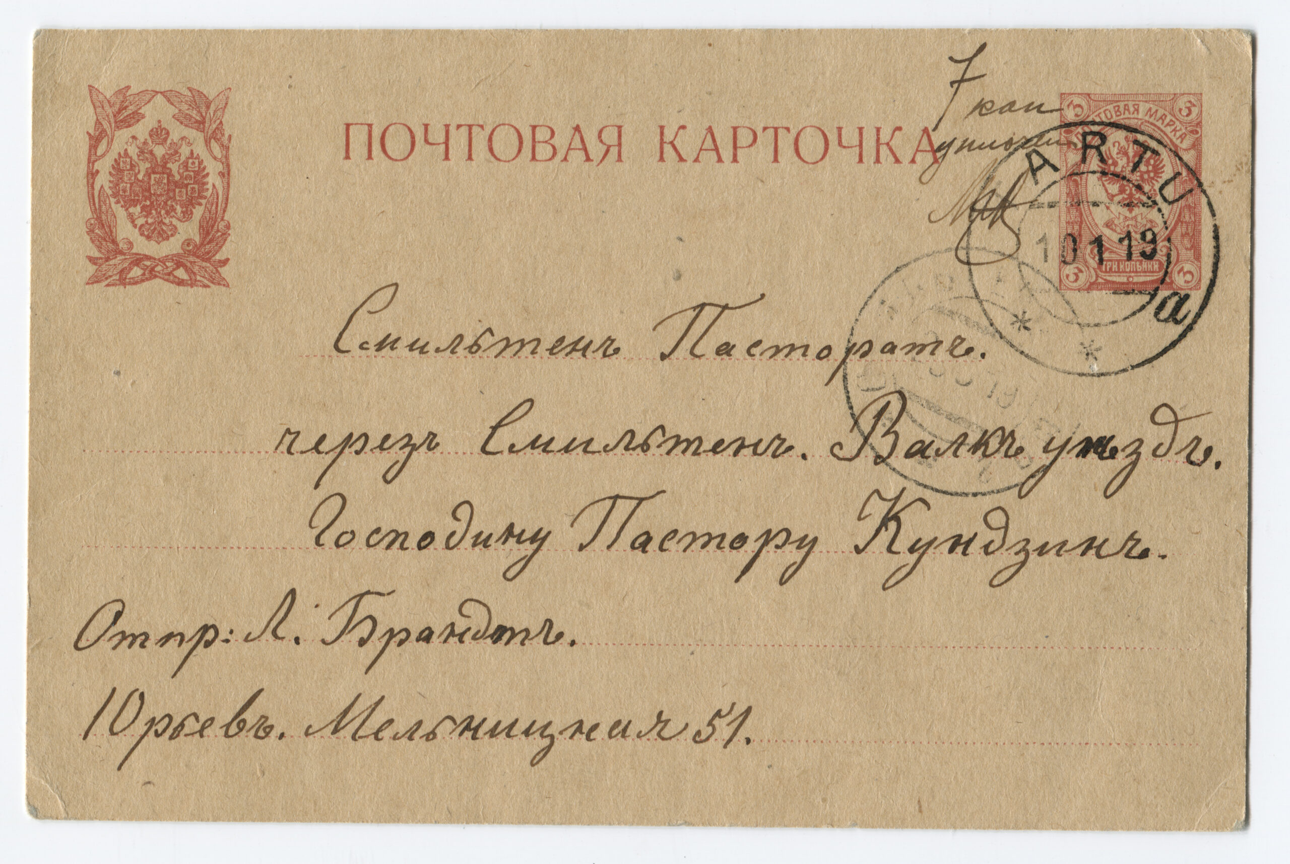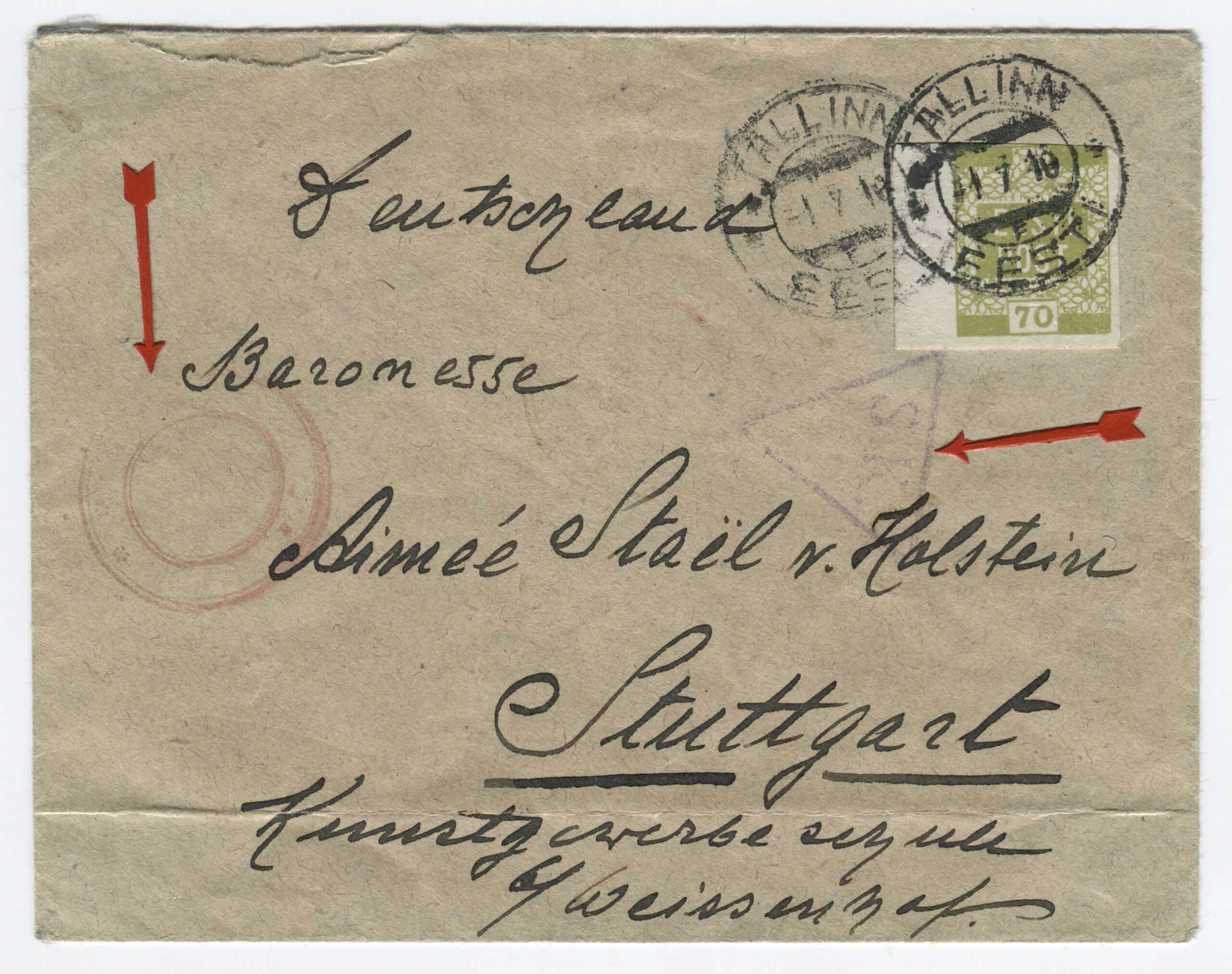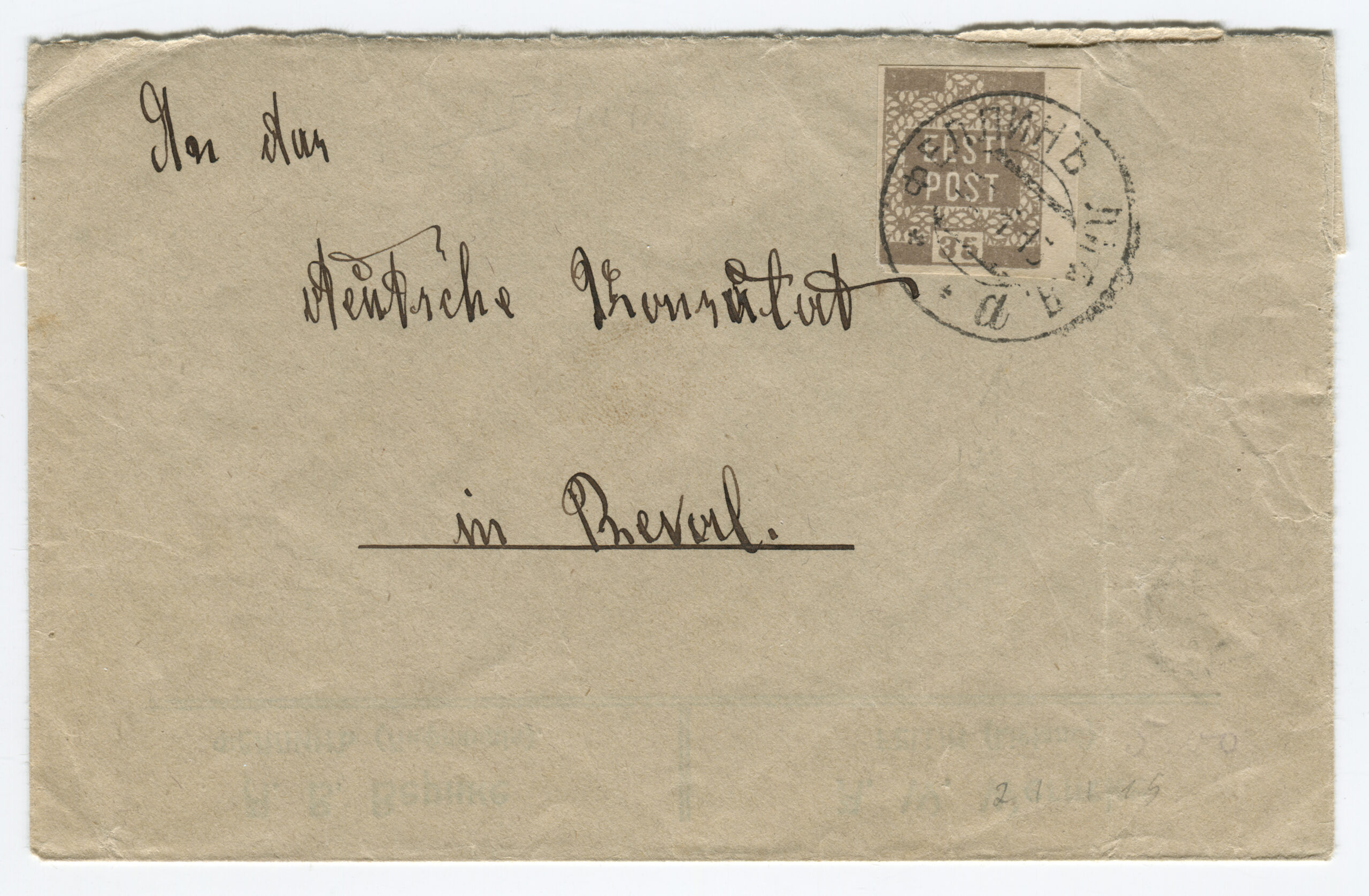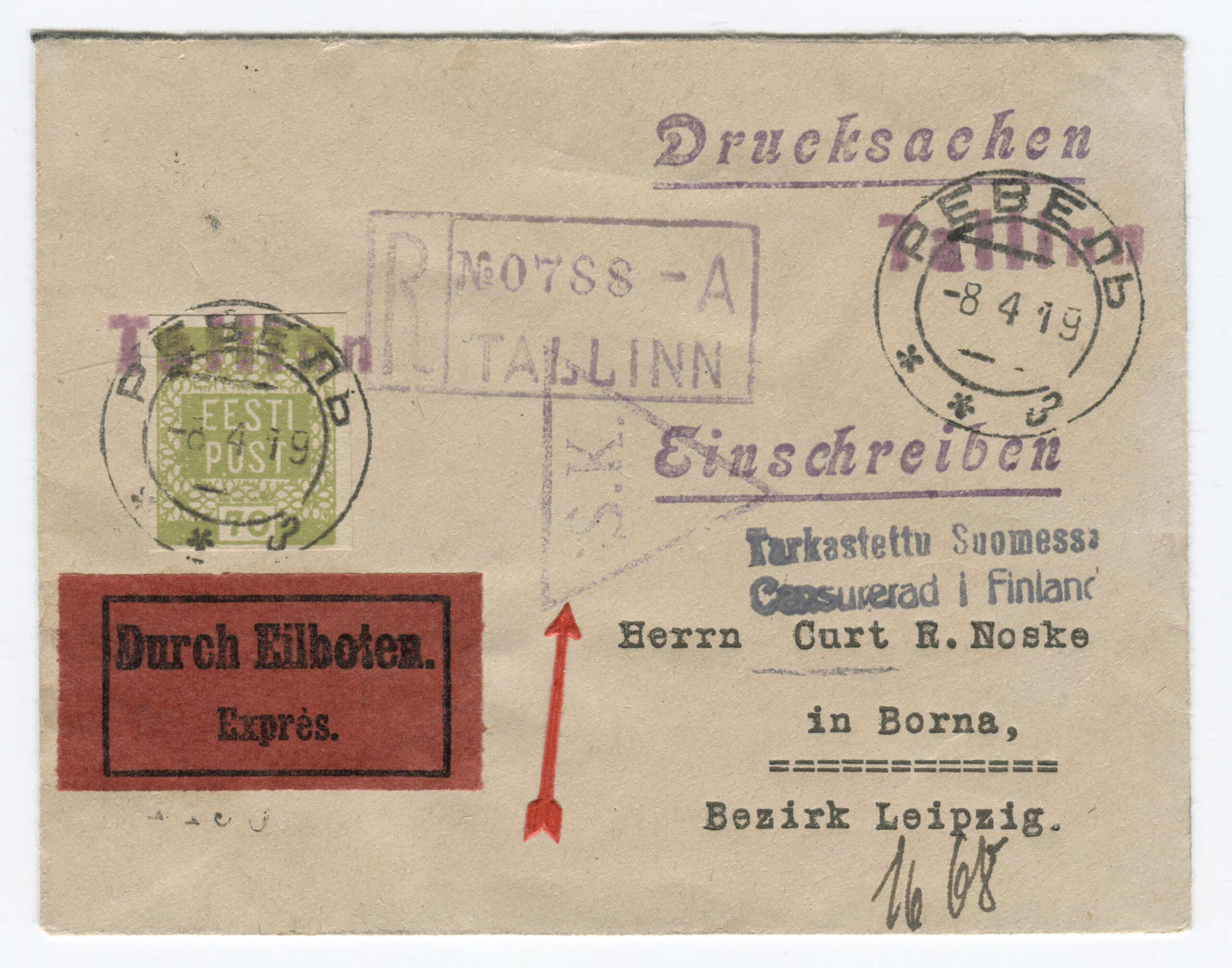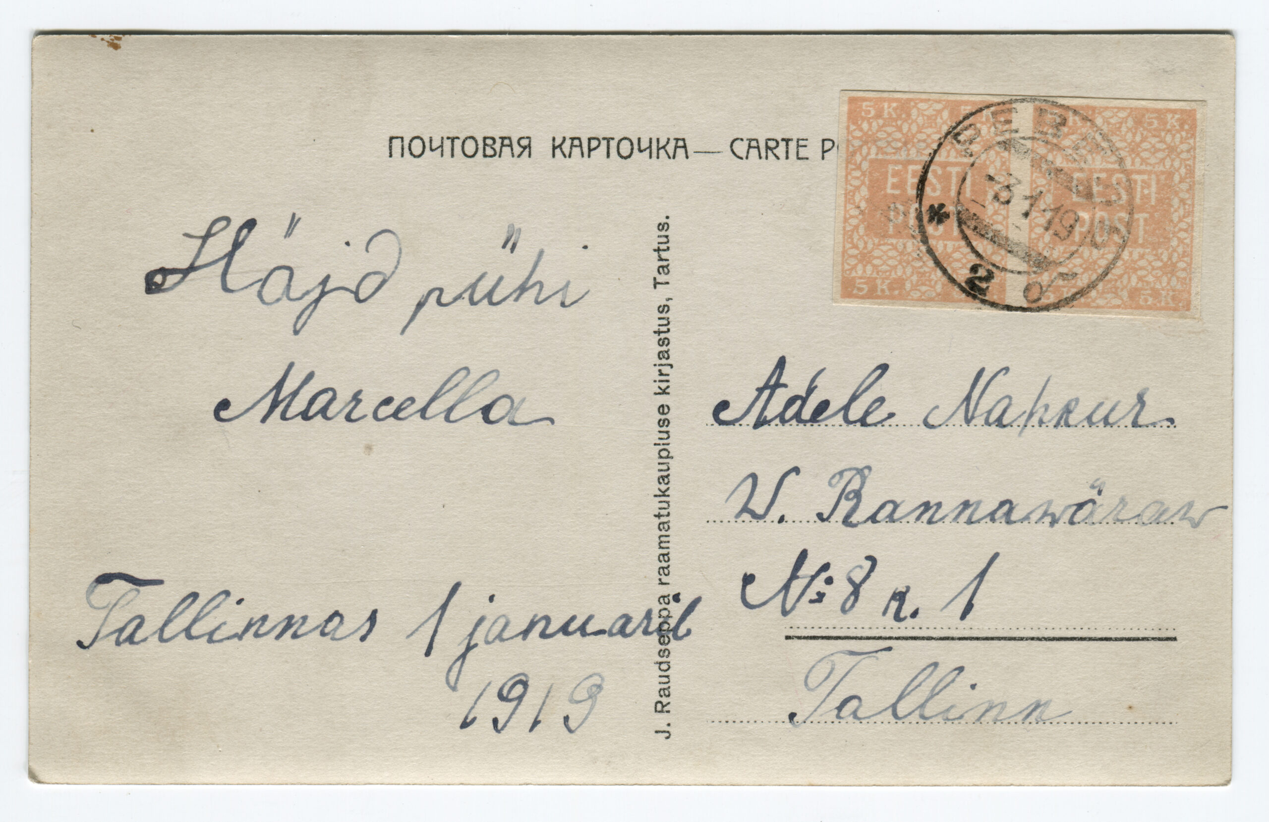 Hindrek Rikandile saadetud kiri Kuressaarest (5.01.1919) Tallinna (14.01.1919). 1938. aastal annetas Rikand kirja Postimuuseumile. (Eesti Rahva Muuseum)23.11.1918 tähitud kiri (R-kiri). Vene tervikasja kohalik ületrükk (Rakwere) ja 15/20 kop. Tähituse juurdemaks 20 kopikat kirjutatud käsitsi. Kiri saadetud A. Eichenthalile. (Eesti Rahva Muuseum)19.04.1919 Taani vabatahtlike kompanii templiga kiri kodumaale. Kirjal on 15-kopikaline lillemustriga mark, 35-pennine hall lillemustriga mark (kustutatud Taani vabatahtlike kompanii templiga) ja 7-öörine Taani mark (kustutatud Taanis 19.04.1919). Nii lillemustriga halli 35-pennist marki kui Taani vabatahtlike templijäljendit esineb kirjadel harva. Taani vabatahtlike jalaväekompanii kuulus Eesti Rahvaväe koosseisu. (Eesti Rahva Muuseum)3.04.1919 tähitud kiri (R-kiri) on saadetud Paldiskist Taani. Kirjal Taani vabatahtlike kompanii tempel. Margid kohaliku hammastusega, kustutatud templiga „Baltiski“. Taani vabatahtlike kompanii osales Eesti Vabadussõjas. Kompanii saabus 4.04.1919 Tallinna, mai keskel saadeti nad Võru rindele. Kompanii koosseisus oli 12 ohvitseri, 12 allohvitseri ja 189 sõdurit. Eestist lahkusid nad 2.09.1919. (Eesti Rahva Muuseum)19.11.1918 kiri. Vene tervikasi kohaliku ületrükiga (Rakwere) ja 15/7 kop. „Rakwere“ ületrükk markidel ja tervikasjadel oli kasutusel 16.–27.11.1918. (Eesti Rahva Muuseum)Vene tervikasi. Rakvere kohalik ületrükk (Rakwere) ja 15/20 kop. Siseriiklik kiri, saadetud A. Eichenthalile. Tähitud kirja juurdemaks 20 kopikat kirjutatud käsitsi. (Eesti Rahva Muuseum)Kohalik kiri. Mark kustutatud ajutise templiga „Rakwere“. Vene margi ületrükk (Rakwere) ja 15/2 kop. (Eesti Rahva Muuseum)18.11.1919 siseriiklik kiri. Vene margi kohalik ületrükk (Rakwere) ja 20/2 kop. (Eesti Rahva Muuseum)24.11.1918 kohalik kiri (postkaart). Vene margi kohalik ületrükk (Rakwere) ja 10/2 kop. Wesenberg (Rakvere). (Erakogu)Kohalik tähitud kiri (R-kiri). Vene tervikasja kohalik ületrükk (Rakwere) ja 15/20. Tähitud kirja juurdemaksuks lisatud mark kohaliku ületrükiga (Rakwere) ja 20/2 kop. Kiri on adresseeritud Rakvere postkontori ülem A. Tornile. (Erakogu)23.11.1918 tähitud postkaart. Vene tervikasi, kohalik ületrükk (Rakwere) ja 10/3 kop. Tähitud kirja juurdemaks 15 kopikat kirjutatud käsitsi. Postkaart saadetud A. Eichenthalile. (Erakogu)10.01.1919 Vene tervikasi saadetud Valka. Eesti Töörahva Kommuun oli Tartus 21.12.1918–14.01.1919. Postkaardi tariif oli 10 kopikat. 3-kopikalisele tervikasjale on kirjutatud käsitsi juurdemaks 7 kopikat. (Erakogu)Eesti Töörahva Kommuun oli Otepääl võimul 12.12.1918–21.01.1919. Sel ajal kasutati postis venekeelseid templeid „Нустаку“. Kiri on saadetud Otepäält Tallinna Eesti posti ja telegraafi ülemale Hindrek Rikandile. Kirja saatmise tariif 15 kopikat on kirjutatud käsitsi. (Erakogu)30.10.1919 tähitud kiri saadetud Tallinnast Saksamaale. Saabumise tempel „Heubude 16.11.1919“. Vabadussõja ajal liikusid välismaale saadetud kirjad läbi Põhjamaade. (Erakogu)Loodearmee margid trükiti Bernhard Mänsi trükikojas Tallinnas 20.08.1919. Kindral Nikolai Judenitši rinde taganemisel sattusid margid bolševike kätte, kes need hävitasid. Margid on kustutatud Loodearmee välitempliga 13.12.1919. Kirjale lisatud on 35-pennine kajakaga mark, mis on kustutatud templiga „Narwa“. (Erakogu)Lillemustriga 35-penniseid marke tehti kolmes trükis (18.01.–2.05.1919), kõigis esines toonierinevusi. Pruun (toonivahedega), hall, oliivhall ja oliivroheline. Halli värvi paarismarke esineb harva. (Erakogu)Vasakul hall 35-pennine ja paremal oliivroheline 35-pennine lillemustriga mark. (Erakogu)29.09.1919 kiri saadetud Tallinnast laevapostiga Helsingisse, sealt edasi Šveitsi. Laevaposti tsenseeriti punase kolmnurkse templiga, mis oli kasutusel 1919. aasta septembrist novembrini. Kirjal on lillemustriga 15-kopikaline mark, mis on nii lõigatud kui hammastatud. Hammastusega 15-kopikalised margid on haruldased, eriti kirjal. (Erakogu)20.03.1919 kiri saadetud Tallinnast Soome Borgåsse (Porvoo). 35-penniste lillemustriga markide trükkimisel esines värvierinevusi. Halli tooni margid, eriti kirjal, on haruldased. (Erakogu)1.07.1919 kiri saadetud Tallinnast Stuttgarti. Kontrollitud Tallinnas, kirjal kolmnurkne tsensortempel S.K. Sõjakontrolli (S.K.) tempel oli Tallinnas kasutusel alates 5.01.1919. (Erakogu)8.04.1919 tähitud trükitöö kiri Tallinnast Saksamaale Bornasse. Tähitud kirja (R-kiri) tempel numbritega, tsaariajal kasutusel olnud kuupäevatempel „Ревель“, nii Tallinna kui Soome sõjakontrolli tempel. Templile „Ревель“ on peale löödud esimene eestikeelne tempel „Tallinn“. Samuti on kirjal esimene eestikeelne R-tempel „Tallinn“. (Erakogu)9.12.1918. Postkaart on saadetud Eesti Vabadussõja alguses Tartust Riiga. Postkaardi saatmise tariif oli 5 kopikat. (Erakogu)1.01.1919 kohalik kiri. Tariifid muutusid 1.01.1919, postkaardi saatmine maksis 10 kopikat. Kiri saadetud tariifide muutumise päeval. (Erakogu)21.01.1919 siseriiklik kiri Viljandist (Фэллинь) Tallinna (Reval). Lillemustriga 35-penniste markide trükkimisel esines värvierinevusi. Kirjal tumepruun mark. (Erakogu)21.01.1919 siseriiklik kiri Viljandist (Фэллинь) Tallinna (Reval). Lillemustriga 35-penniste markide trükkimisel esines värvierinevusi. Kirjal tumepruun mark. (Erakogu)