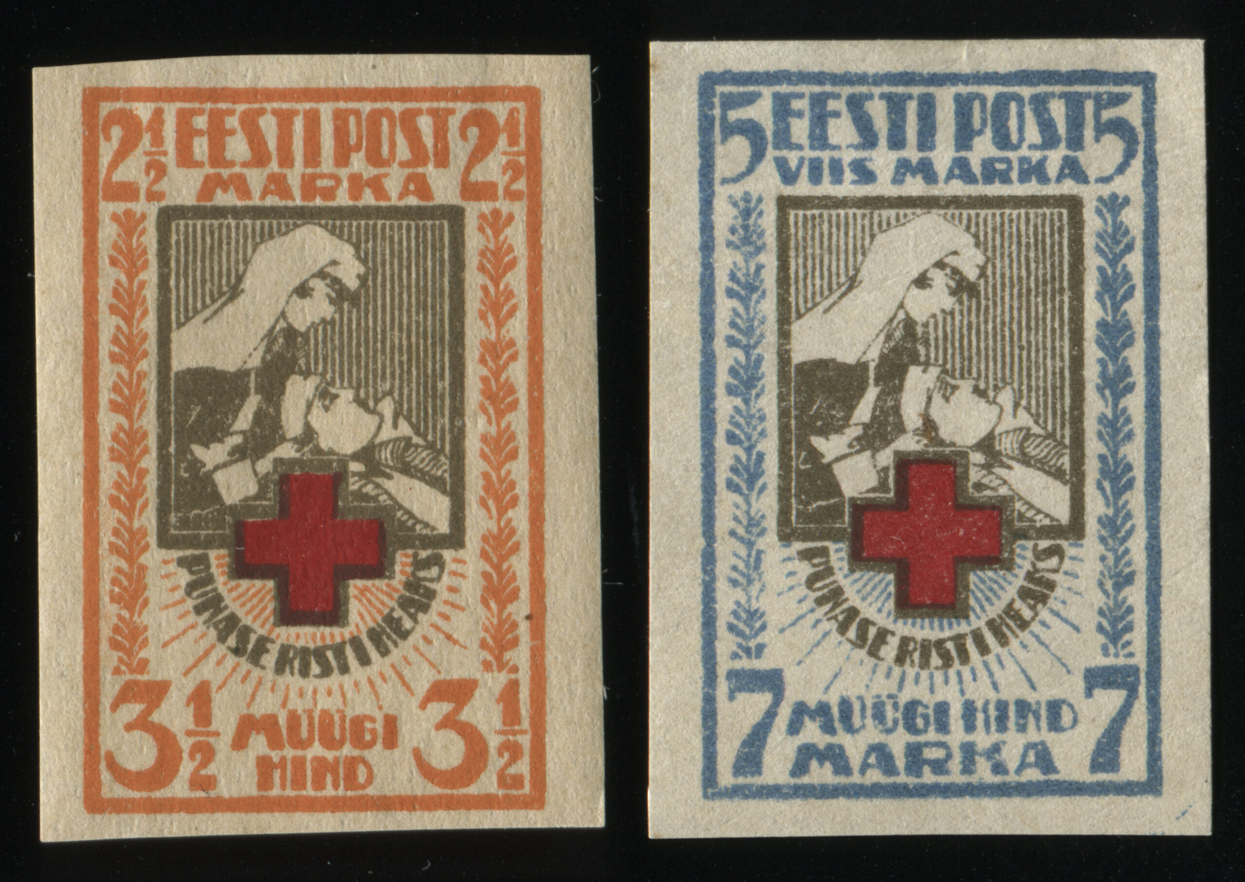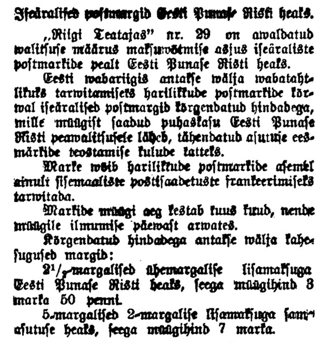 Päewaleht nr 104 (22.04.1921) annab teada: „Iseäralised postmargid Eesti Punase Risti heaks. Riigi Teatajas nr 29 on avaldatud valitsuse määrus vastuvõtmise asjus iseäraliste postmarkide pealt Eesti Punase risti heaks. Eesti Vabariigis antakse välja vabatahtlikuks tarvitamiseks harilikkude postmarkide kõrval iseäralised postmargid kõrgendatud hindadega, mille müügist saadud puhastulu Eesti Punase Risti peavalitsusele läheb, tähendatud asutuse eesmärkide teostamise kulude katteks. Marke võib harilikkude postmarkide asemel ainult sisemaaliste postisaadetuste frankeerimiseks tarvitada. Markide müügi aeg kestab kuus kuud, nende müügile ilmumise päevast arvates.“