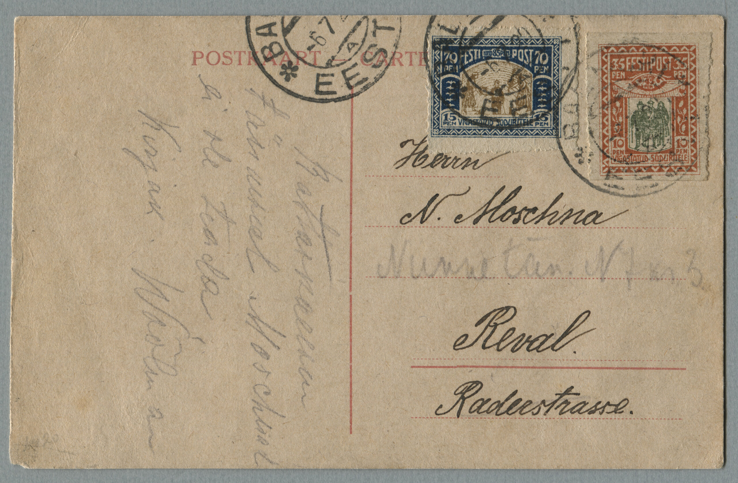ERMi koguPäewaleht, nr 240, 22. oktoober 1920Kaja nr 88, 21. aprill 1921Postkaart on saadetud Tallinna, postivaguni Pärnu-Tallinn tempel 15.07.1921.