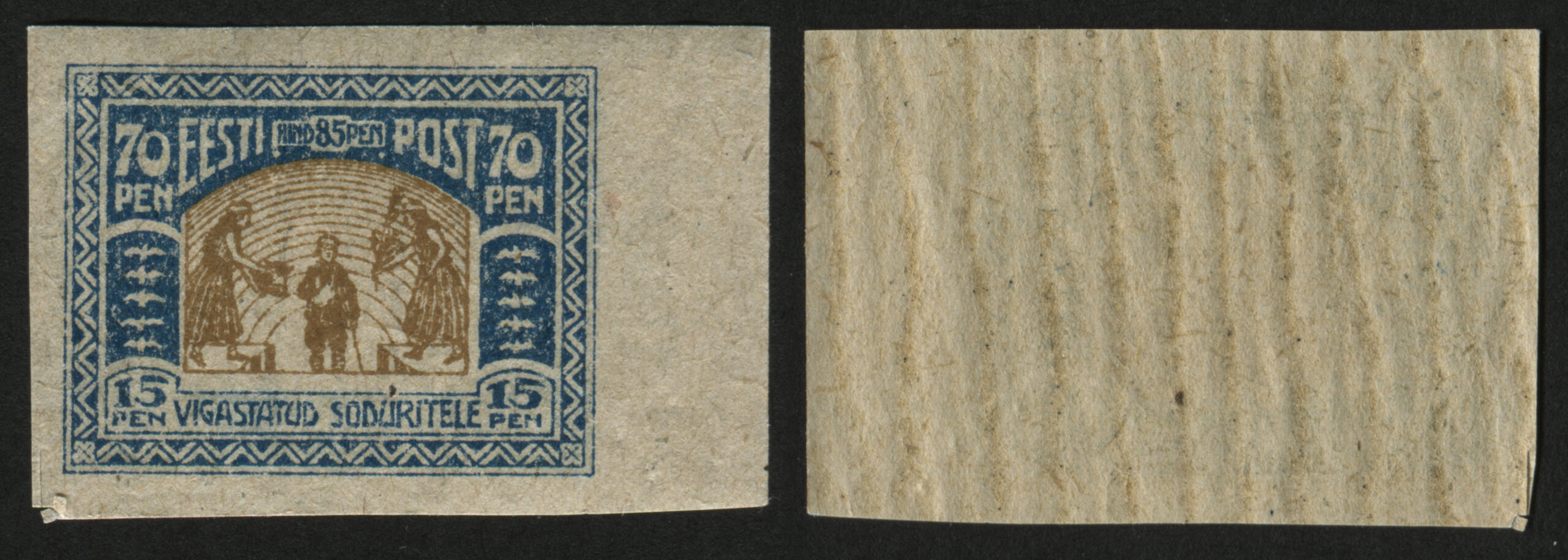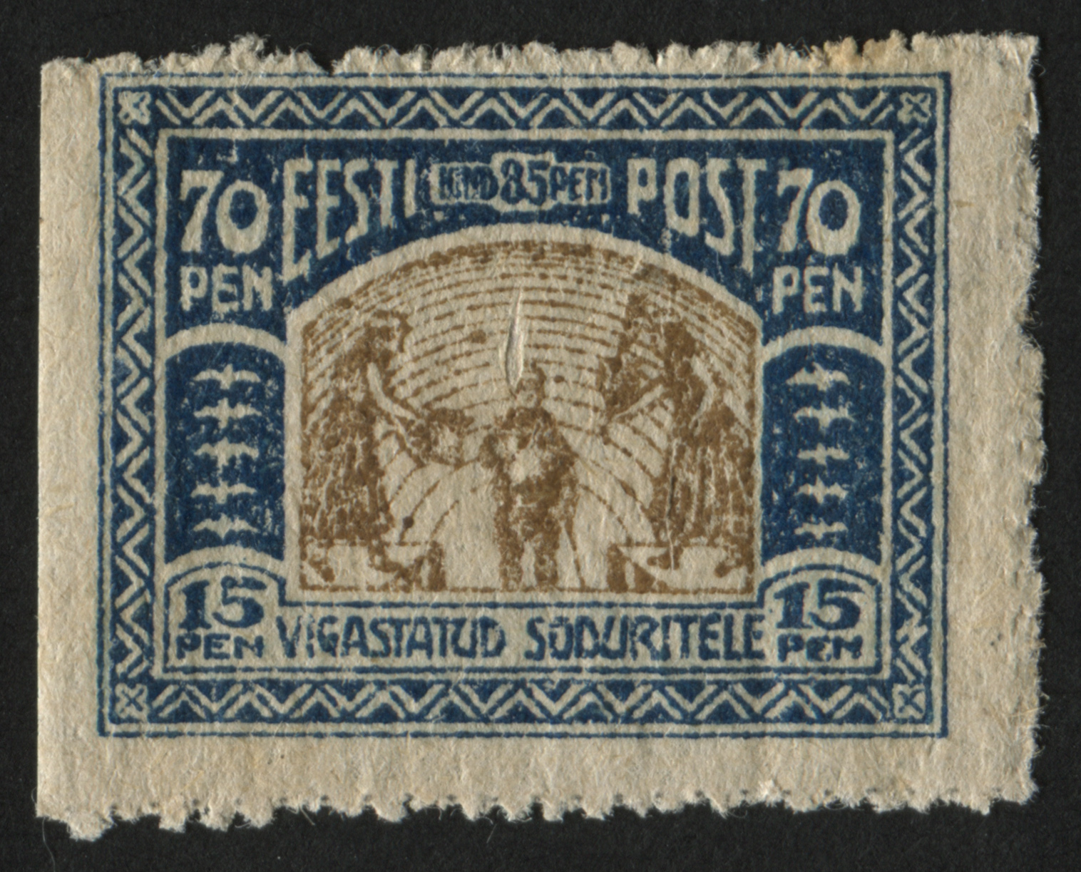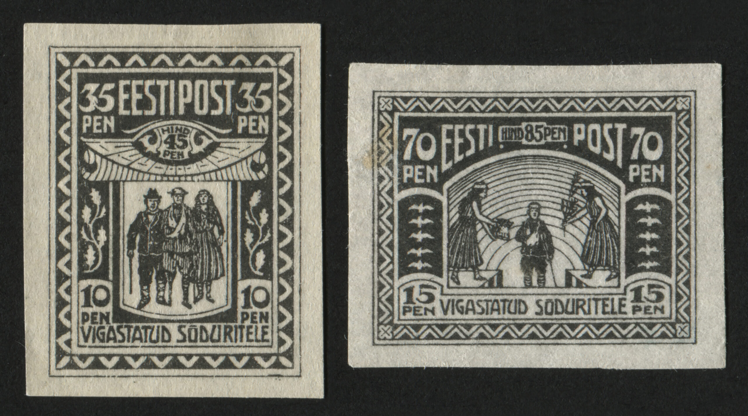 Vigastatud sõduritele Eesti esimesed juurdemaksuga margid „Vigastatud sõduritele“ anti välja 22. juunil 1920 (70 + 15 penni) ja 26. juunil 1920 (35 + 10 p). Need kehtisid kuni 30. juunini 1926. Sügisel 1920 tehti postmarkidele ületrükk. 6. oktoobril tulid käibele margid ületrükiga 2 marka (70 + 15 p) ja 6. novembril ületrükiga 1 mark (35 + 10 p). Markide postimüük toimus kuni 31. detsembrini 1921, ilma lisamaksuta võeti need taaskasutusele 27. aprillil 1922. Margid nominaaliga 1 mark kehtisid 31. märtsini 1926 ja 2 marka kuni 31. detsembrini 1940.