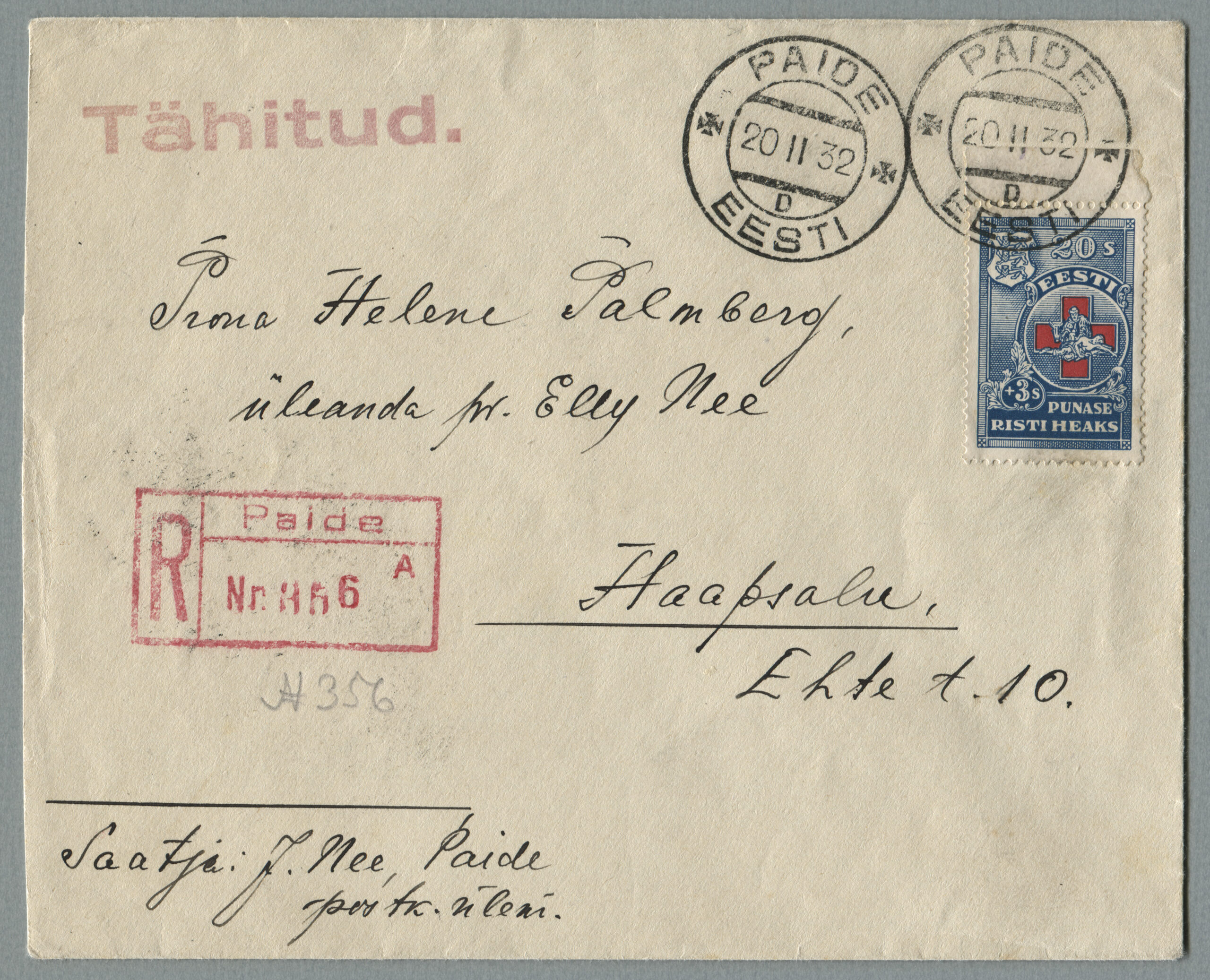 ErakoguTähitud kiri Paidest 20.02.1932 Haapsalu. Siseriiklik tariif oli 20 senti (1.01.1928–1.01.1935)