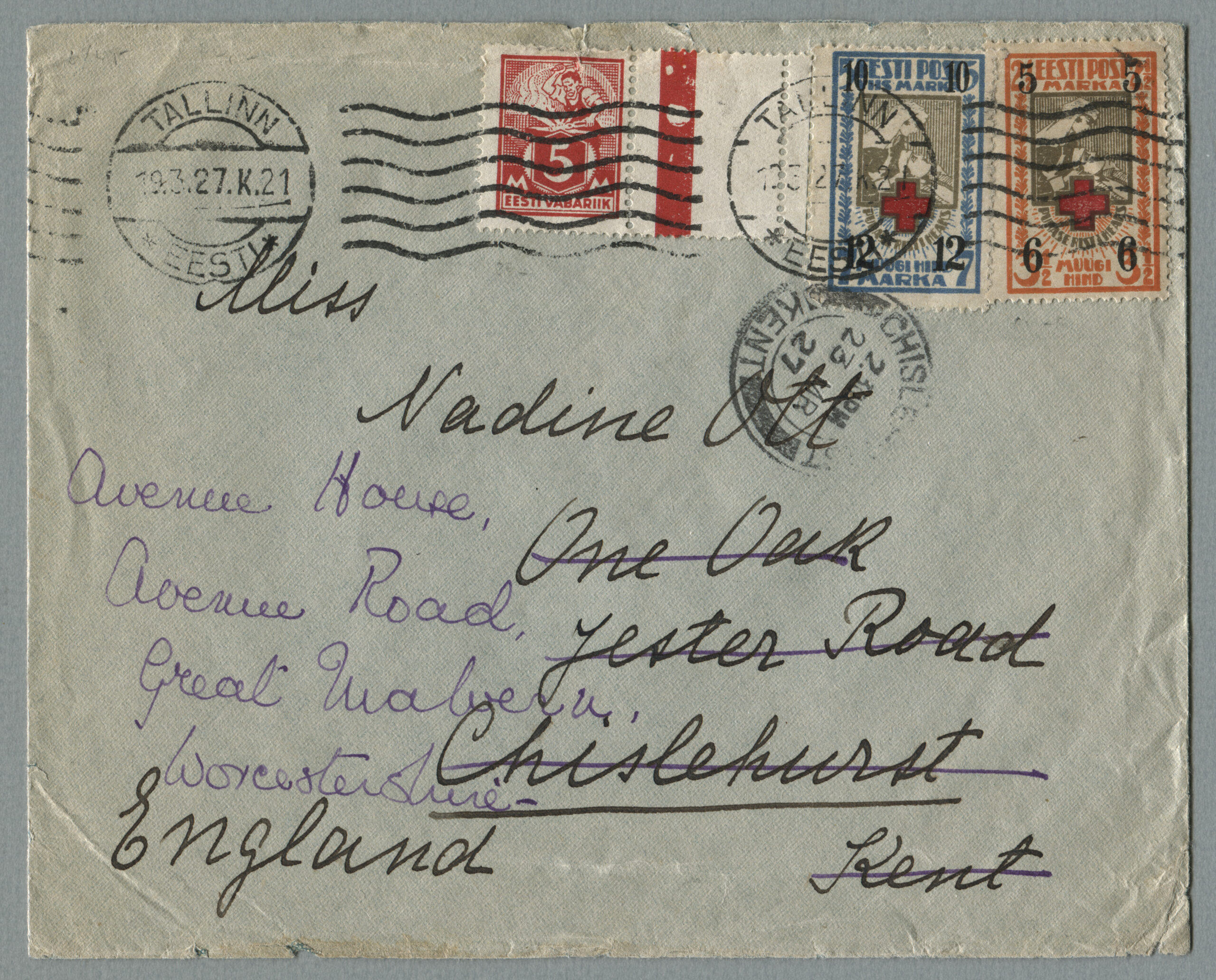 ERMi koguRahvusvaheline kiri Tallinnast 19.03.1927 Kenti (Inglismaa). „Punase Risti heaks“ ületrükiga margid on ümbrikul haruldased.