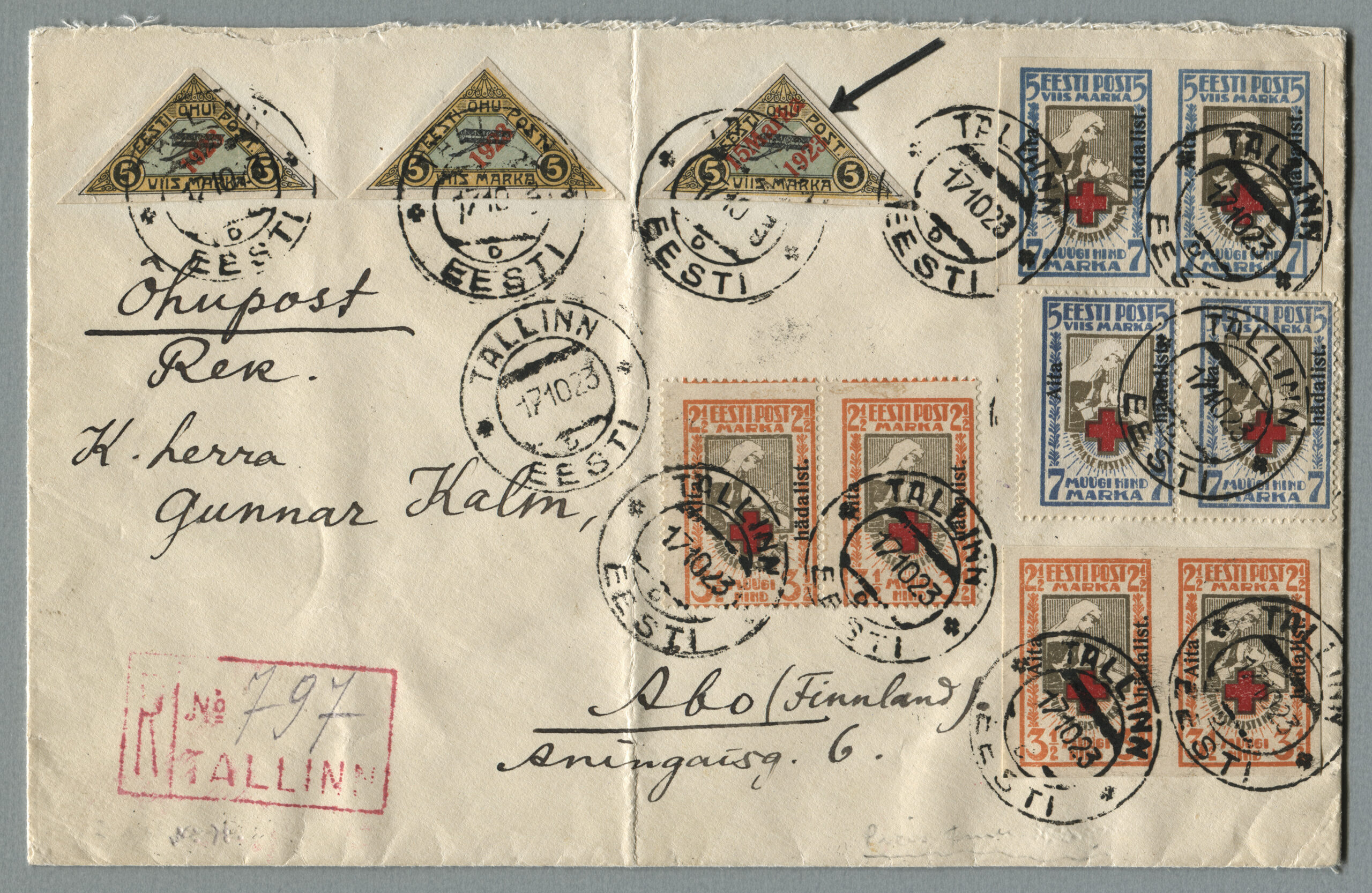 ErakoguRiigi Teataja nr 119, 8.10.1923, lk 851Tähitud õhupostikiri Tallinnast 17.10.1923 Abosse (Soome) 18.10.1923. Tariif 15 + 30 marka kehtis 1.11.1922–1.01.1924. Perforeeritud ületrükiga „Aita hädalist“ margid on kirjal haruldased. Ümbrikul on kõik sarja margid (lõigatud, hammastatud).