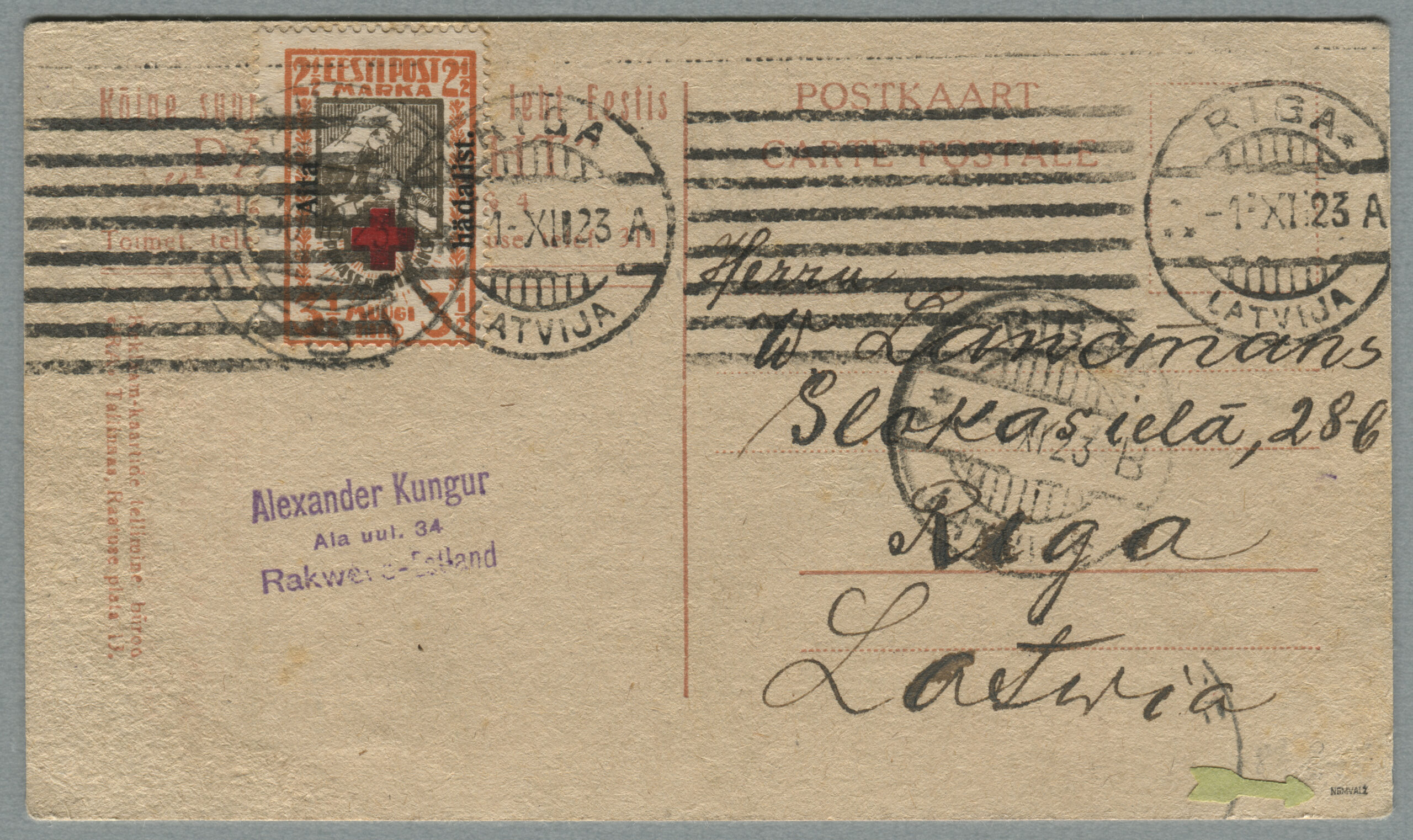 ErakoguPostkaart on saadetud Rakverest 30.11.1923 Riiga 1.12.1923. Siseriiklik tariif oli 2,5 marka, sama kehtis Läti ja Leedu kirjade puhul.
