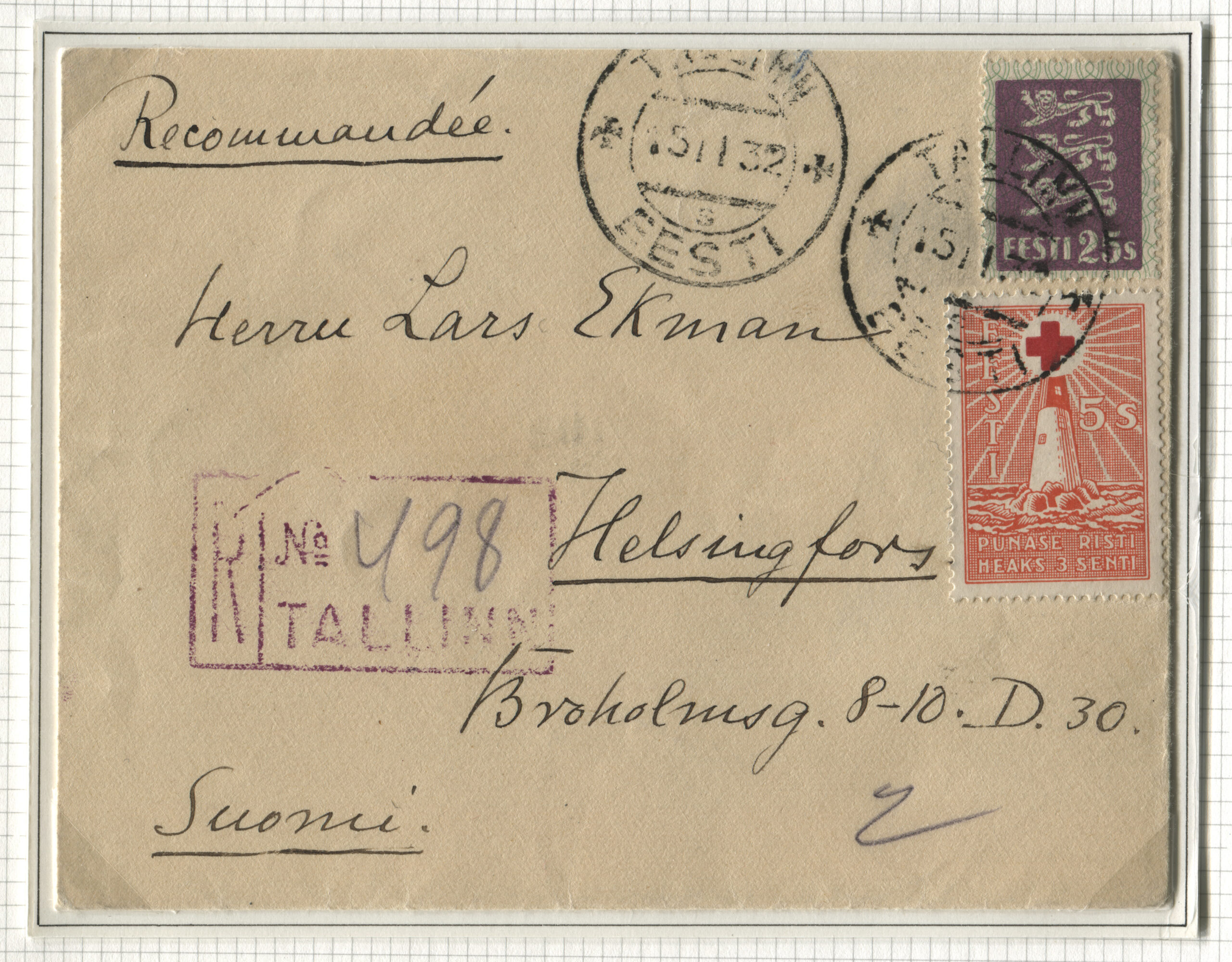 ErakoguTähitud kiri Tallinnast 15.02.1932 Helsingisse 18.02.1932.
