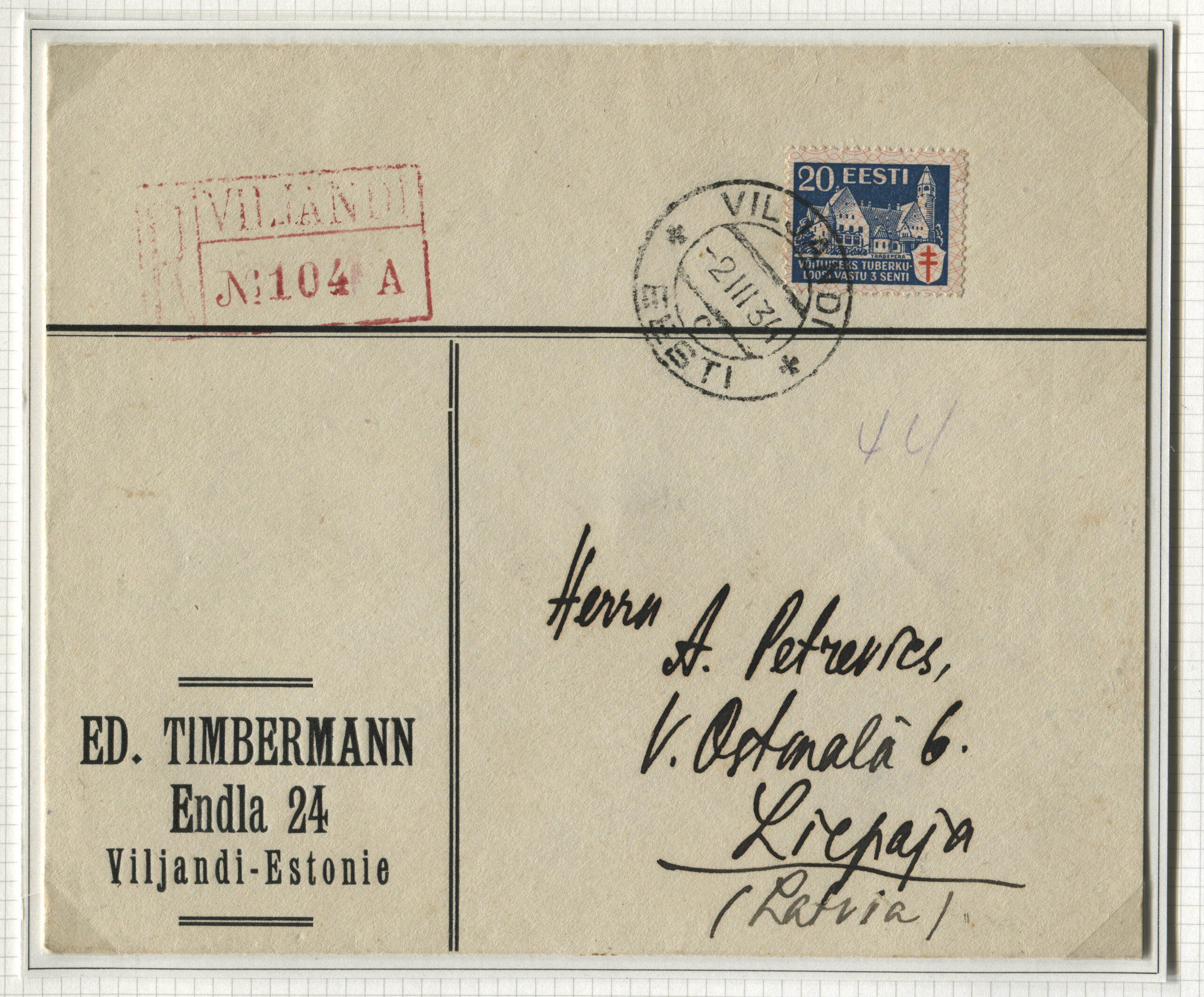 ERMi koguTähitud kiri Viljandist 2.03.1934 Liepajasse 3.03.1934. Heategevusväljaanne võitluseks tuberkuloosi vastu, 1.10.1933.