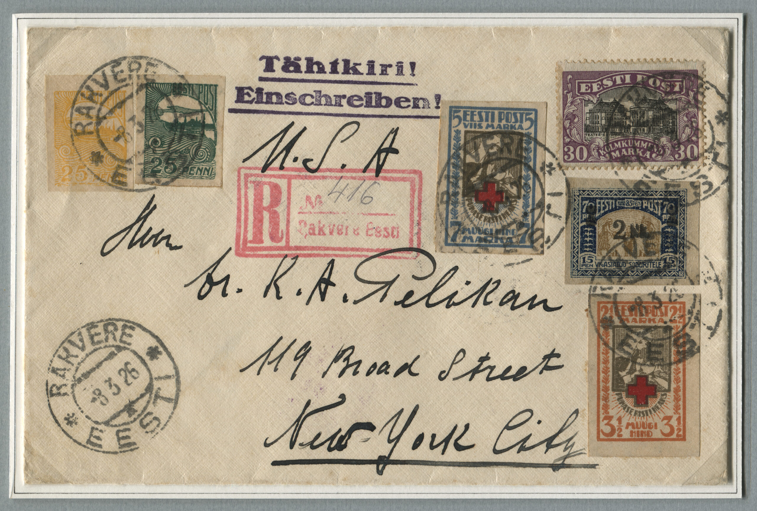 ErakoguRiigi Teataja nr 49, 5. juuni 1926, lk 652Tähitud kiri on saadetud Rakverest 8.03.1926 New Yorki.