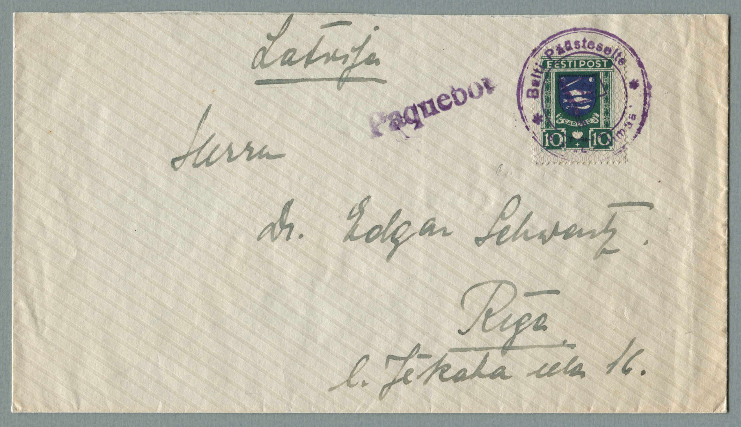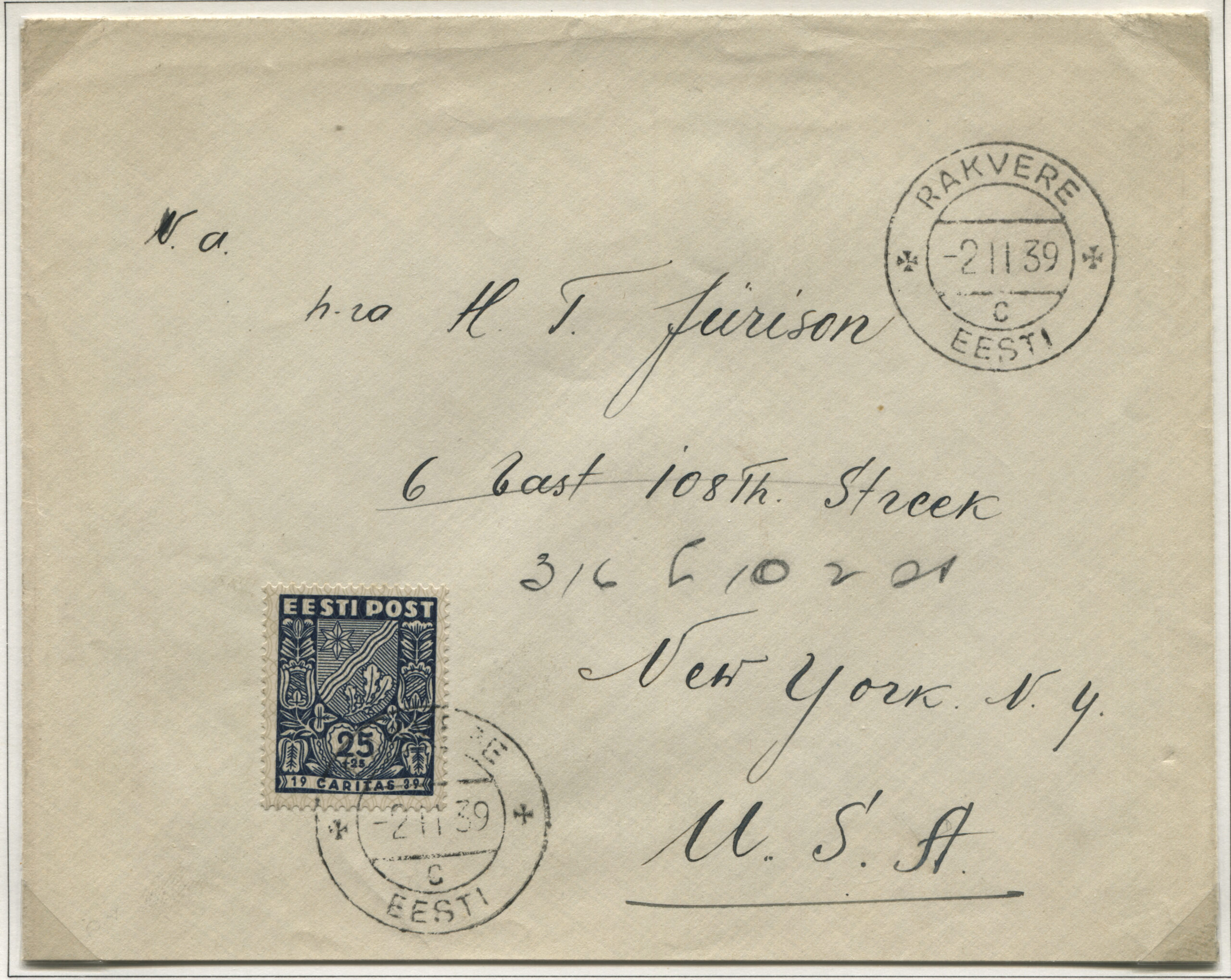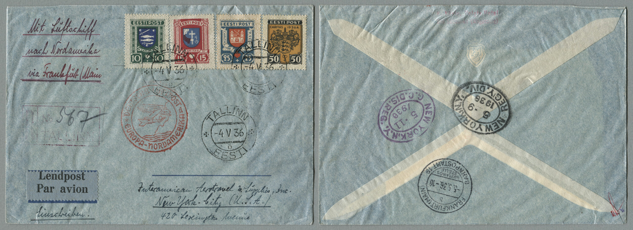 ERMi koguRahvusvahelise Margikogujate Seltsi ajakiri Estonia nr 13, 12.05.1936, lk 12Rahvusvaheline tähitud õhupostikiri, saadetud Tallinnast 4.05.1936 (Frankfurt 5.05. 1936) New Yorki 5.11.1936