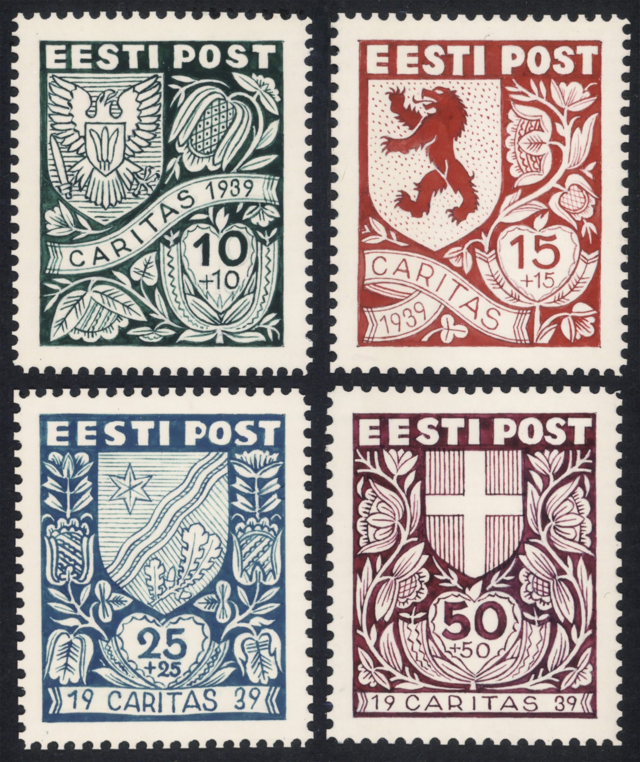 Caritas. Heategevusväljaanne Ühisabi heaks. Eesti maakondade vapid. Saaremaa, Läänemaa, Järvamaa ja Võrumaa vapp. 2.01.1940, kujundanud Günter Reindorff.