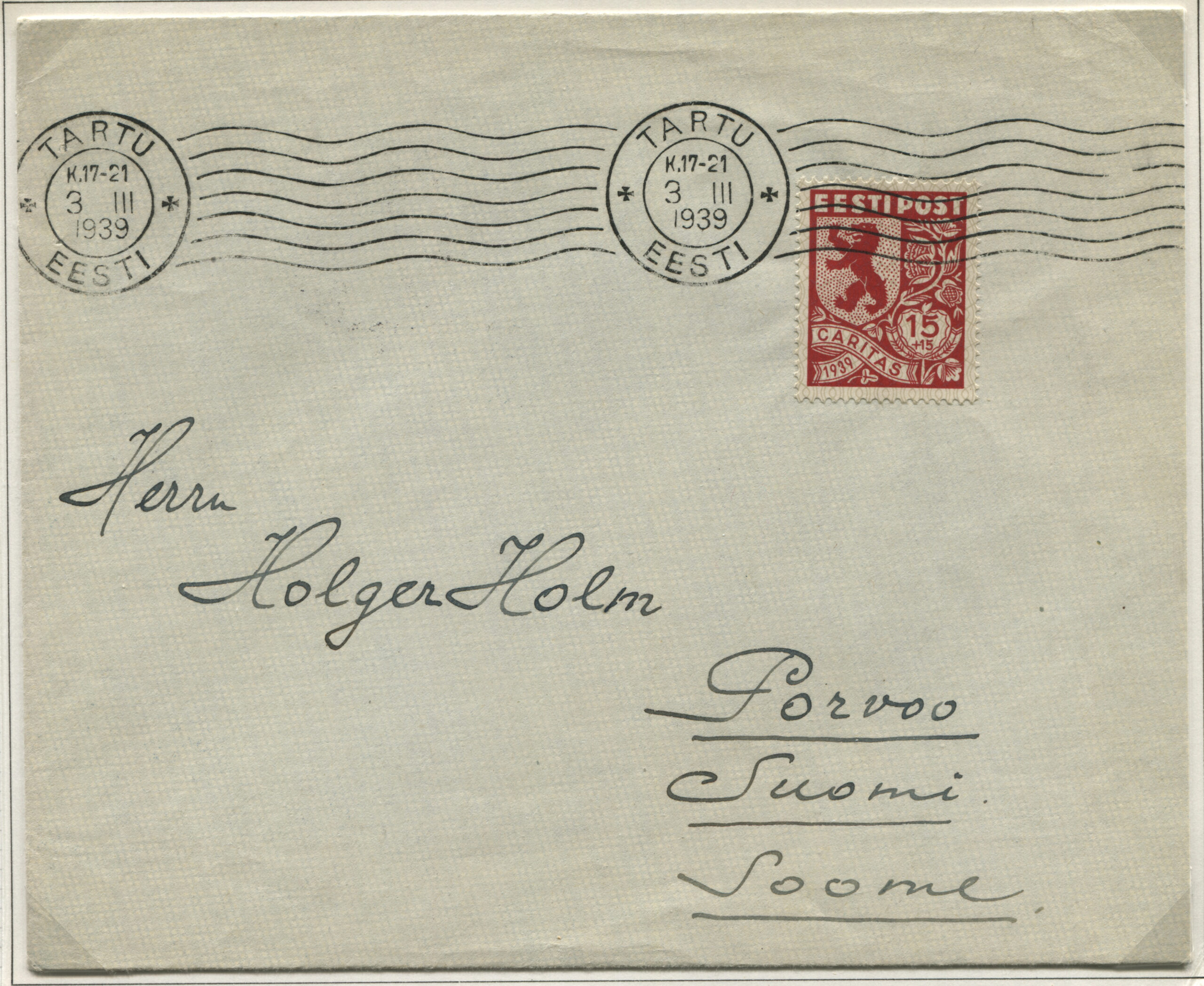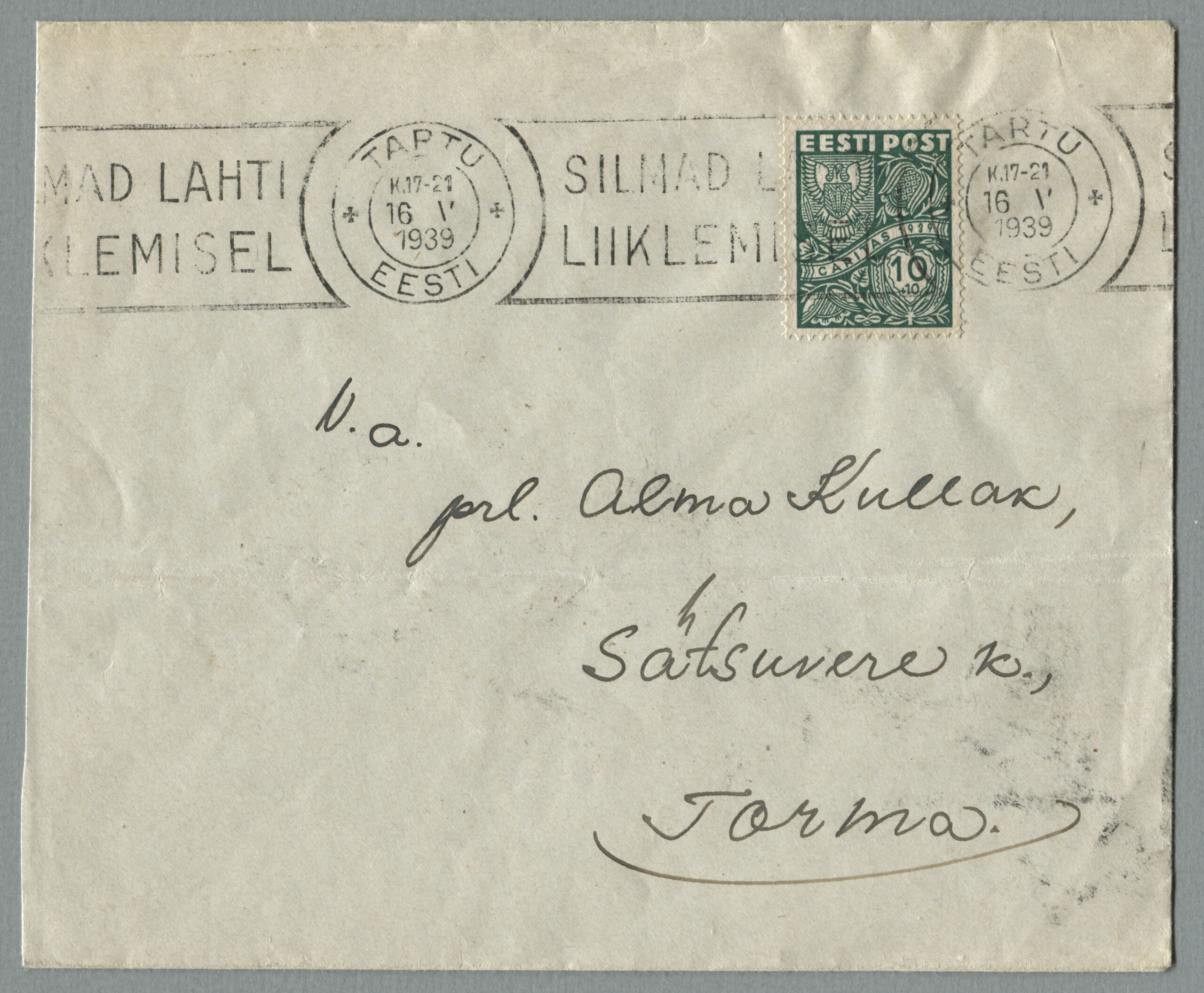 Tähitud kiri Tartust Tallinna, tempel „Tartu II AG, 19.09.1939“.