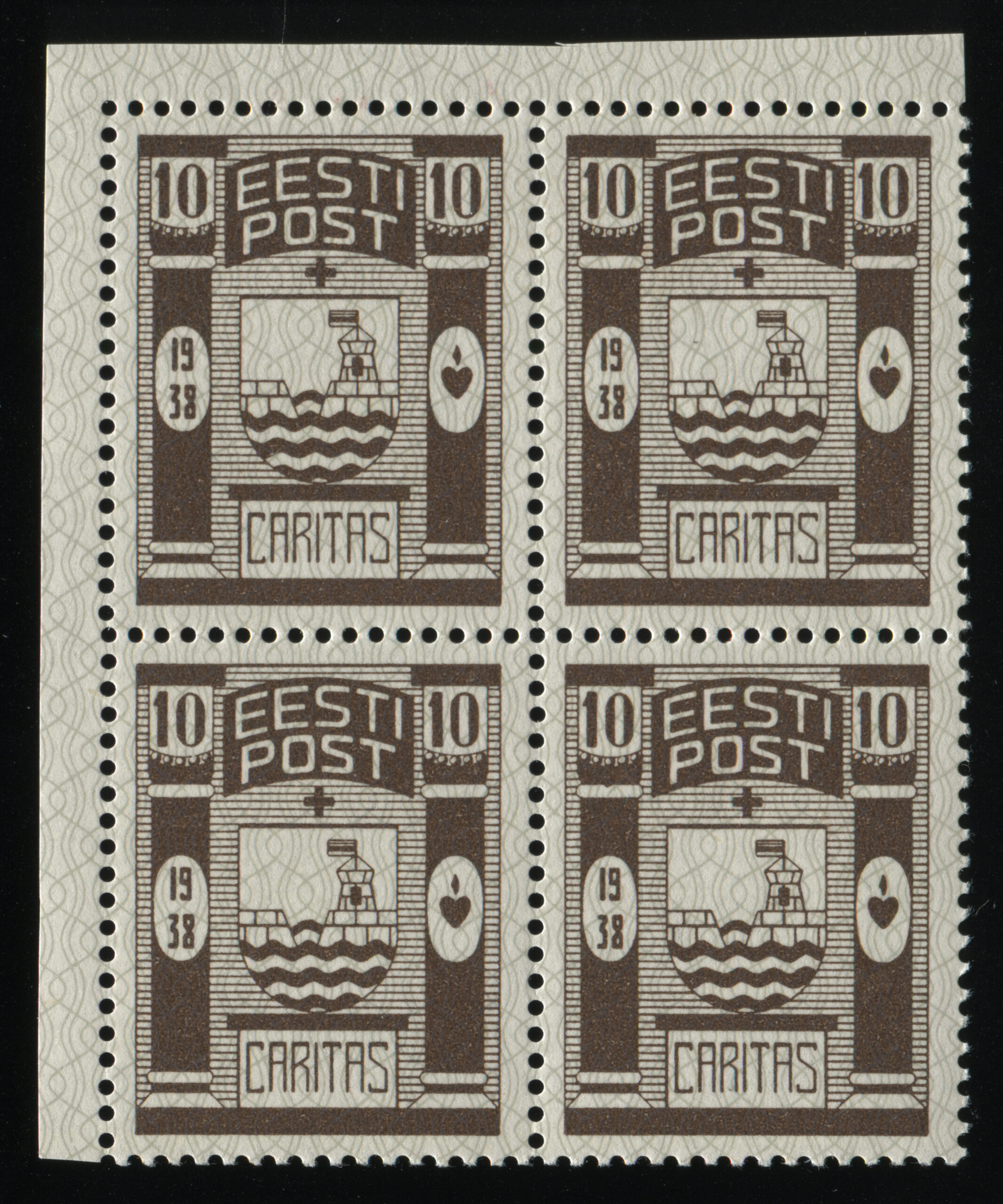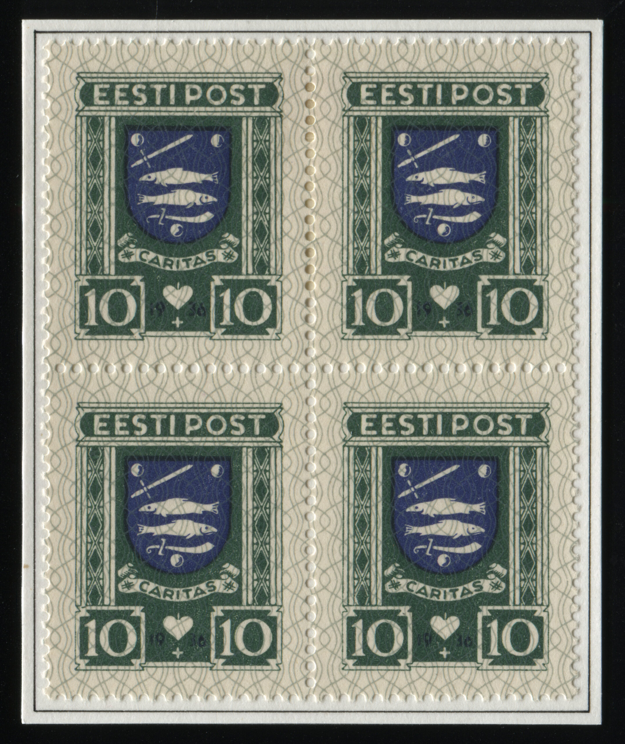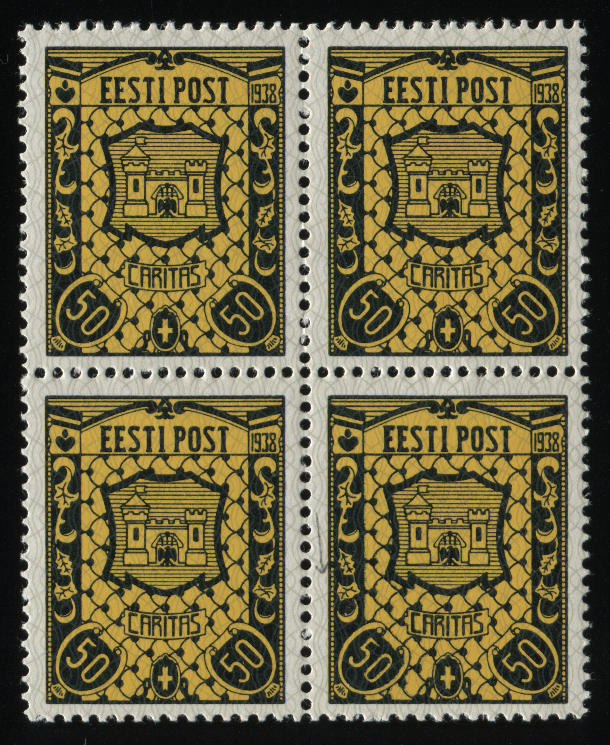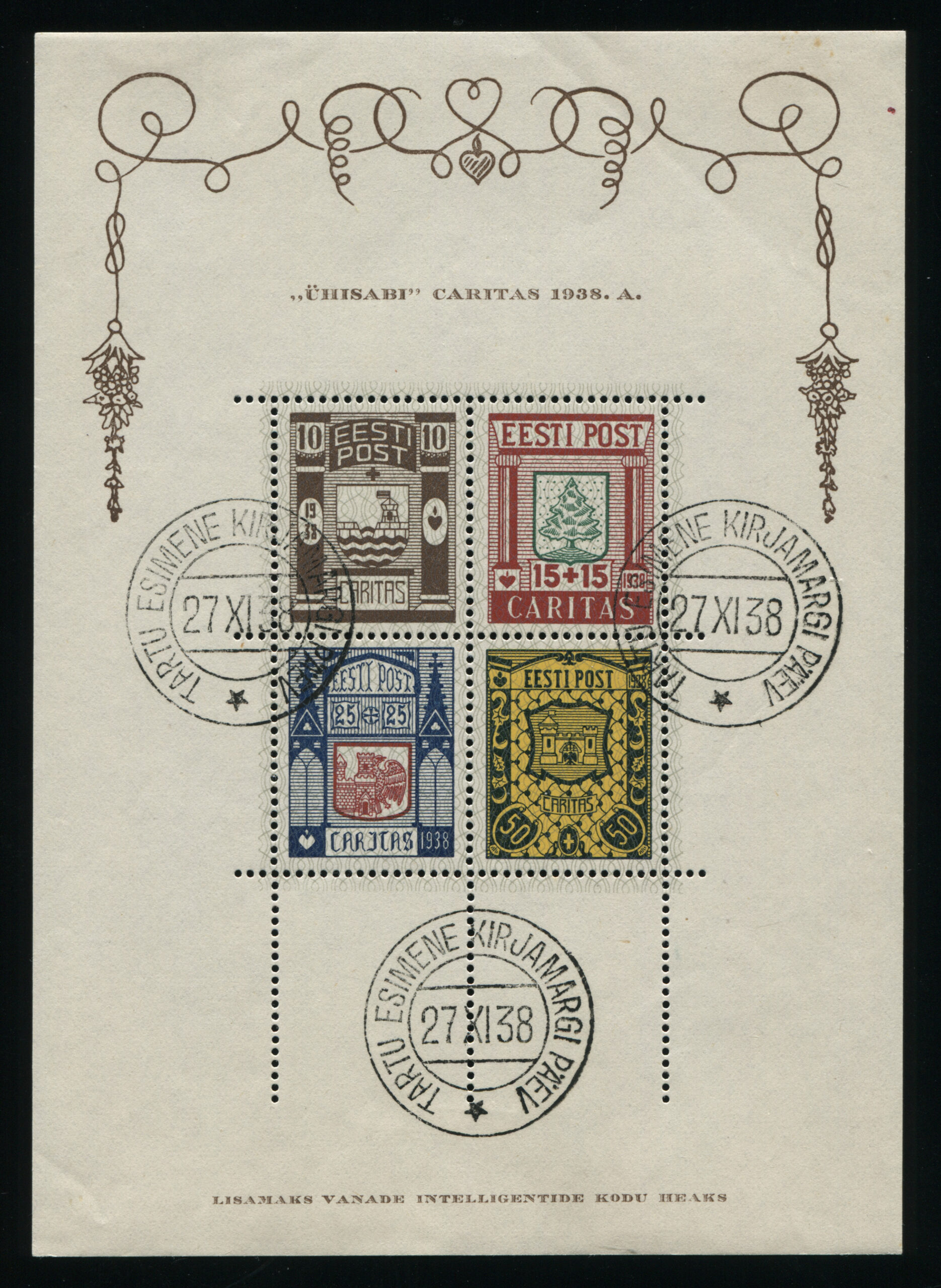 ERMi koguCaritas. Heategevusväljaanne „Ühisabi“ heaks. Eesti linnade vapid. Margiplokk, 21.01.1938, kujundanud Mihail Sidorov.