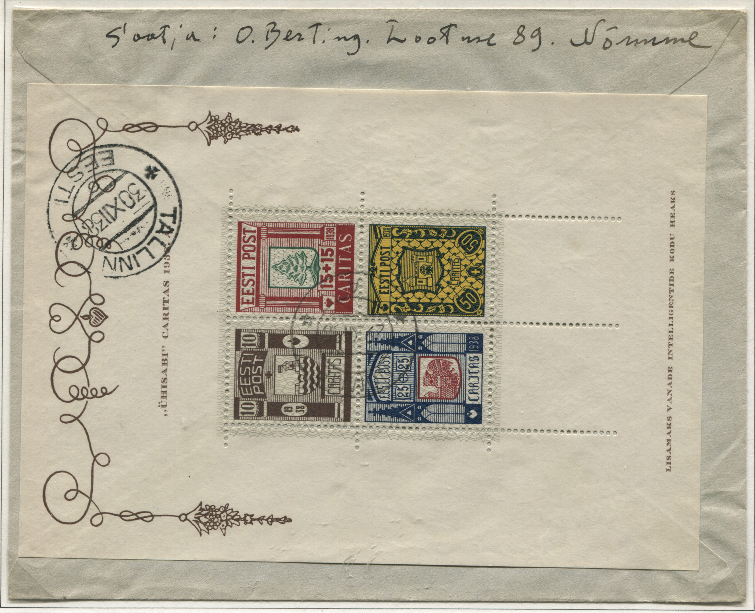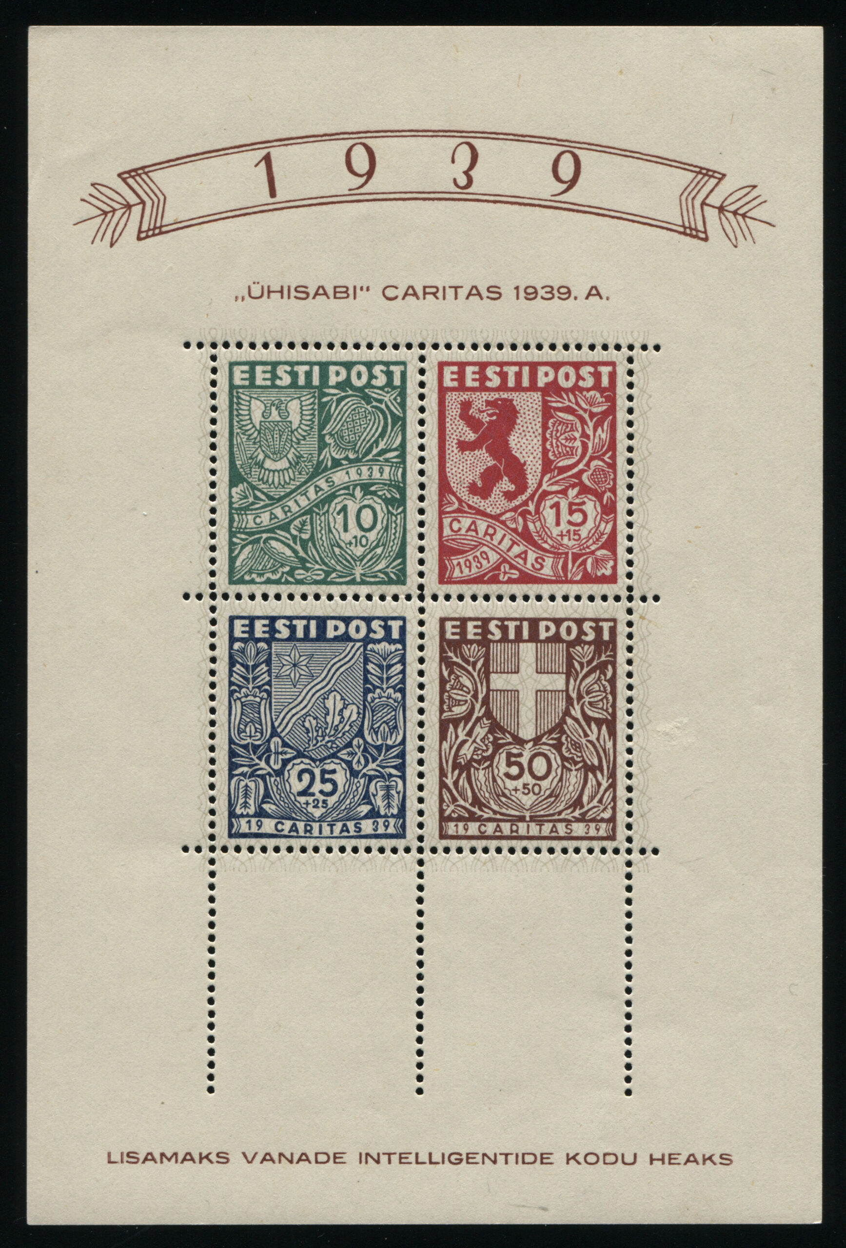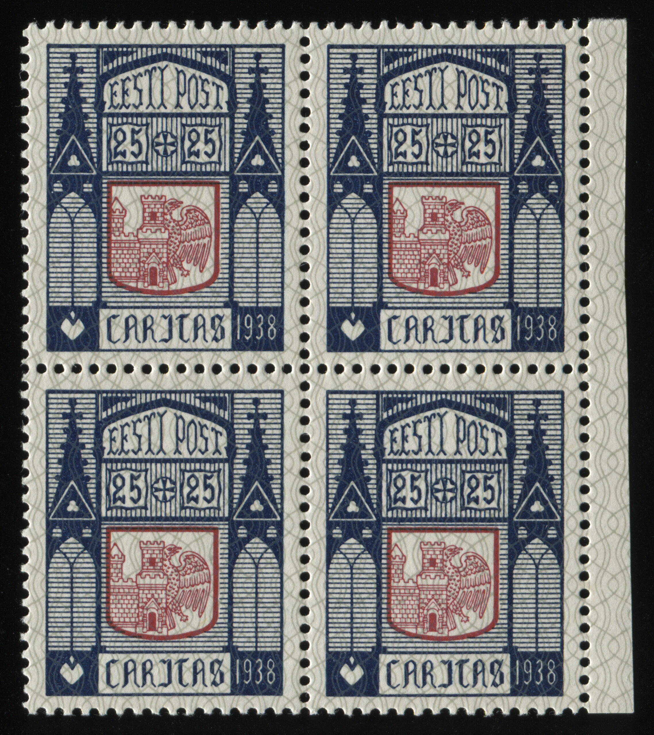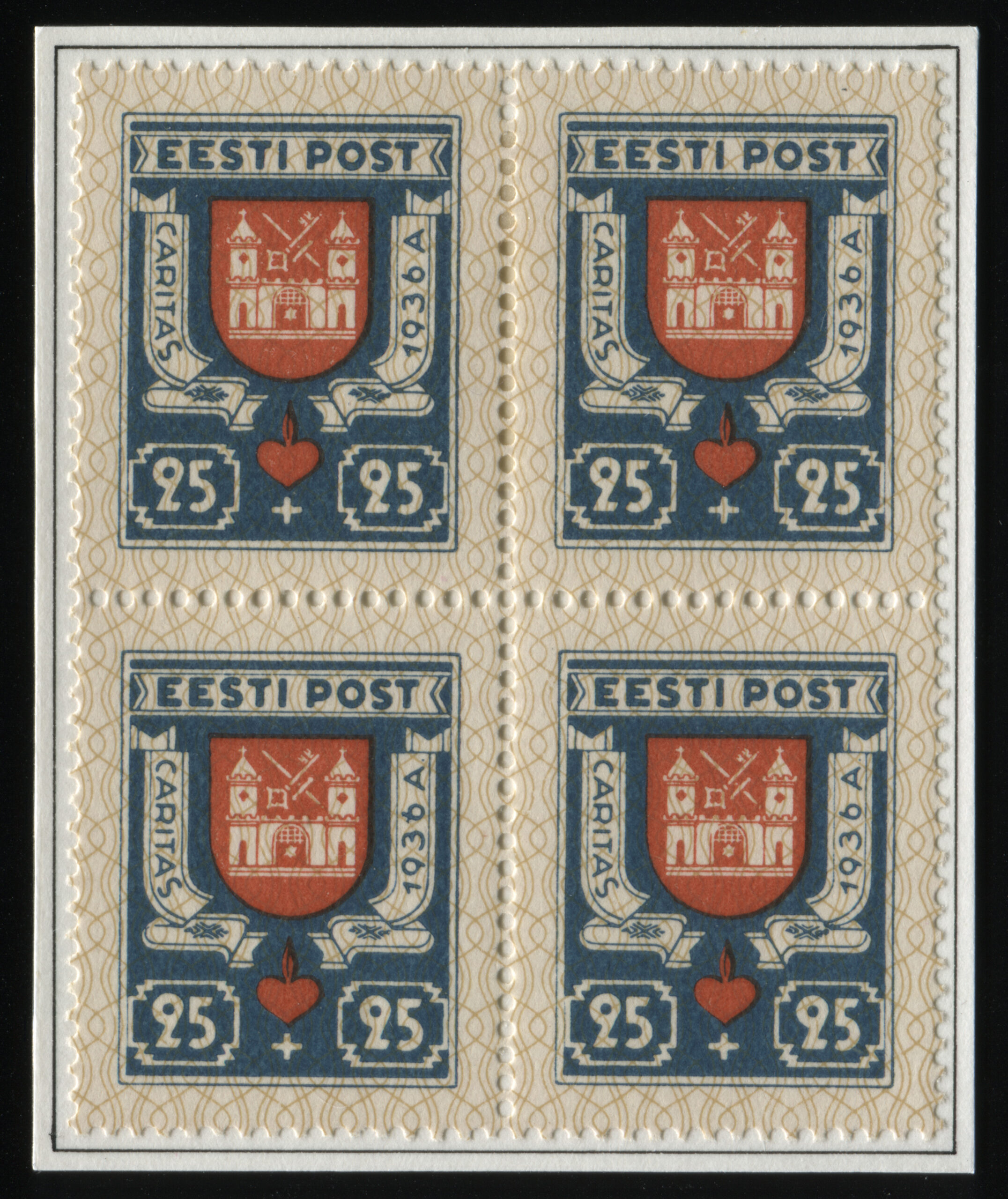 ERMi koguCaritas. Heategevusväljaanne „Ühisabi“ heaks. Eesti linnade vapid. Margiplokk, 21.01.1938, kujundanud Mihail Sidorov.
