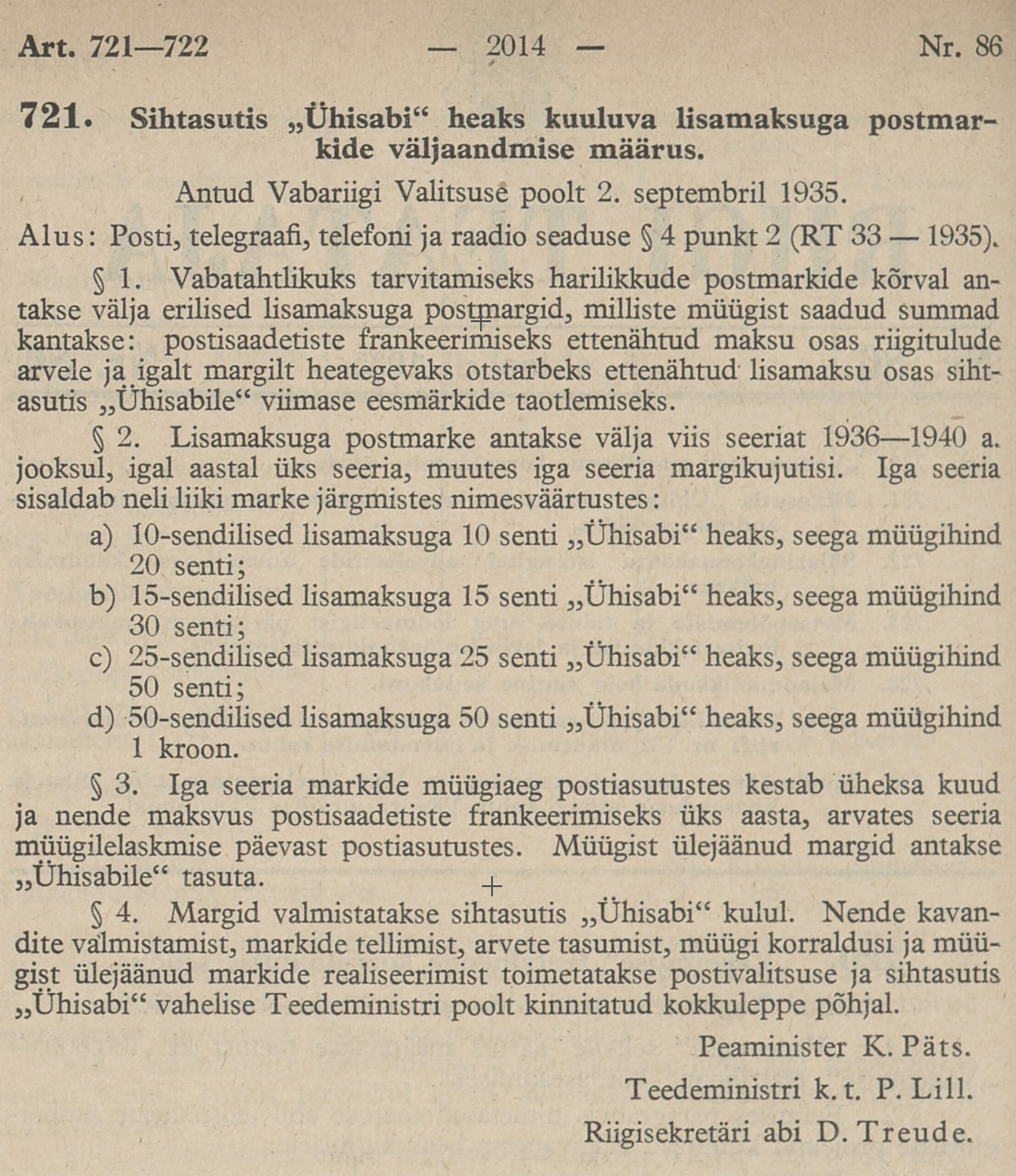 Riigi Teataja nr 86, 1935, lk 2014 Riigi Teataja Lisa, nr 14, 16.02.1932, lk 1–3 Riigi Teataja Lisa, nr 105, 9.12.1938, lk 1–2 Riigi Teataja Lisa, nr 4, 13.01.1939, lk 1–2 Riigi Teataja nr 109, 28.12.1939, lk 1–2 Eesti Filatelist nr 30, 1984, lk 2–27 Rahvusvahelise margikogujate Seltsi ajakiri Estonia, Tallinn. Nr 12 (1936), nr 19 (1937), nr 20/21 (1938), nr 5 (1939) ja nr 27 (1940) Hurt, Vambola; Ojaste, Elmar. Eesti. Estonia. Philately & postal history handbook. Catalogue. Stockholm, New York: Estonian Philatelic Society, 1986 Pärn, Peeter; Kuuskvere, Aivar. Eesti postmargid ja tervikasjad. Kataloog, Vapimark OÜ, 2021 Pekka, Erelt. Kas Pätsi ajal oli elu parem? Ekspress, 26.09.2009 Pärnumaa Teataja, 9. veebruar 1937, lk 7 Uus Elu, nr 39, 1937, lk 9 Uus Eesti, nr 122, 4. mai 1938, lk 3 Uus Eesti, nr 18, 19. jaanuar 1938, lk 2 Postimees nr 3, 4. jaanuar 1938, lk 6 Uus Eesti, nr 9, 10. jaanuar 1939, lk 3 Päewaleht, nr 35, 6. veebruar 1940, lk 8 Uus Eesti, nr 9, 10. jaanuar 1939, lk 3 Vaba Eesti Sõna (Free Estonian Word), 29. märts 1952, lk 4