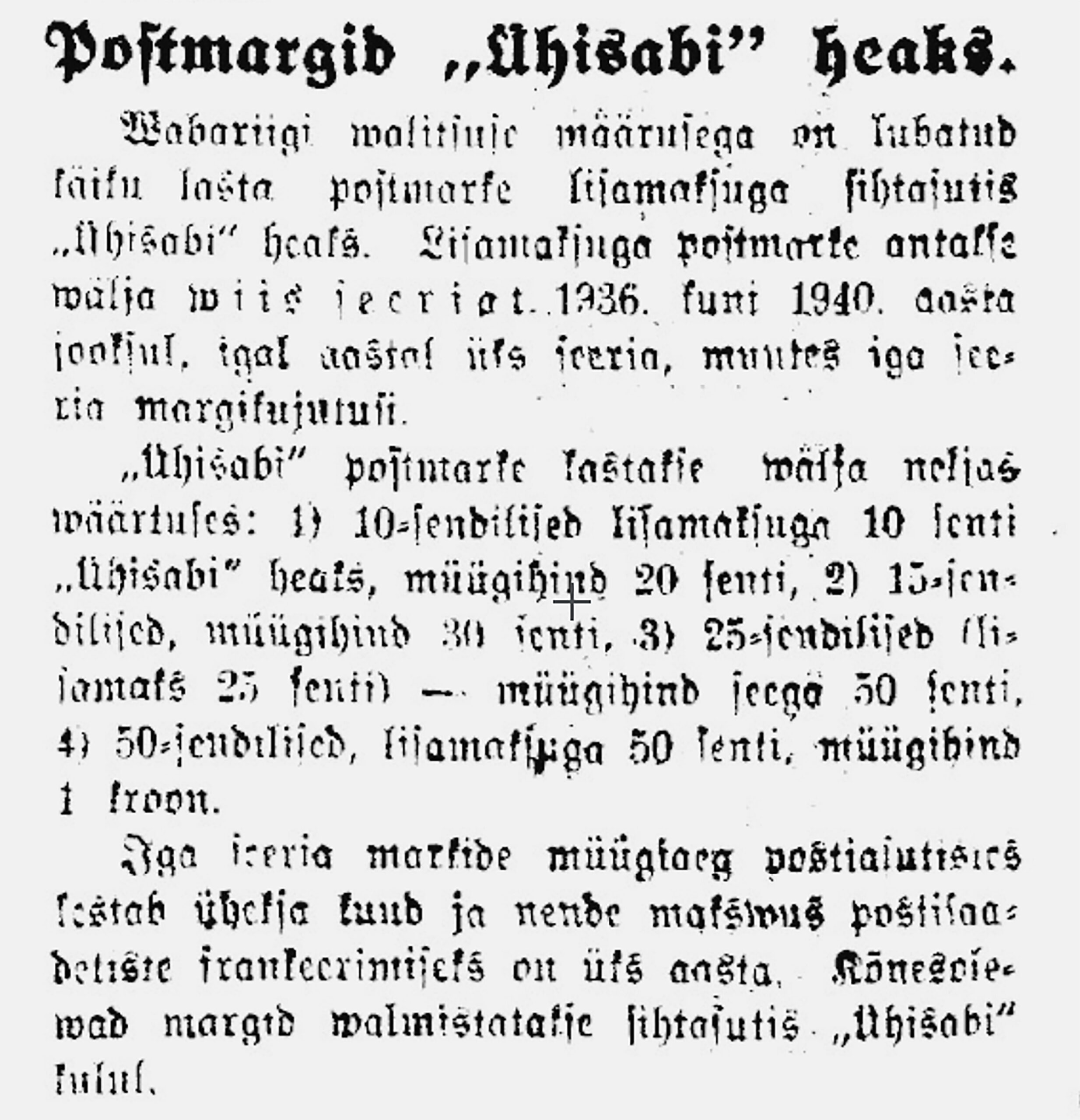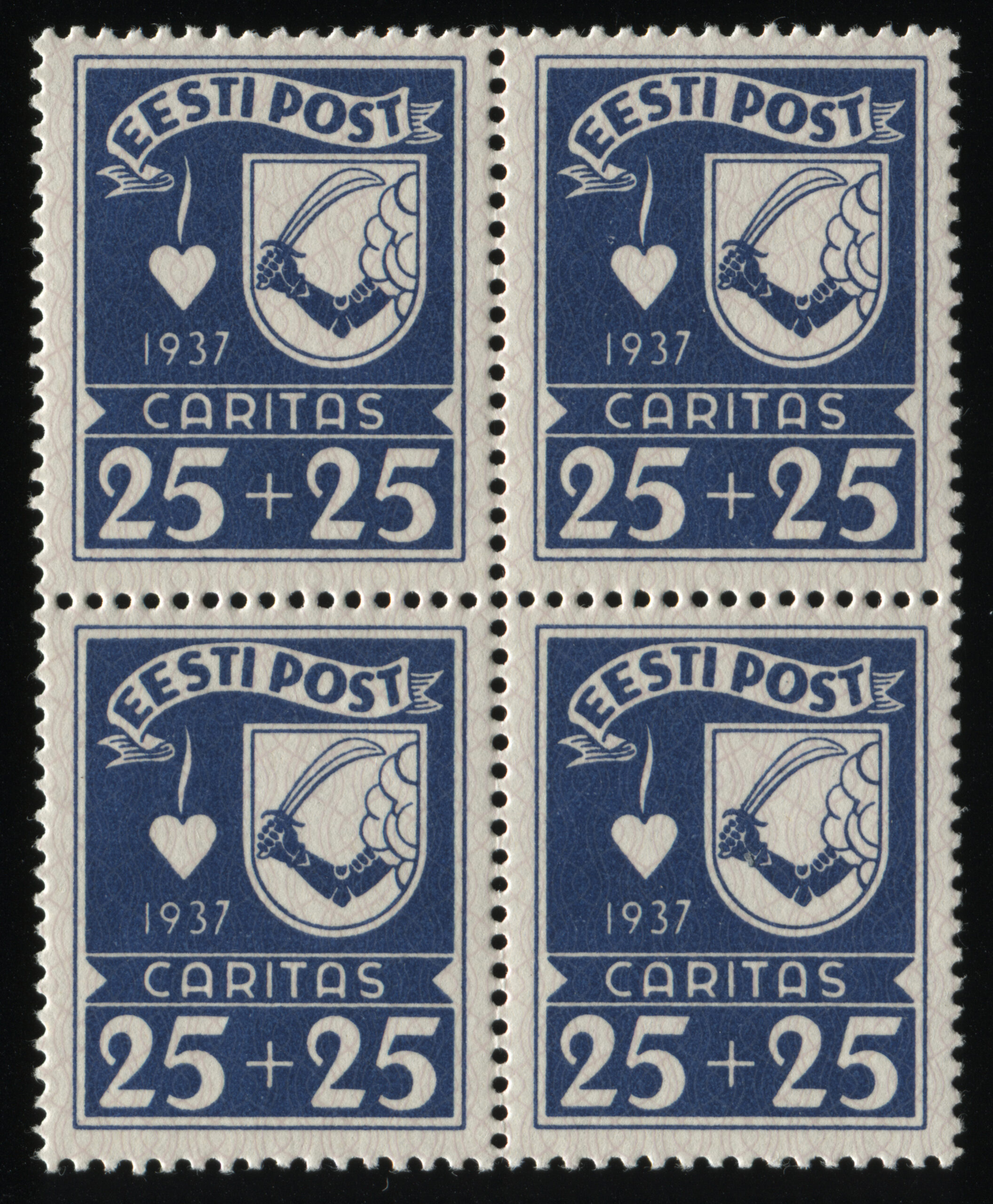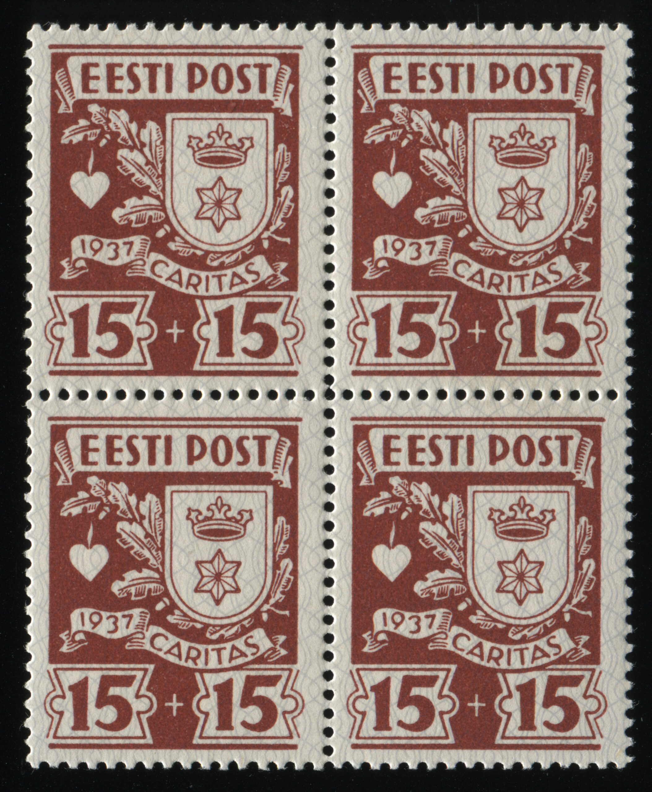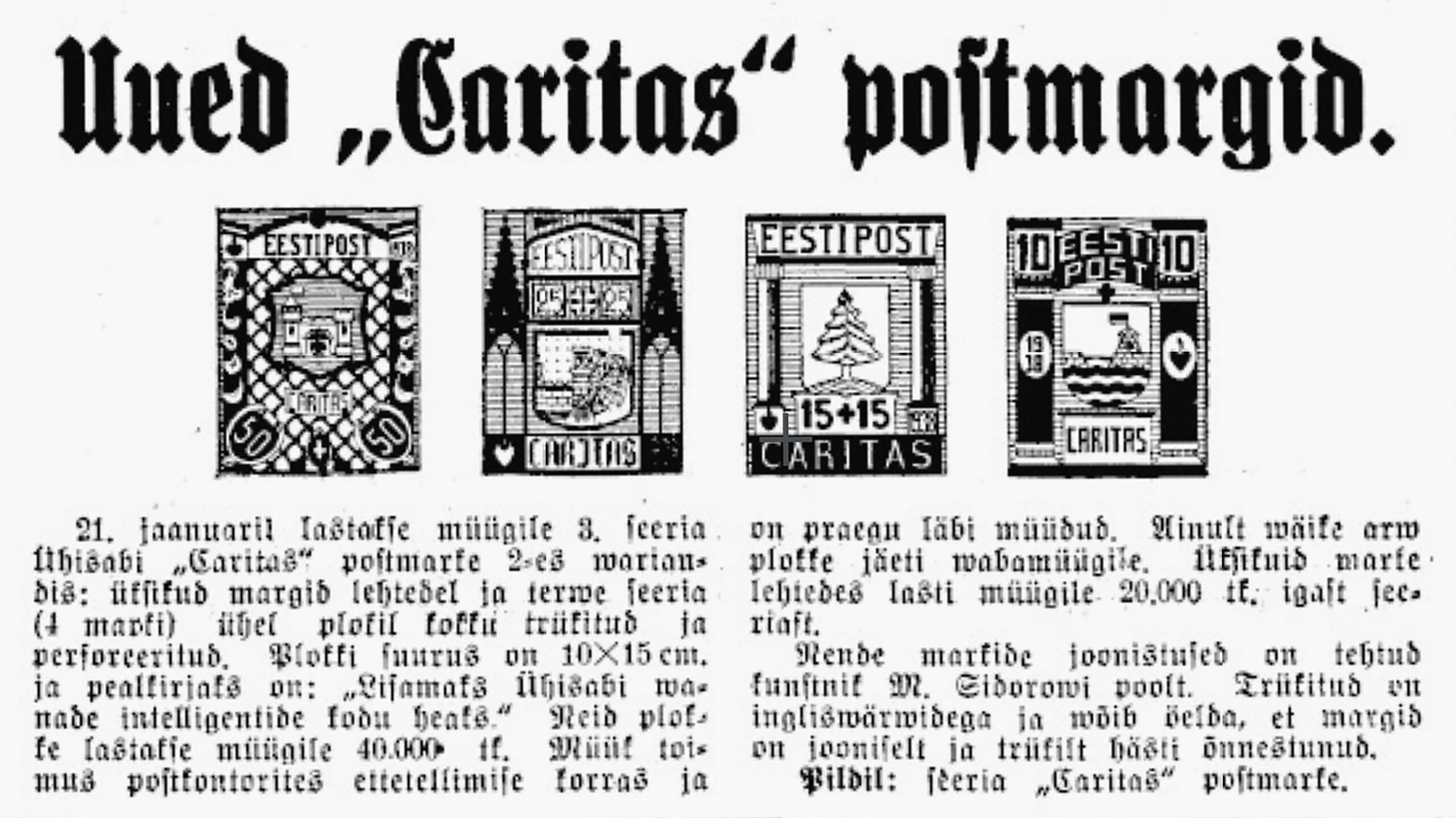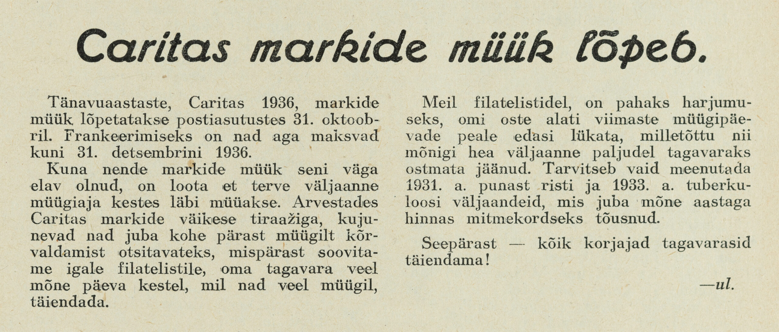Caritas postmarke trükiti 1936. aastal 320 000 ja need olid maksvad kuni käesoleva aasta 1. veebruarini. Aasta jooksul saadi postmarkidest tulu üle 50 000 krooni, millest 50 % läheb kokkuleppe kohaselt riigile“.