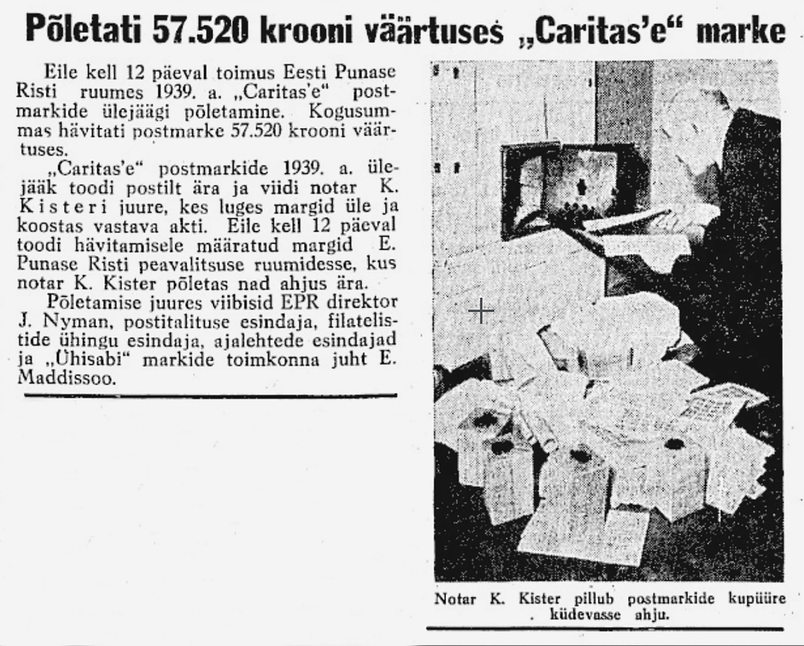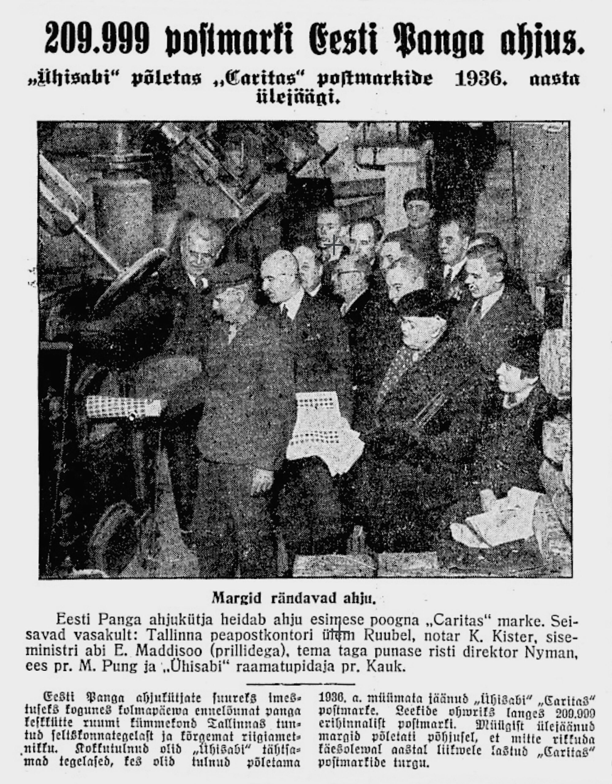 Eesti Panga ahjukütjate imestus oli suur, kui kütteruumi ilmusid äkki riigiametnikud. Siin on lõik ajalehest Uus Elu (nr 39,1937, lk 9): „Eesti Panga ahjukütjate suureks imestuseks kogunes kolmapäeva ennelõunat panga keskkütte ruumi kümmekond Tallinna tuntud seltskonnategelast ja kõrgemat riigiametnikku. Kokkutulnud olid „Ühisabi“ tähtsamad tegelased, kes olid tulnud põletama 1936. aasta müümata jäänud Caritas postmarke. Leekide ohvriks langes 209 999 erihinnalist postmarki. Müügist ülejäänud margid põletati põhjusel, et mitte rikkuda käesoleval aastal liikvele lastud Caritas markide turgu.
