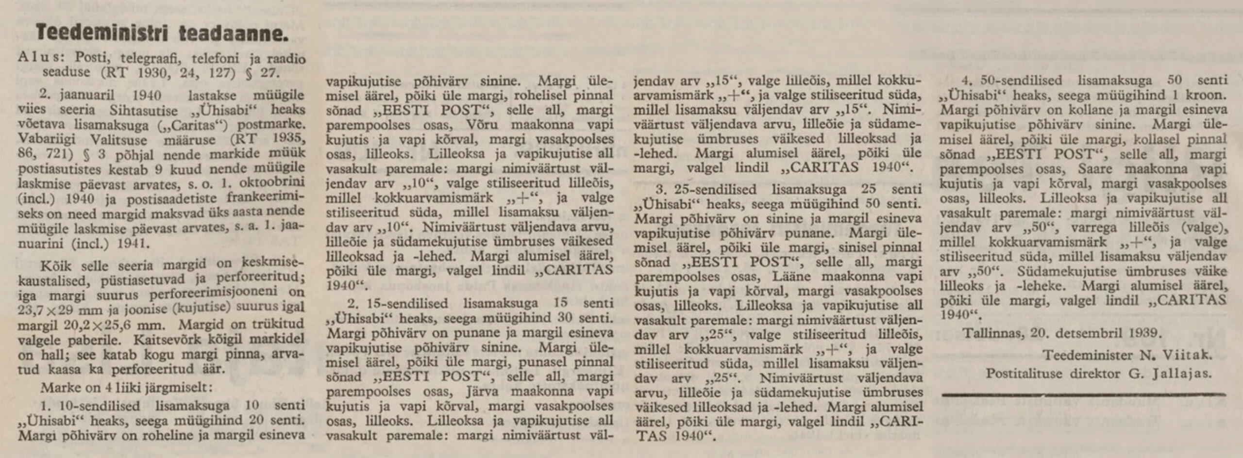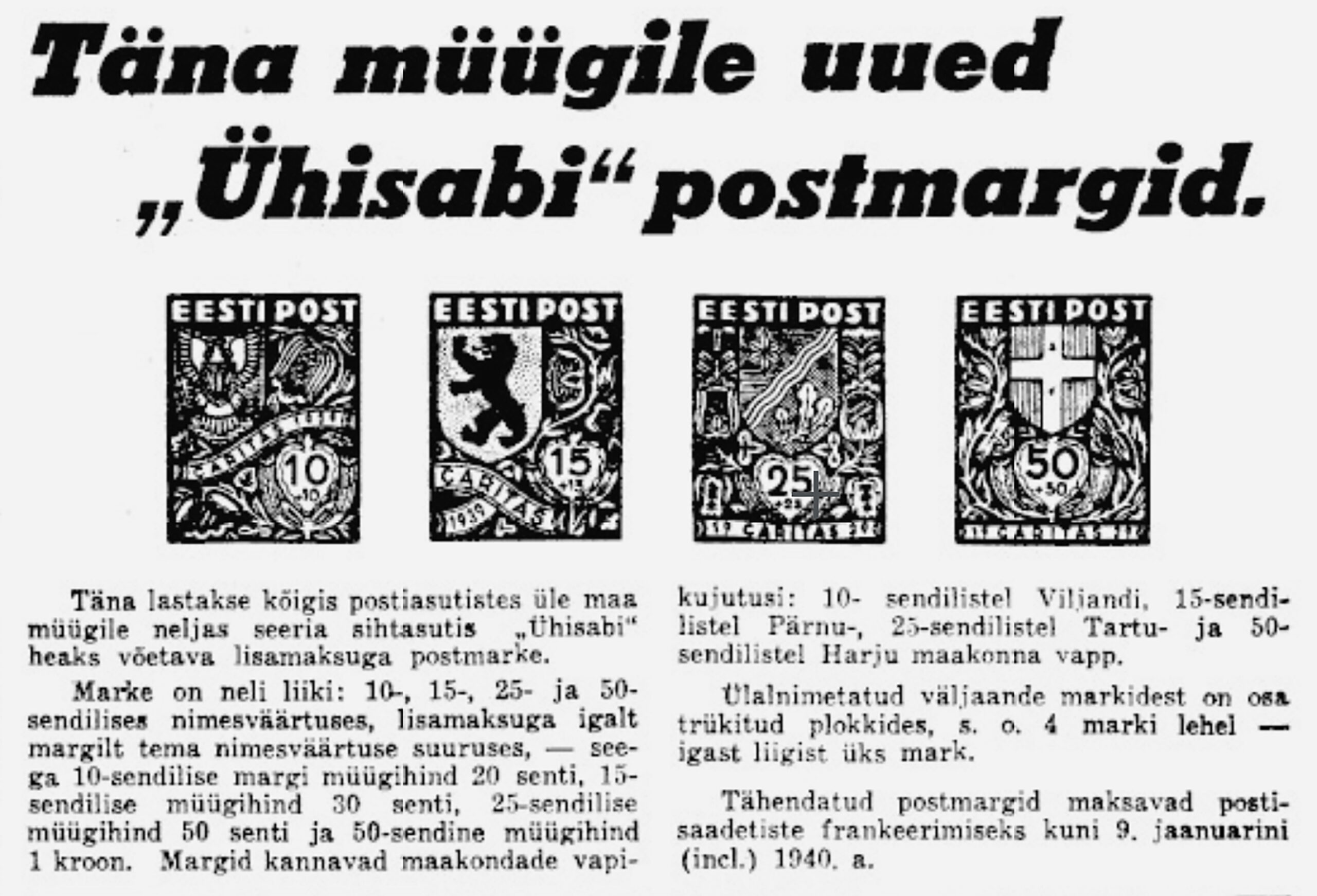 Margid olid müügil 10.01.–10.10.1939, postimaksevahendina kehtisid need kuni 10.01.1940.
