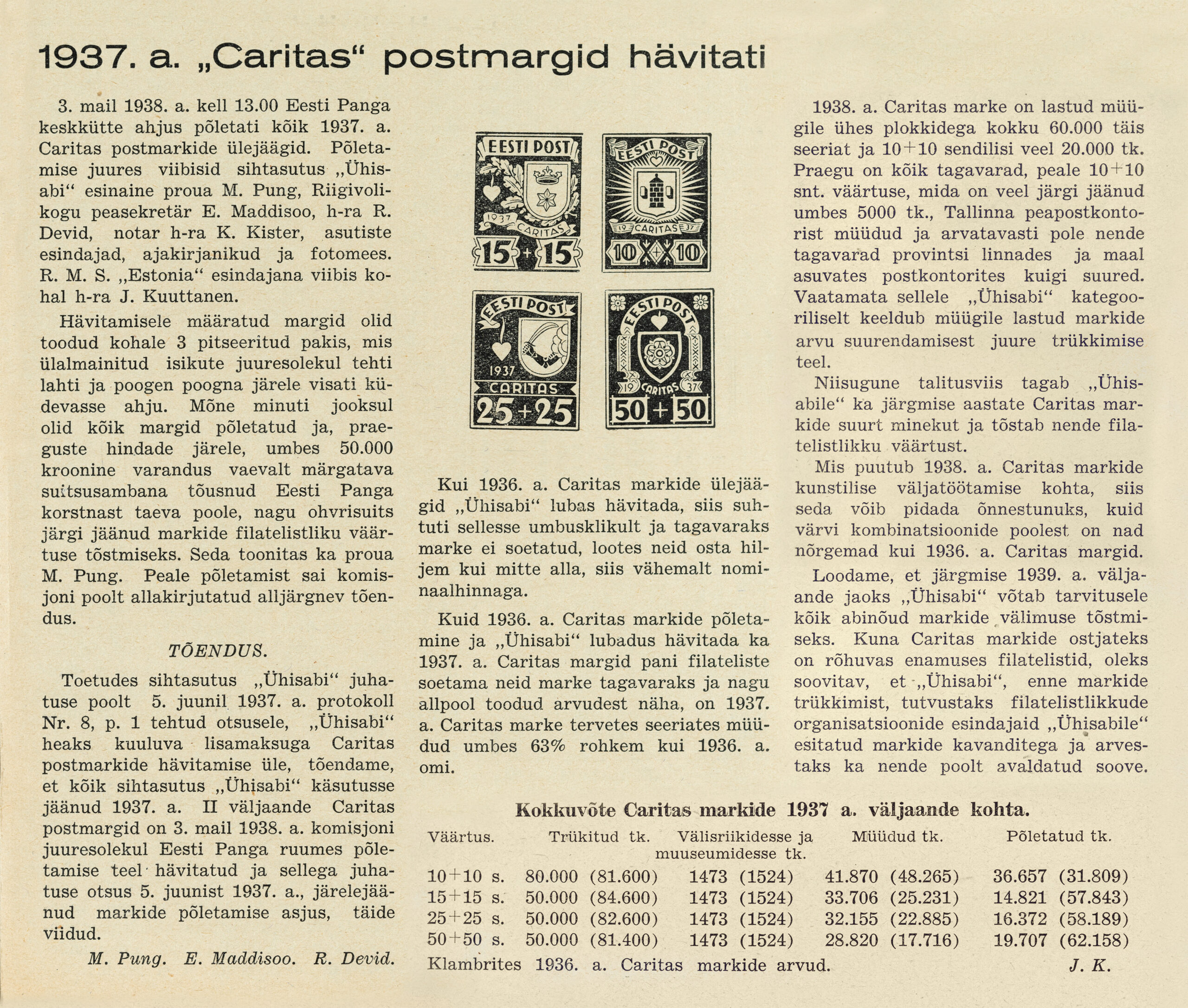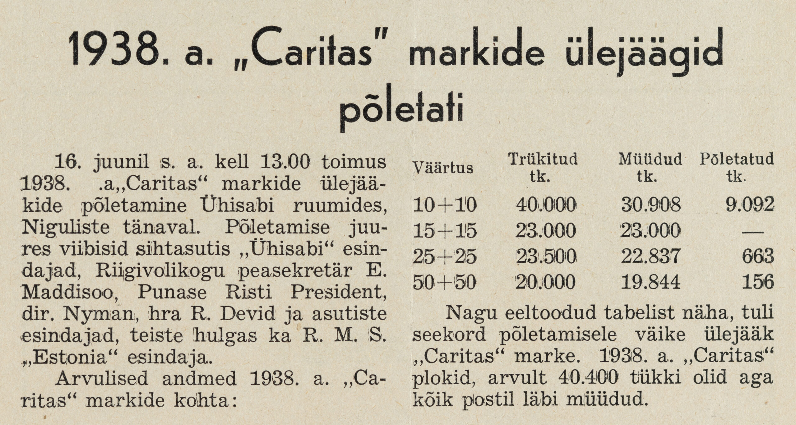 Oktoobris 1936 tuli „Ühisabilt“ selline teade: „17. septembril s.a. Ühisabi koosolekul otsustati Caritas markide ülejääk ära hävitada. Sellega tahetakse hoida üleval Eesti postmargi head nime ja Caritas margi head edu. Viimane samm on tehtud eriti arvestades korjajate huvidega, kes suurel määral on marke ostnud ja kelle otsekohestes huvides on margi hinna püsimine. Peale nimetatu on Ühisabi saavutanud kokkuleppe Postivalitsusega selles, et järgmine seeria Caritas marke saab trükitud märksa vähemal hulgal. Esimest väärtust 80 000 marki ja järgmisi 50 000. Sellega saavad ära hoitud markide ülejäägid ja filatelistidele on kindlustatud markide ostuks väljaantud kulutused.“ (Rahvusvahelise margikogujate seltsi ajakiri Estonia nr 14, 20.10.1936, lk 9)