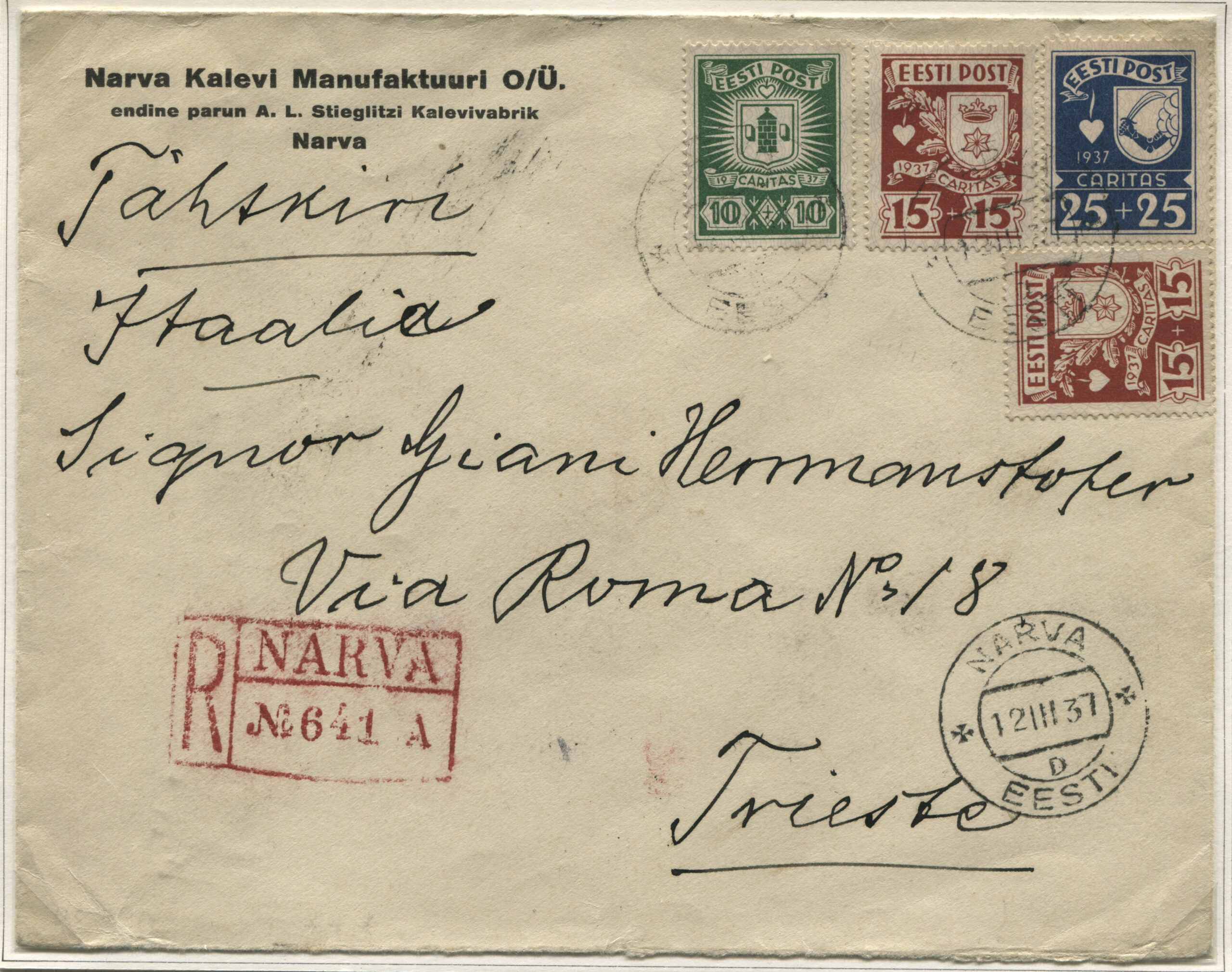 ErakoguTähitud kiri, saadetud Narvast 12.03.1937 Triestesse (Itaalia) 16.03.1937. Narva Kalevi Manufaktuuri O/Ü ümbrik.