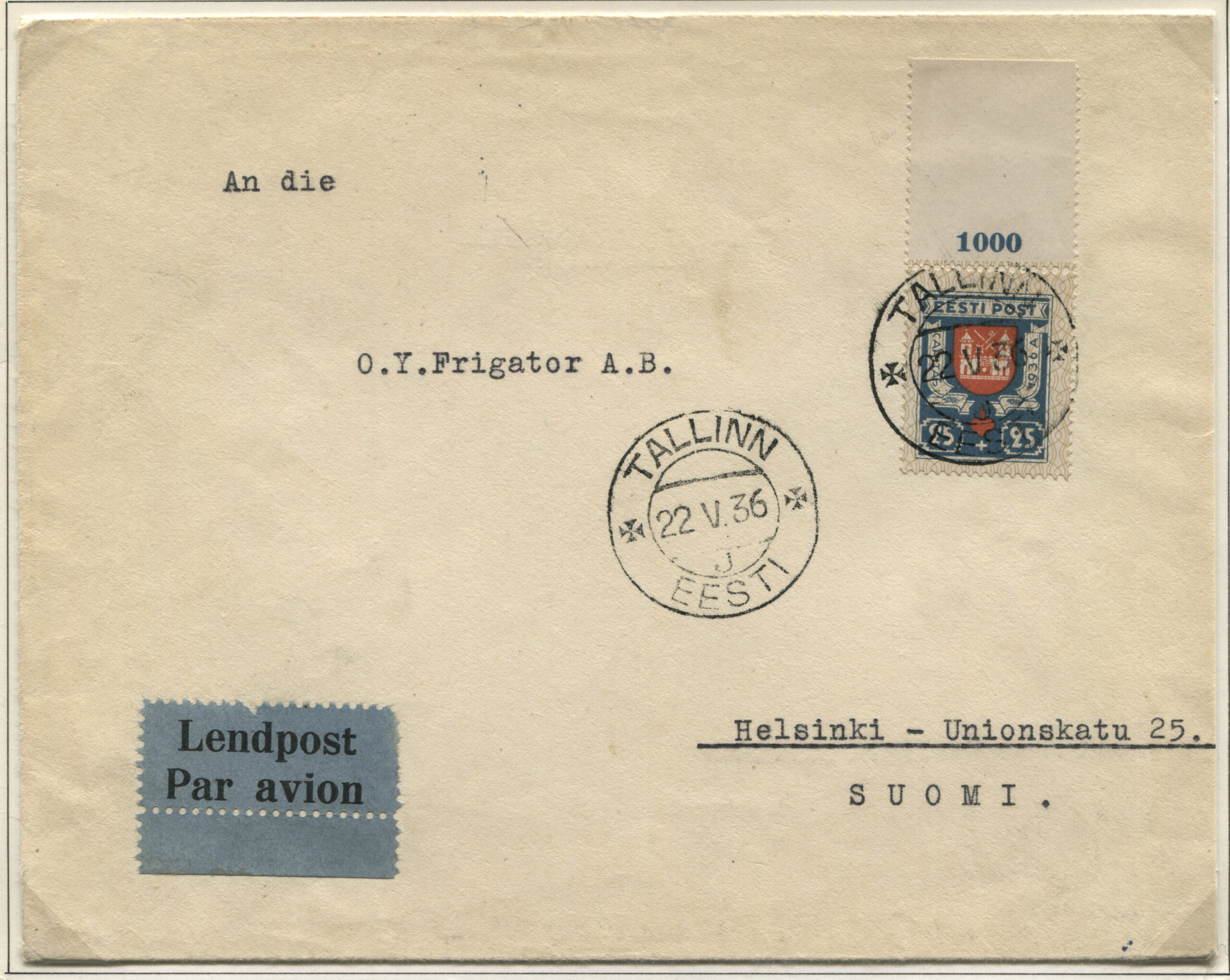ERMi koguTähitud õhupostikiri Tallinnast 6.02.1937 Helsingisse 8.02.1937.