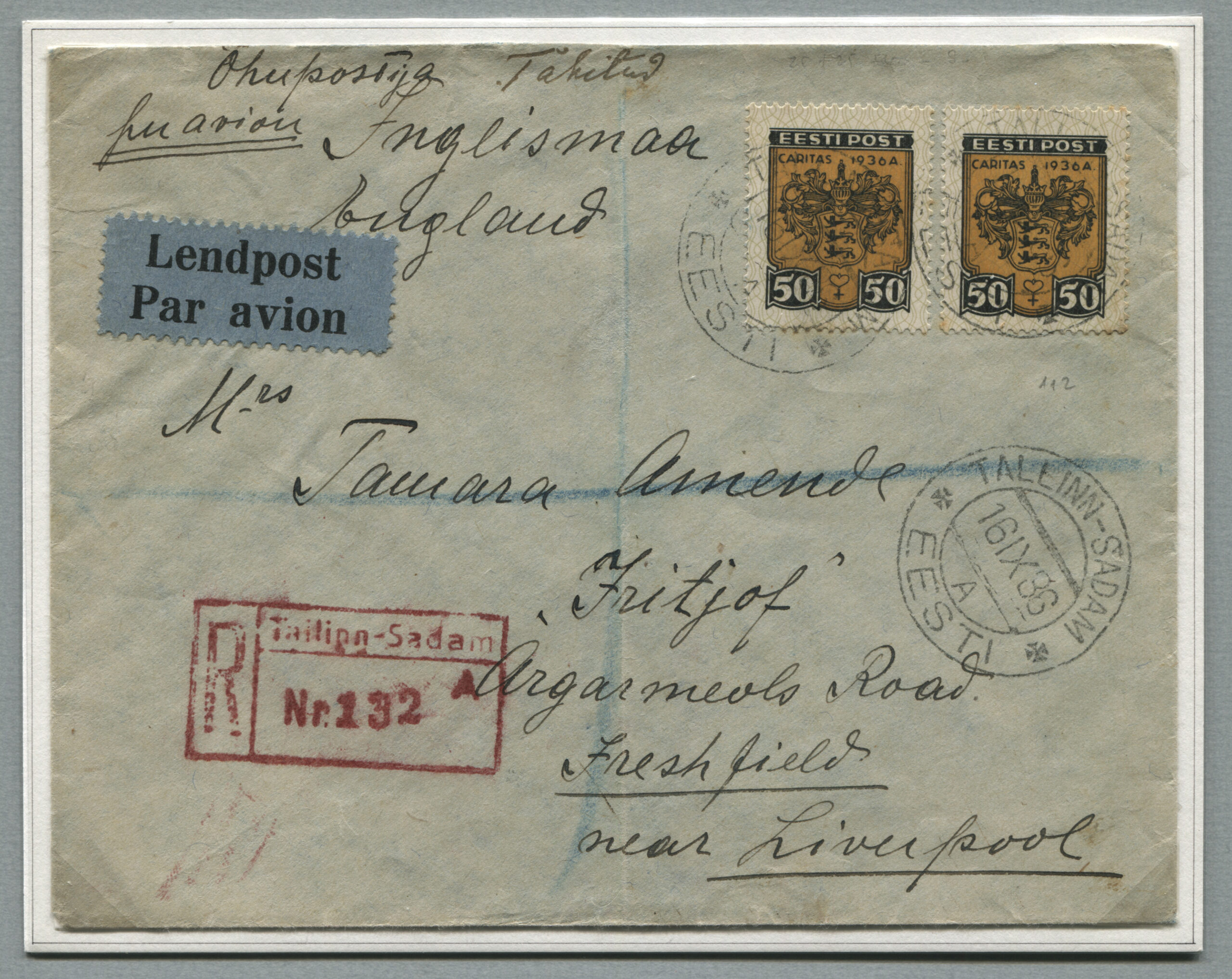 ERMi koguTähitud õhupostipostikiri, saadetud Tallinnast 16.09.1936 Liverpooli