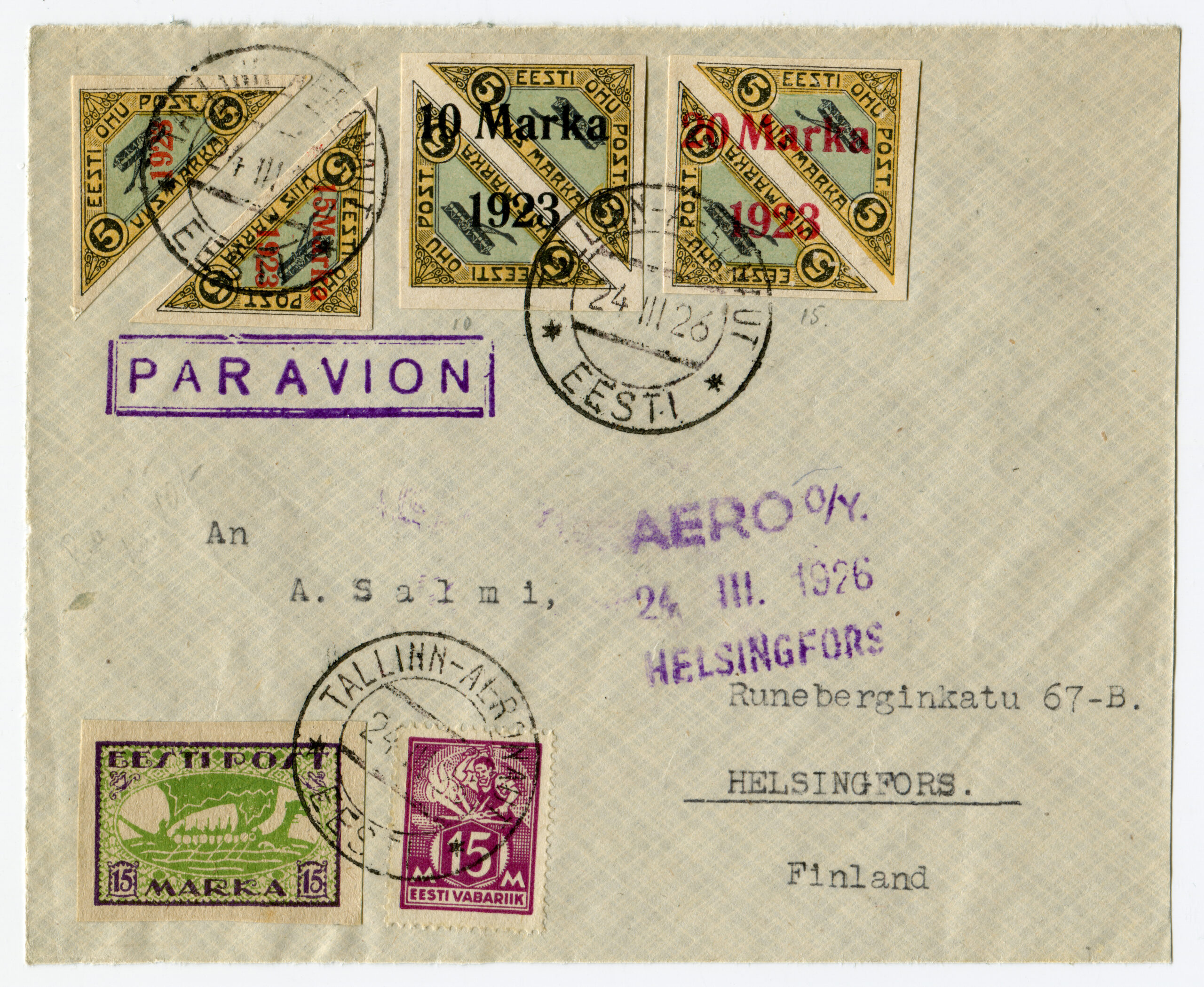 Oktoobrini 1923 oli lennupostiühendus Tallinna ja Helsingi vahel juhuslik. 1. oktoobril 1923 avati aga korrapärane lennuühendus Tallinna-Helsingi ja Tallinna-Riia vahel, kust oli ühendus ka Königsbergiga. Samal päeval võeti kasutusele varem ilmunud õhupostimargid hinna ületrükiga 5, 10, 15, 20 või 45 marka.