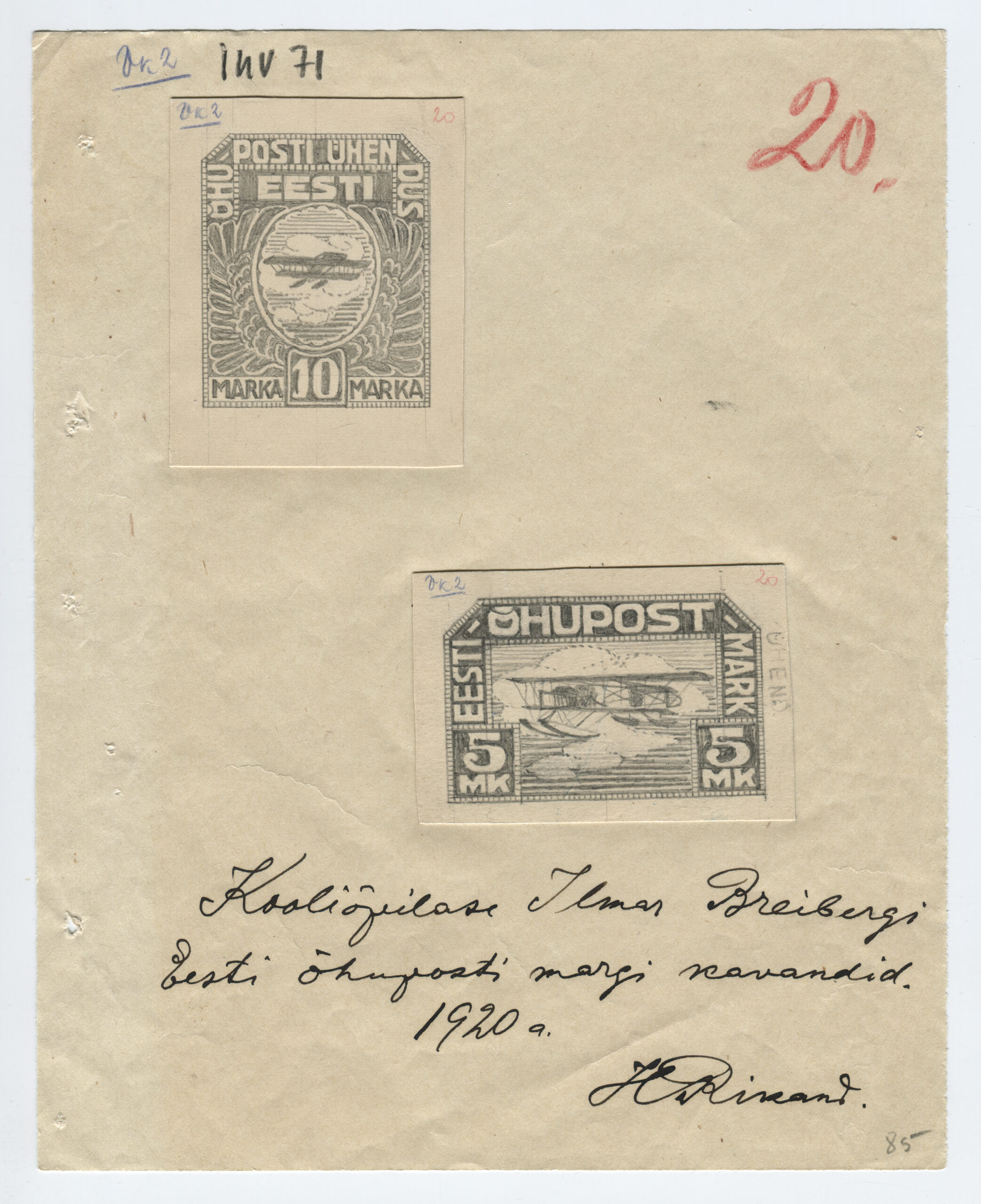 Eesti Postipeavalitsuse ülem Hindrek Rikandi on öelnud ajakirjanikele veebruaris 1920 nii: „Postivalitsus leidis vajaliku olevat valitsusele esitada õhuposti sisseseadmise projekt. Kui see kinnitatakse, tulevad kasutusele õhupostimargid. Kolmnurksed, lõigatud servadega, keskel lennuki kujutis, tekst „Eesti õhupost“ ja maksavad 5 marka.“