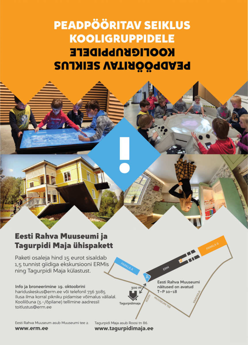 Külastus sisaldab ERMi 1,5-tunnist külastust koos giidiga ning Tagurpidi maja külastust. Hind 15€/õpilane.