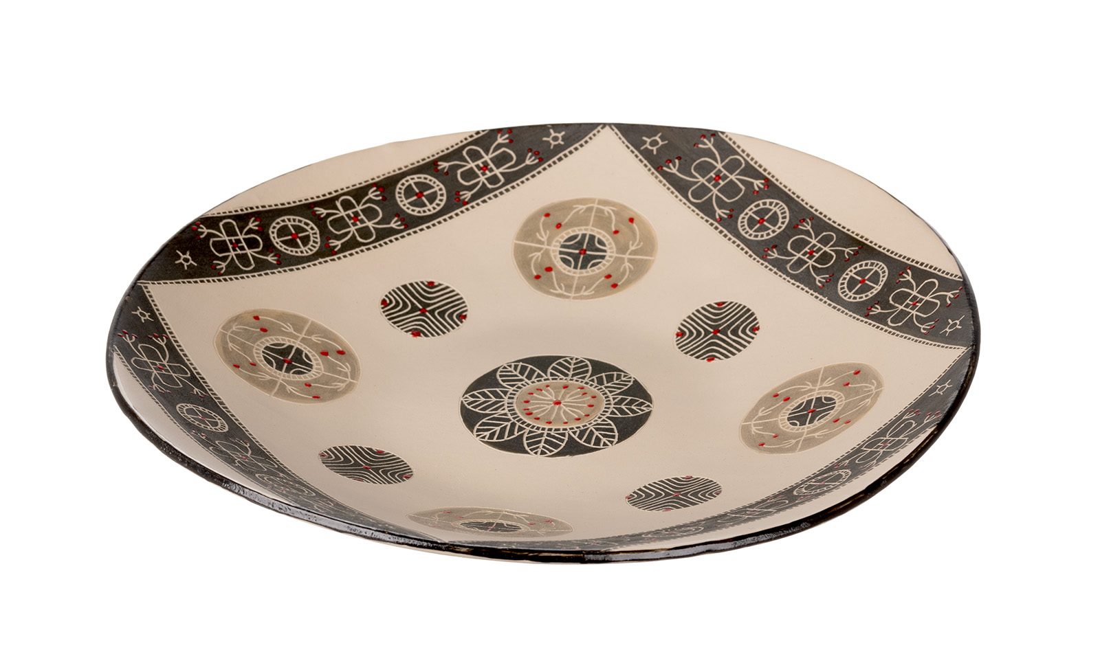 Arhailise tikandiga kaunistatud savist vaagen on valmistatud käsitööna Mulgi Savikojas.