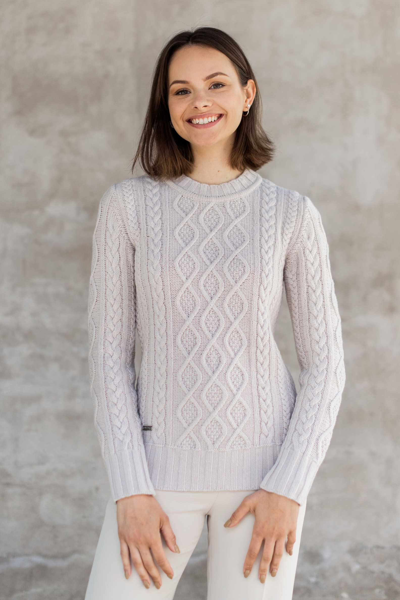 O-kaelusega keskmise paksusega soe ja pehme meriinovillane kampsun. Terve kampsuni koemuster on kokku kombineeritud erinevatest koemustritest ja palmikutest.
