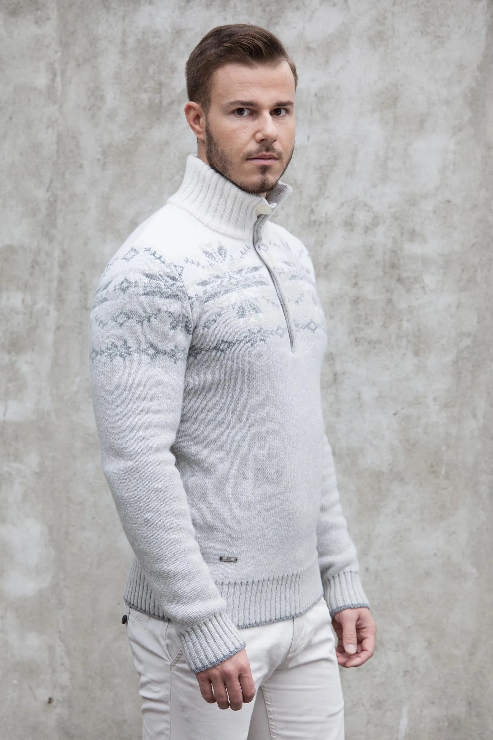Kõrge krae ja nööbikinnisega pehme täisvillane helehall meeste kampsun. Kampsun on kootud kahekordse koega, mis teeb ta mõnusalt pehmeks. Nööbikinnis on viie nööbiga. Kampsuni alumine osa on helehall, ülaosa loodusvalge. Varrukasuu ja allääre otsa laiem triip on kootud praktilise halli värviga.