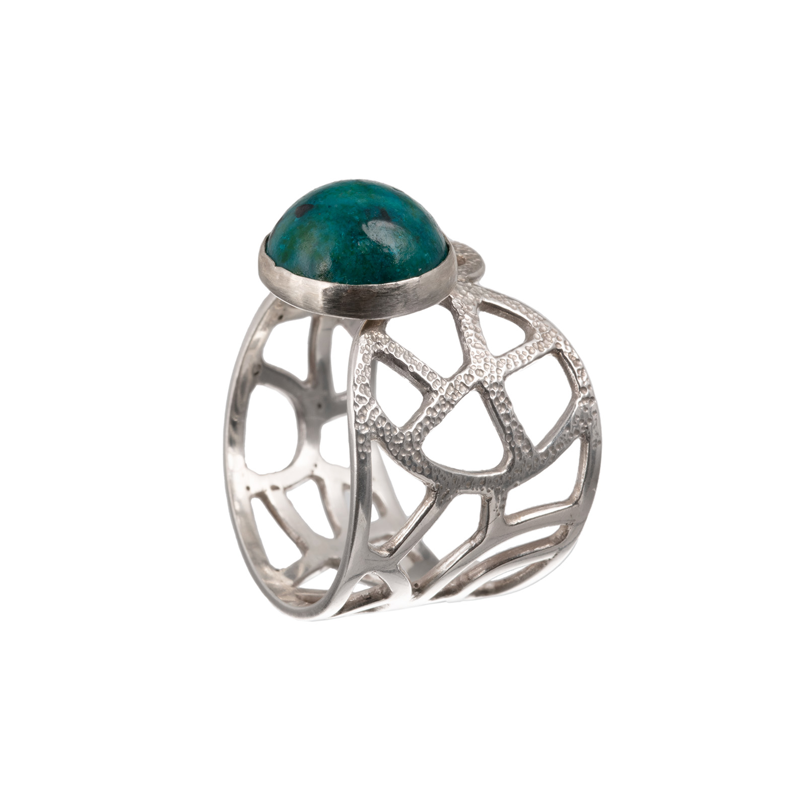 Sõrmust kaunistab sünteetiline krüsokolla.
