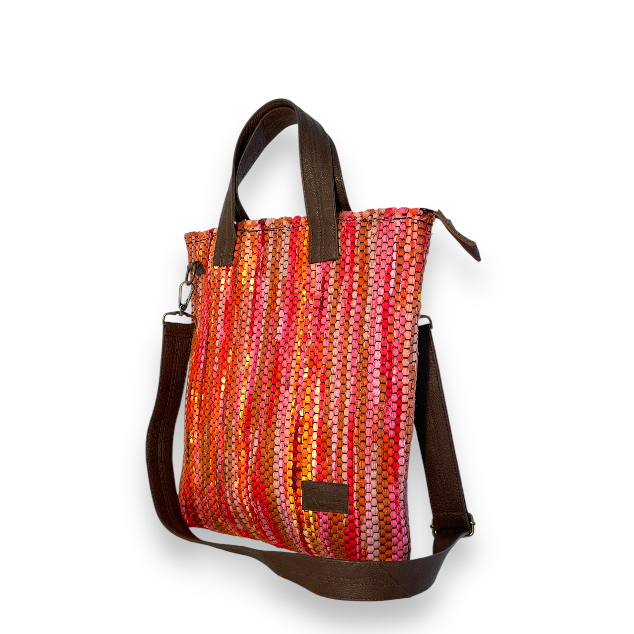 Kangastelgedel kootud koti kangas on oran?i- punase kirju ja koti nahast detailid on pruunid. Koti valmimiseks kasutatud kangas pärineb tarbijajärgsest tekstiilijäägist ja nahk pärineb mööblitootmisest tekkivast jäägist.