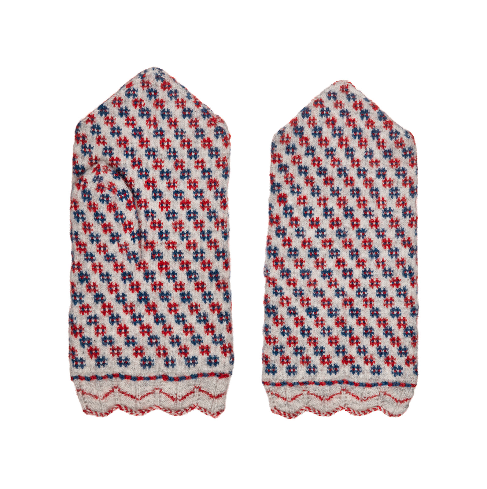 Eesti traditsiooniliste kinnaste eeskujul ja ainetel käsitsi kootud kindad.