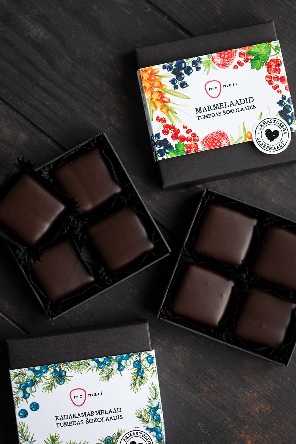 MoMari marmelaadid valmivad käsitööna puhtast marjapüreest ja on kaetud tumeda Belgia šokolaadiga.